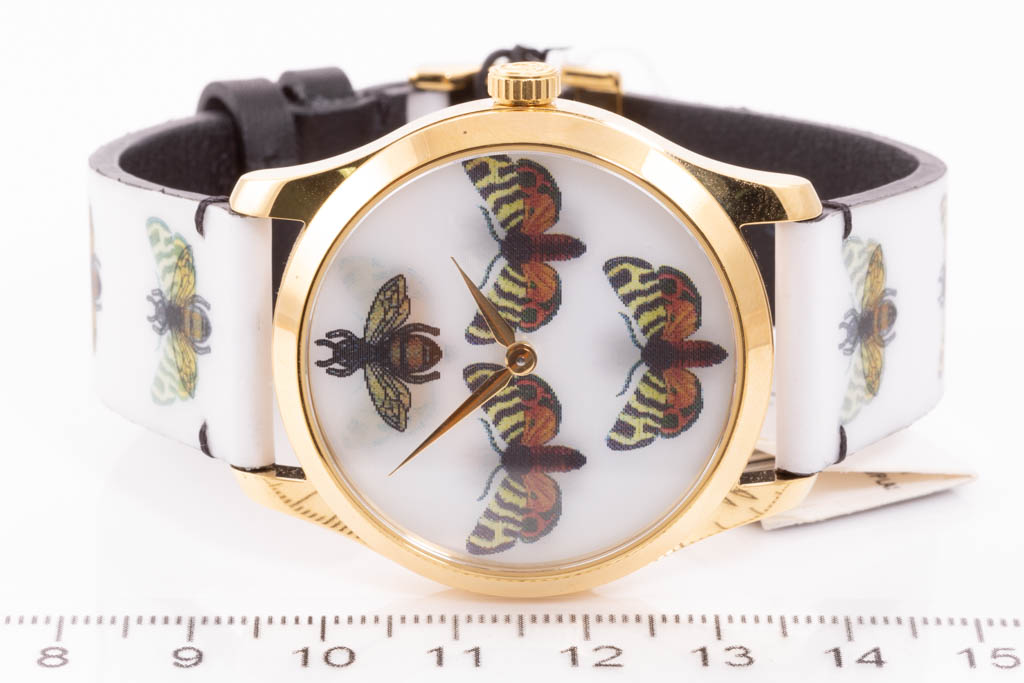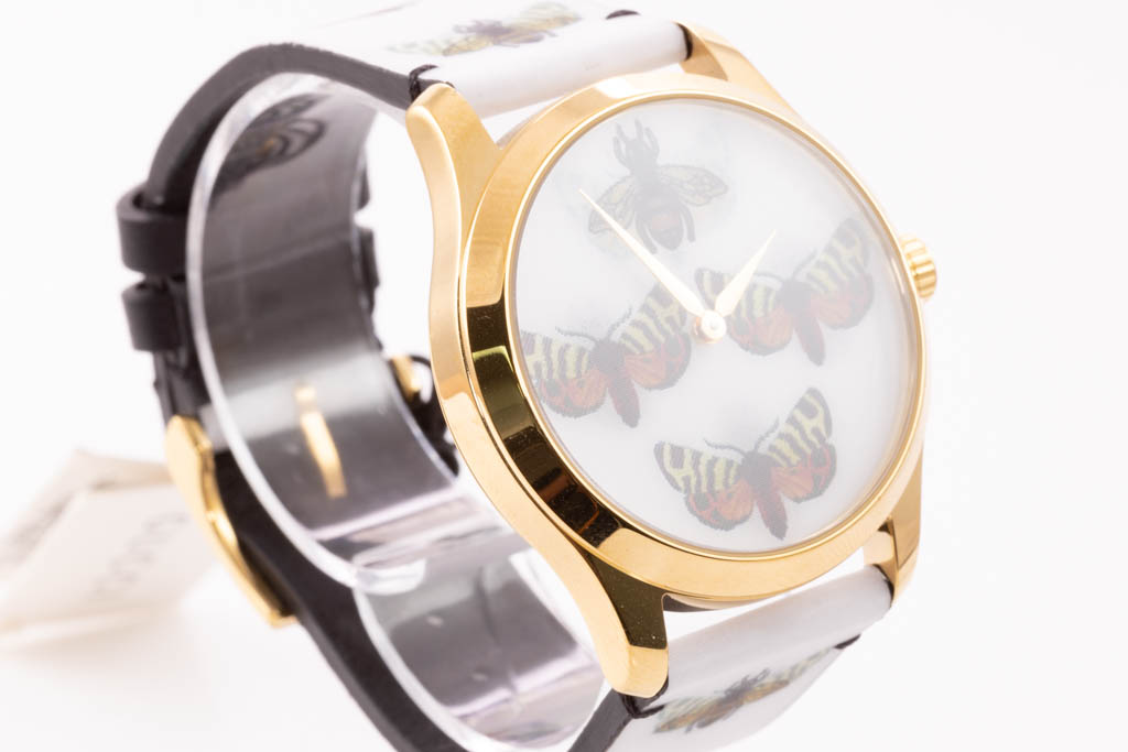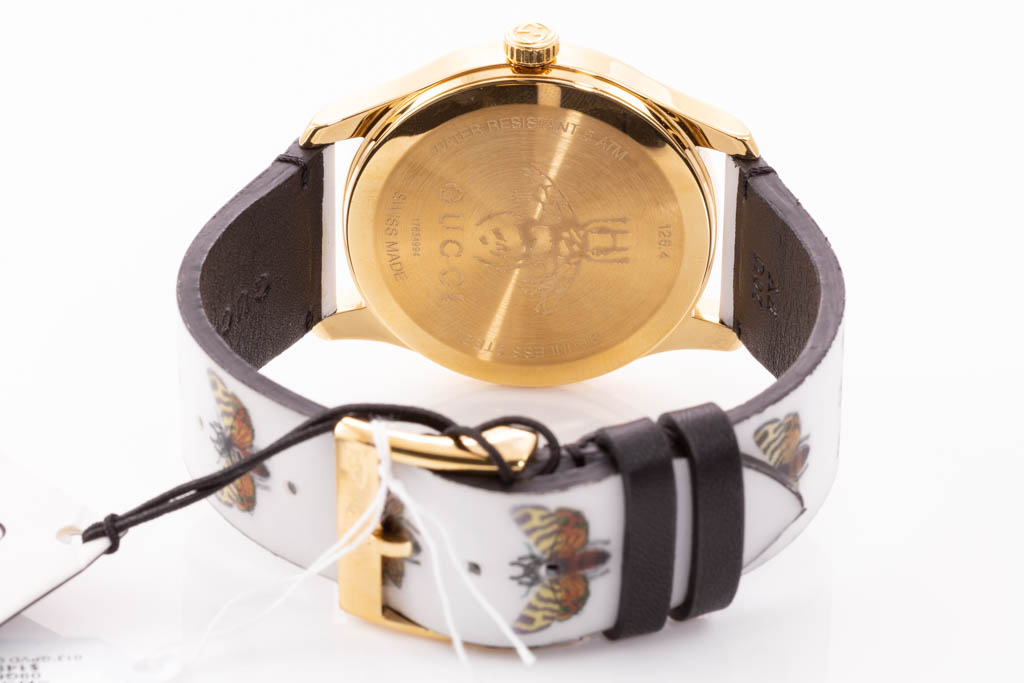 Gucci G-Timeless yellow gold PVD and stainless steel quartz ladies watch. Bee and butterfly motifs white dial, case diameter: 38mm, strap length: 20cm, Swiss made. Ref# YA1264109. With Gucci bee and butterfly motifs white leather strap and buckle. 3 month FSA warranty. No box provided. (As new, NOTE: minor scratches on watch case and wear on strap due to being display stock)