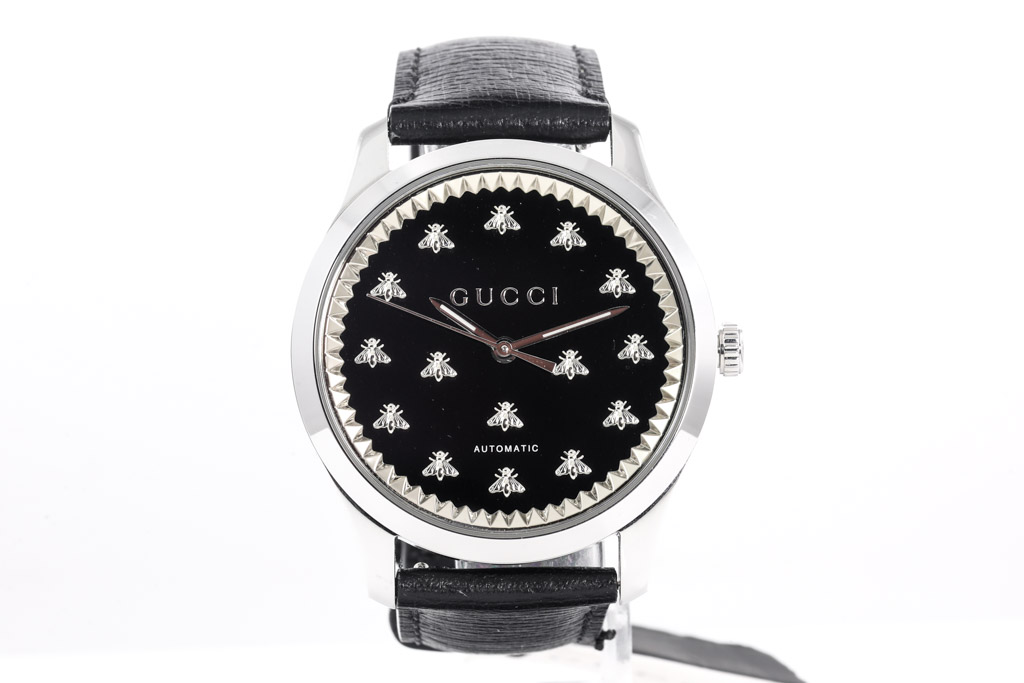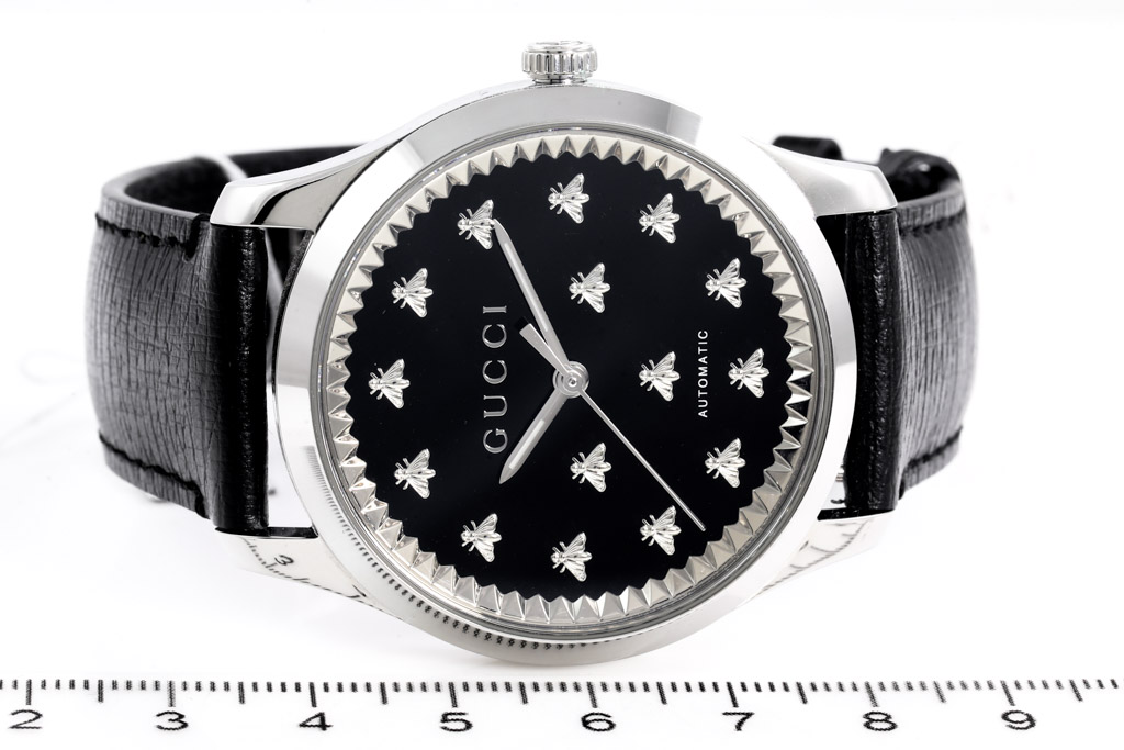 Gucci G-Timeless stainless steel automatic mens watch. Black Onyx dial with bee motif indicators, case diameter: 42, adjustable max wrist size: 18cm, Swiss made. Ref# YA126286. With Gucci black leather strap and clasp. 3 month FSA warranty. With International Warranty Certificate - the certificate is not stamped so Gucci warranty does not apply. (As new, NOTE: minor scratches on case and wear on strap due to being display stock)