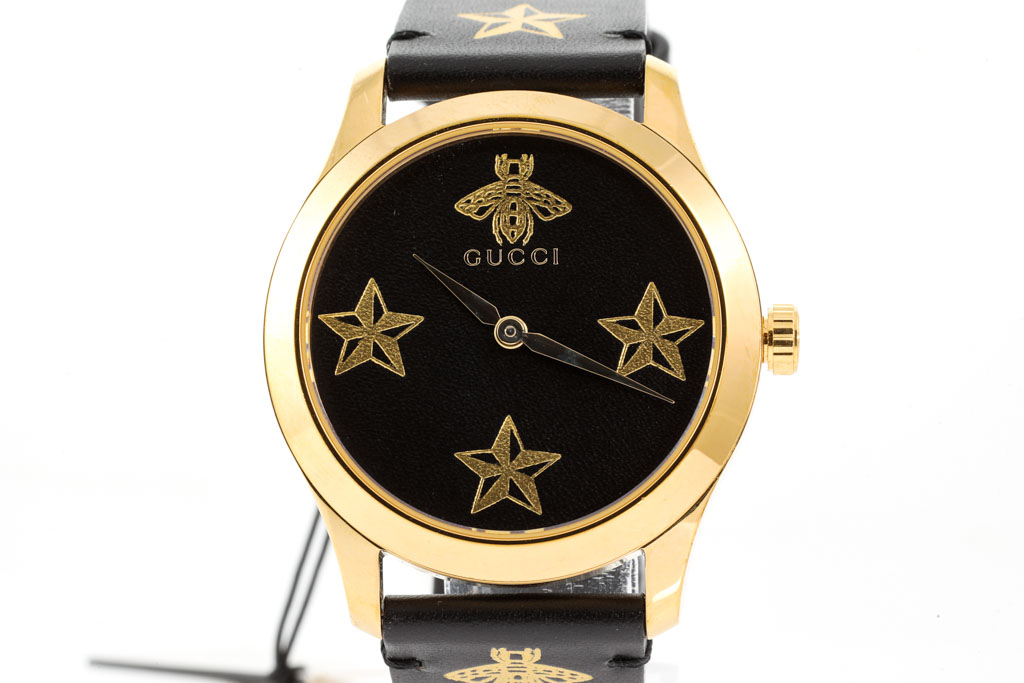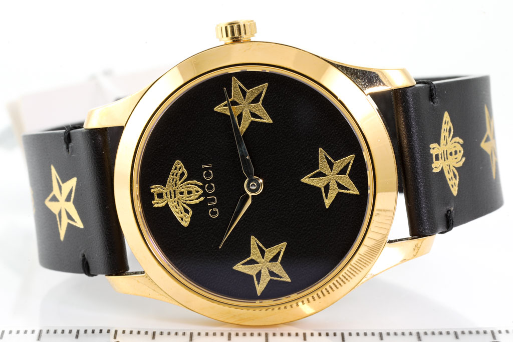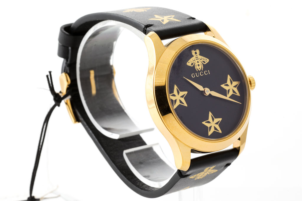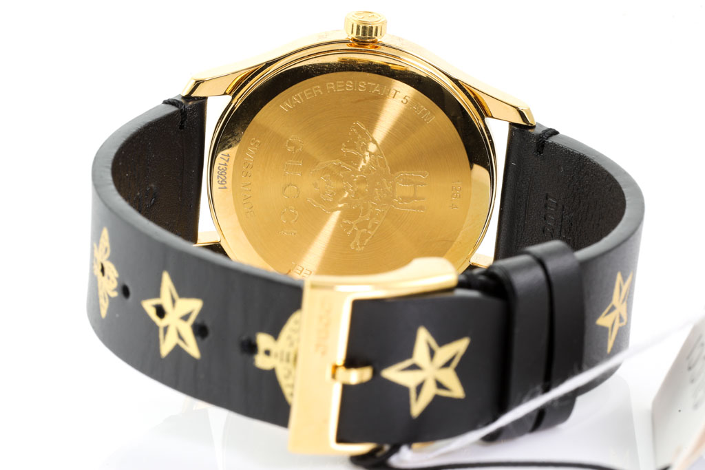 Gucci G-Timeless yellow gold PVD stainless steel quartz watch. Star and bee motif black dial, case diameter: 38mm, strap length: 20cm, Swiss made. Ref# YA1264055. With Gucci black leather strap and buckle. With Gucci International Warranty Booklet - the booklet is not stamped so the Gucci warranty does not apply. 3 month FSA warranty. With Gucci box. (As New, NOTE: minor scratches on case and wear on strap due to being display stock)