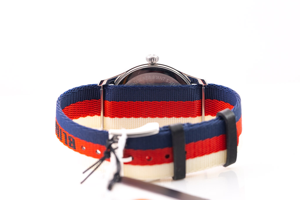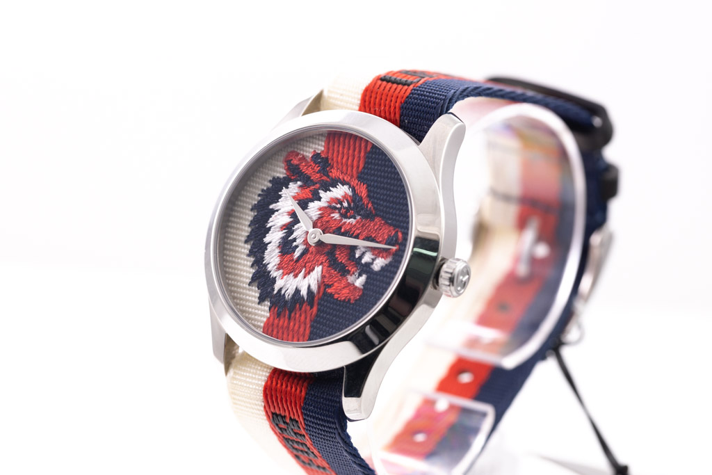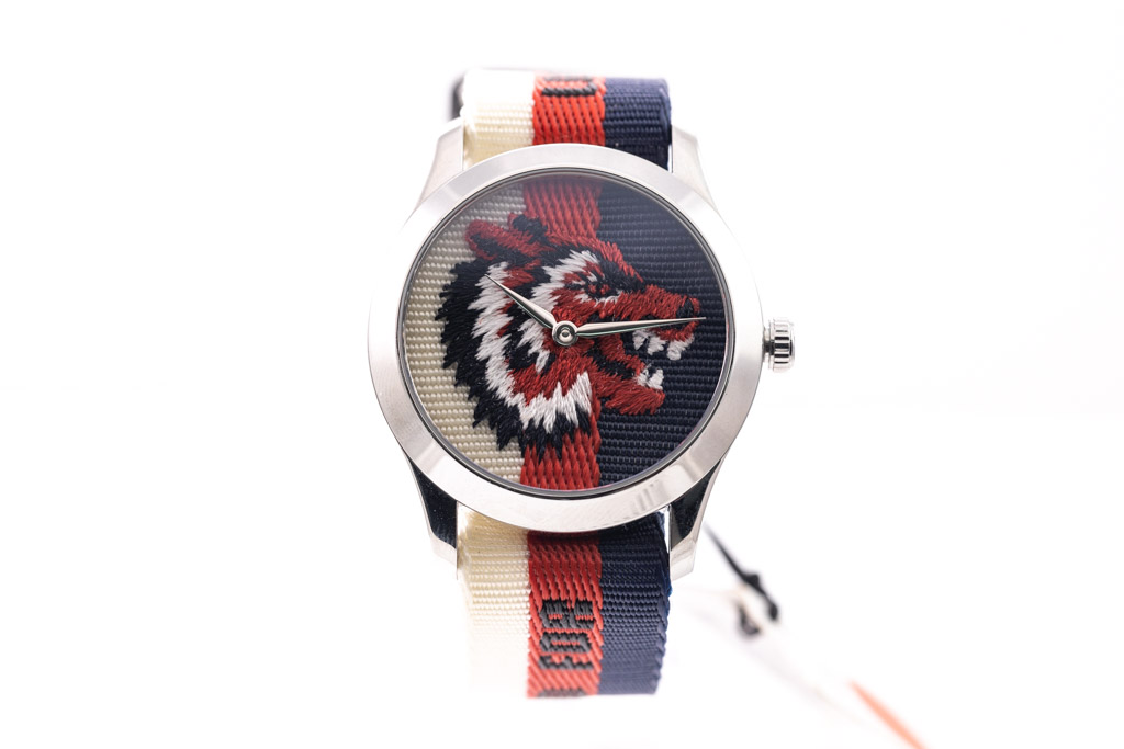 Gucci G-Timeless stainless steel quartz watch. Nylon tri-coloured wolf motif dial, case diameter: 38mm, strap length: 19.5cm, Swiss made. Ref# YA1264059. With Gucci tri-coloured nylon strap and buckle. No box provided. 3 month FSA warranty. (As new, NOTE: minor scratches on watch case and light wear on strap due to being display stock)