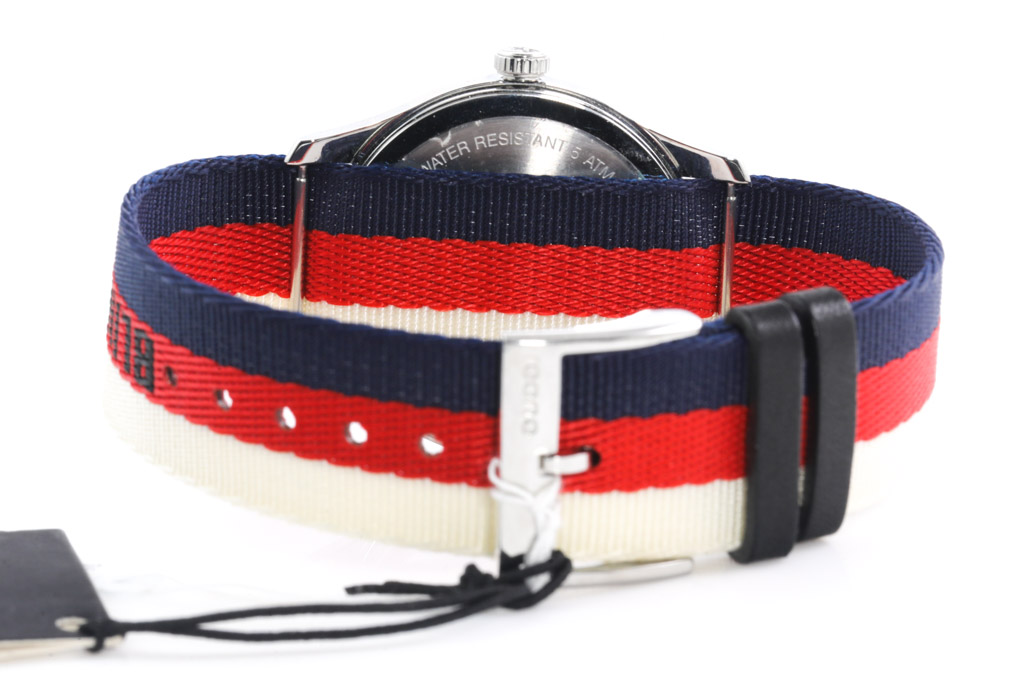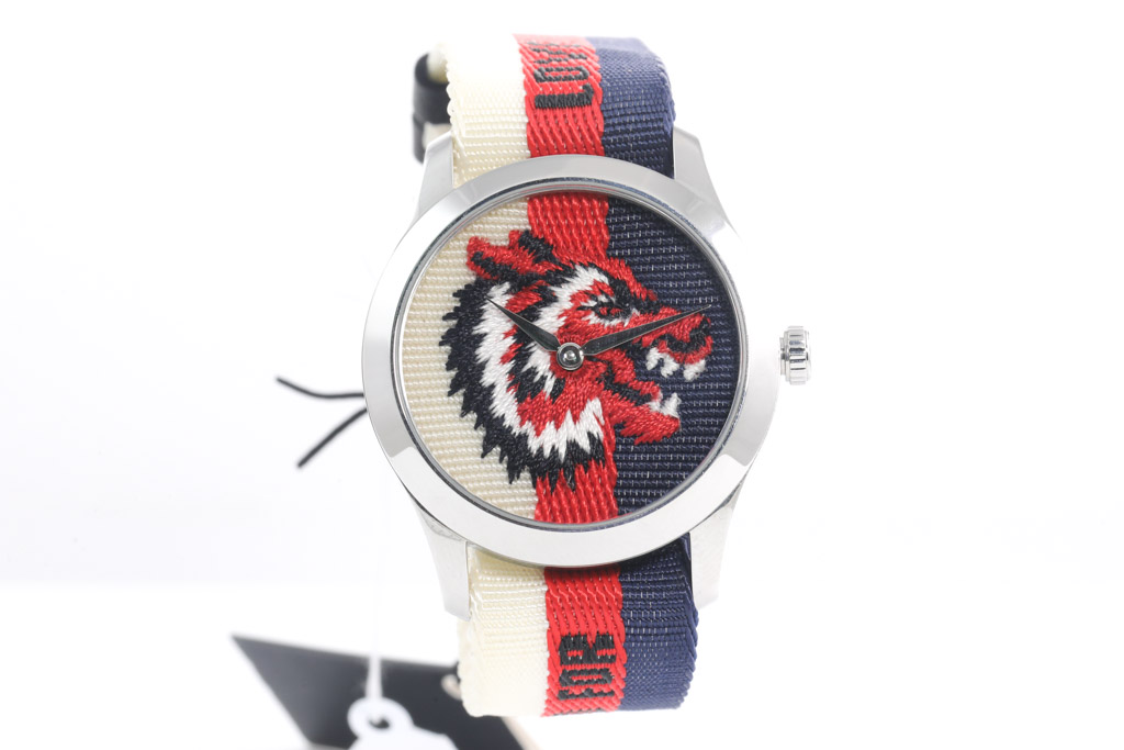 Gucci G-Timeless stainless steel quartz ladies watch. Nylon with Wolf Motif dial, case diameter: 38mm, wrist size: 19.5cm, Swiss made. Ref# YA1264059. With Gucci nylon tri-colour strap and buckle. No box provided. 3 month FSA warranty. (As new, NOTE: minor scratches on watch case and light wear on strap due to being display stock)