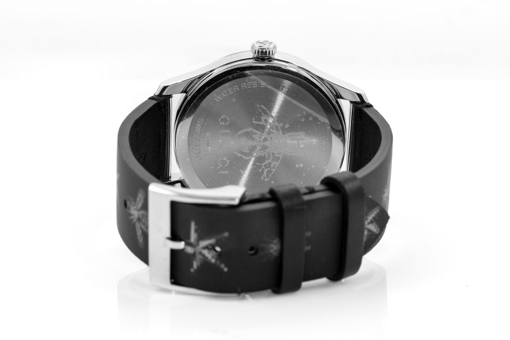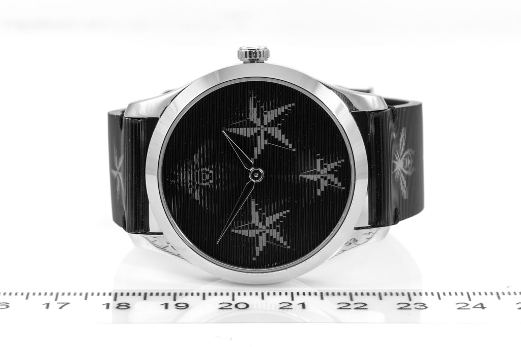 Gucci G-Timeless stainless steel quartz ladies watch. Black star print dial, case diameter: 38mm, strap length: 18.5cm, Swiss made. Ref# YA1264105. With Gucci bee and star print black leather strap and buckle. With Gucci International Warranty Certificate - the certificate is not stamped so the Gucci warranty will not apply. With Gucci box. 3 month FSA warranty. (As New, Note: minor scratches on case and light wear on strap due to being display stock)