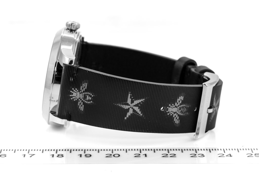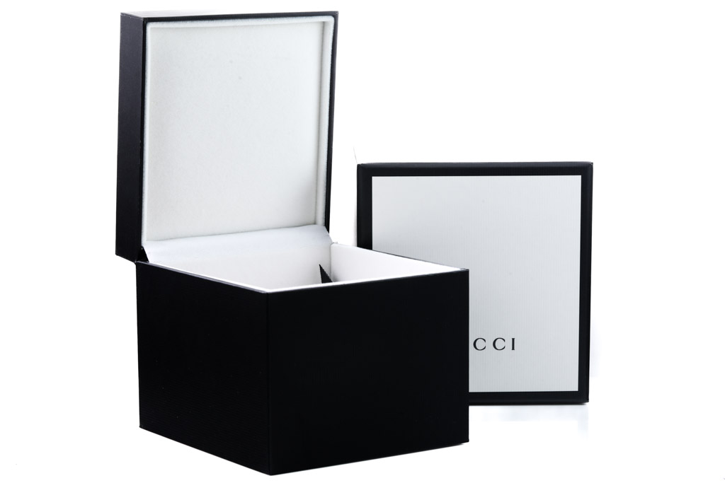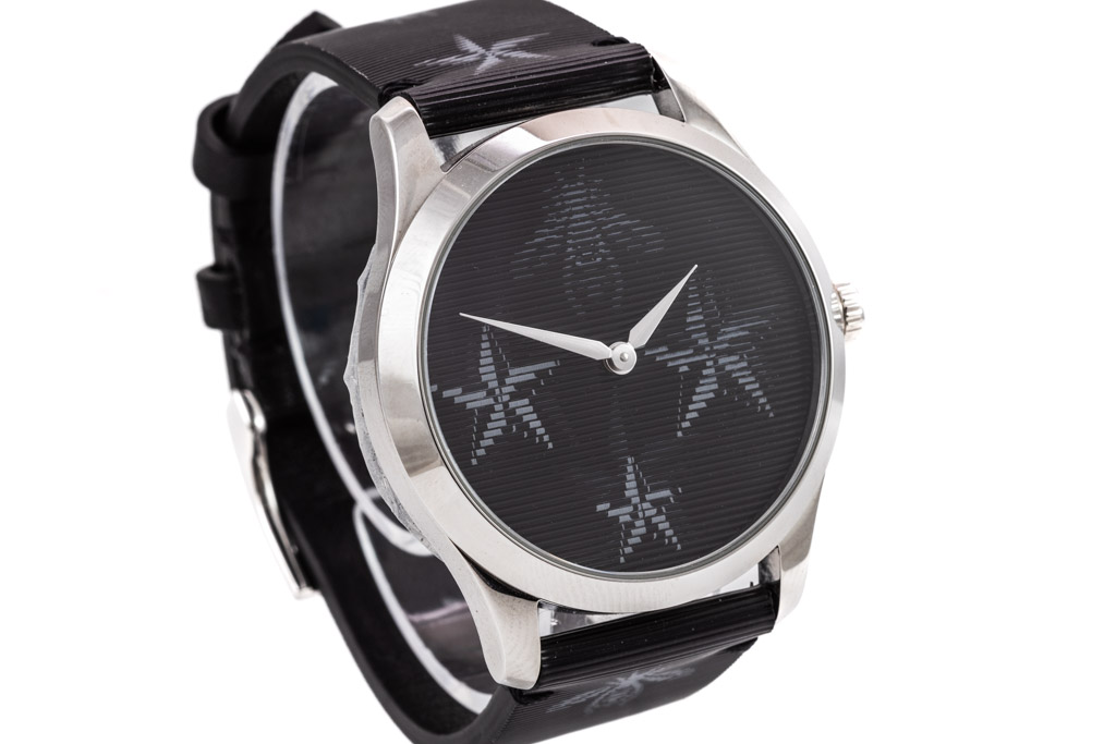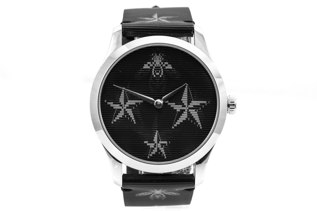 Gucci G-Timeless stainless steel quartz ladies watch. Black star print dial, case diameter: 38mm, strap length: 18.5cm, Swiss made. Ref# YA1264105. With Gucci bee and star print black leather strap and buckle. With Gucci International Warranty Certificate - the certificate is not stamped so the warranty will not apply. With Gucci box. 3 month FSA warranty. (As New, Note: minor scratches on case and light wear on strap due to being display stock)