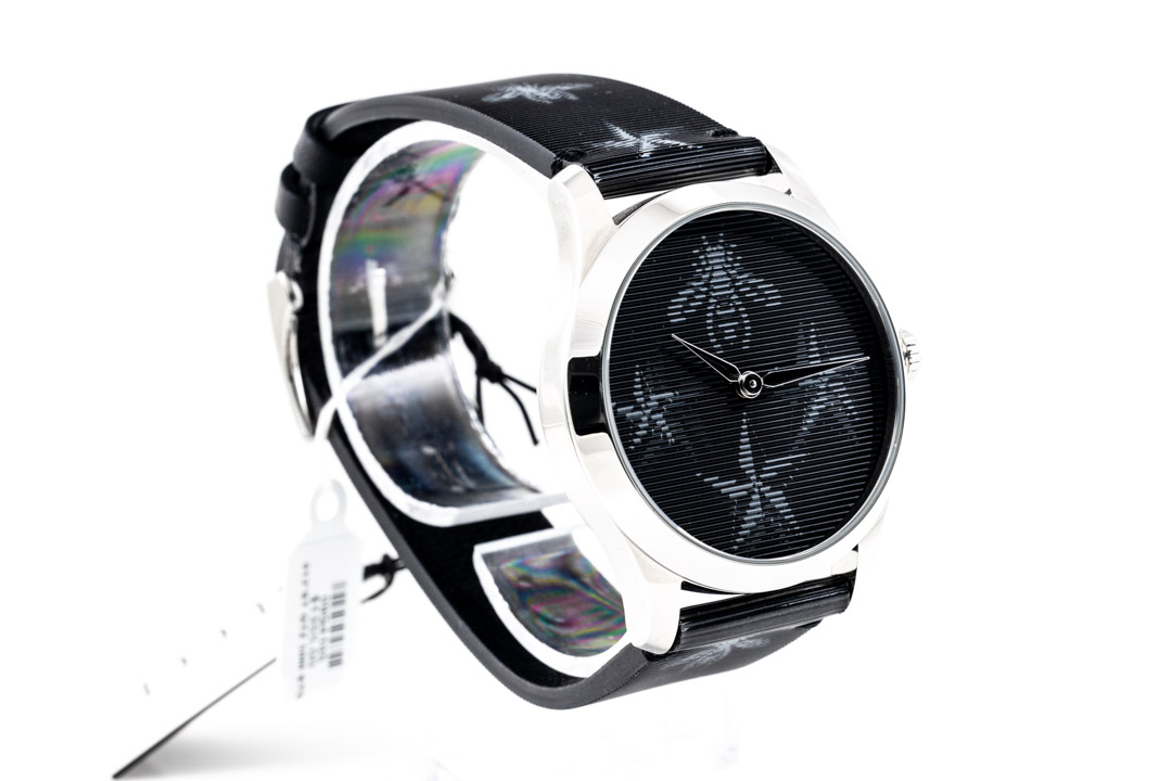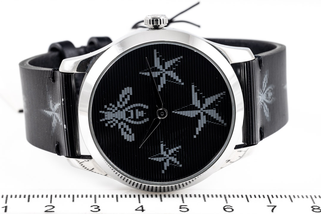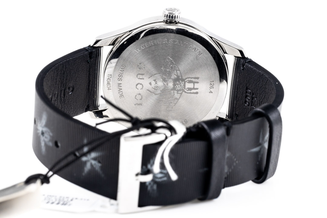 Gucci G-Timeless stainless steel quartz ladies watch. Black star and bee print dial, case diameter: 38mm, strap length: 20cm, Swiss made. Ref# YA1264105. With Gucci bee and star print black leather strap and buckle. With Gucci International Warranty Booklet - the Booklet is not stamped so the Gucci warranty does not apply. 3 month FSA warranty. (As New, Note: minor scratches on case and light wear on strap due to being display stock)