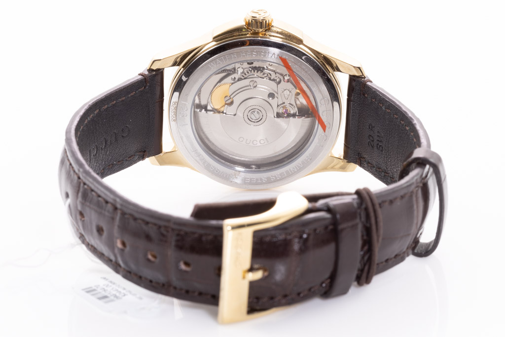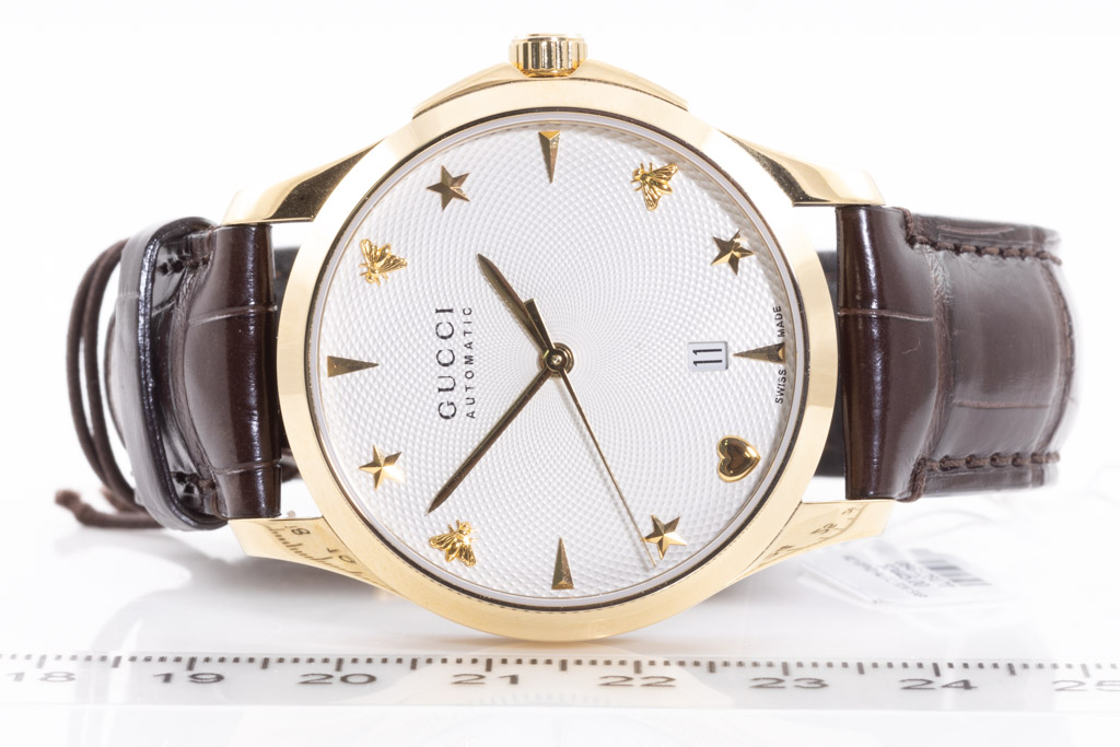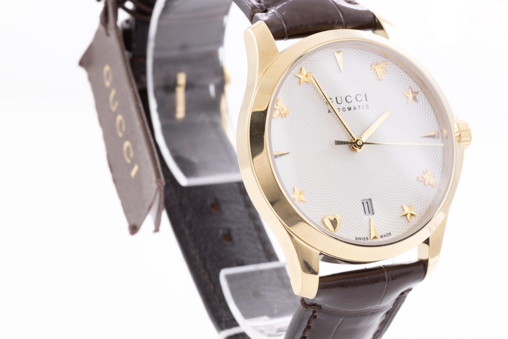 Gucci G-Timeless yellow gold PVD stainless steel automatic watch. Silver dial, date, case diameter: 38mm, strap length: 21cm, Swiss made. Ref# YA126470. With Gucci brown leather strap and buckle. With Gucci International Warranty Certificate card - the card is not stamped so the Gucci warranty does not apply. With Gucci box. 3 month FSA warranty. (As New, Note: minor scratches on case and light wear on strap due to being display stock)