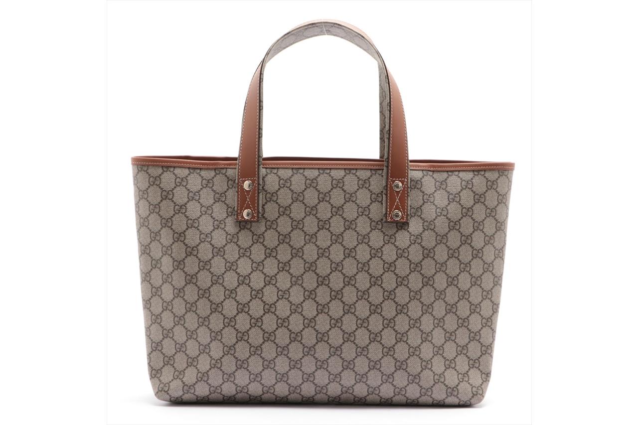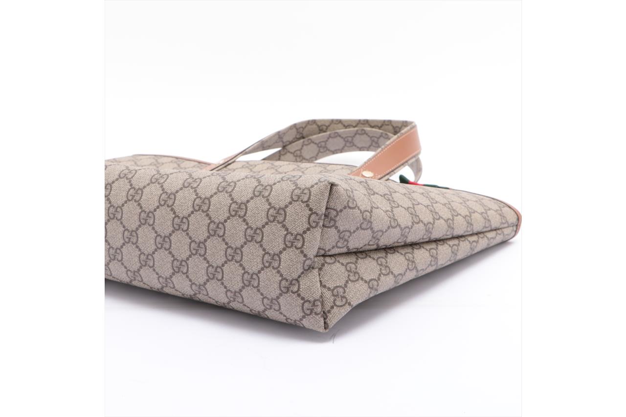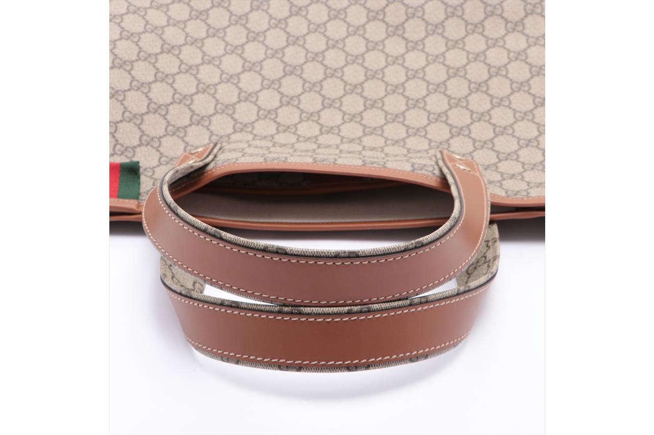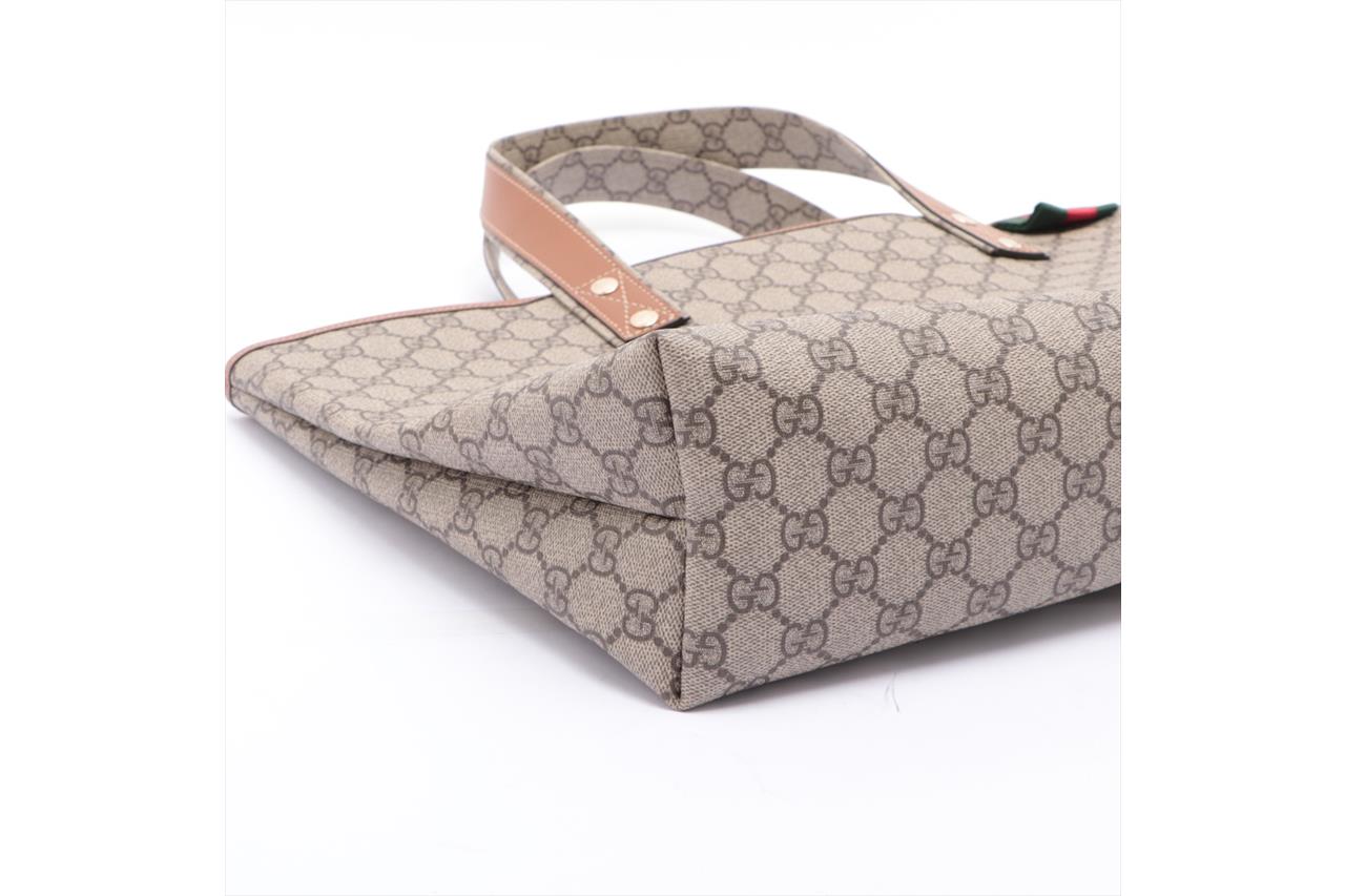 Gucci GG Coated Canvas Beige Tote Bag. Signature supreme web loop exterior. Gold-tone hardware. Smooth brown leather trim. Approximate dimensions: 37cm (L) x 28cm (H) x 11cm (D) and 18cm handle height. Made in Italy. With Entrupy Certificate of Authenticity. (Pre-owned)