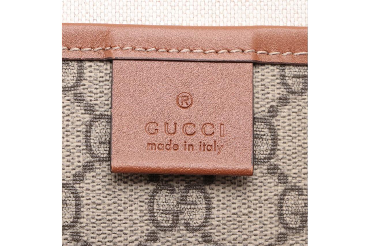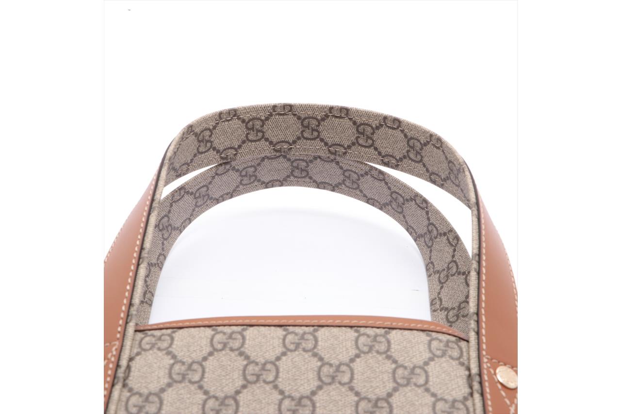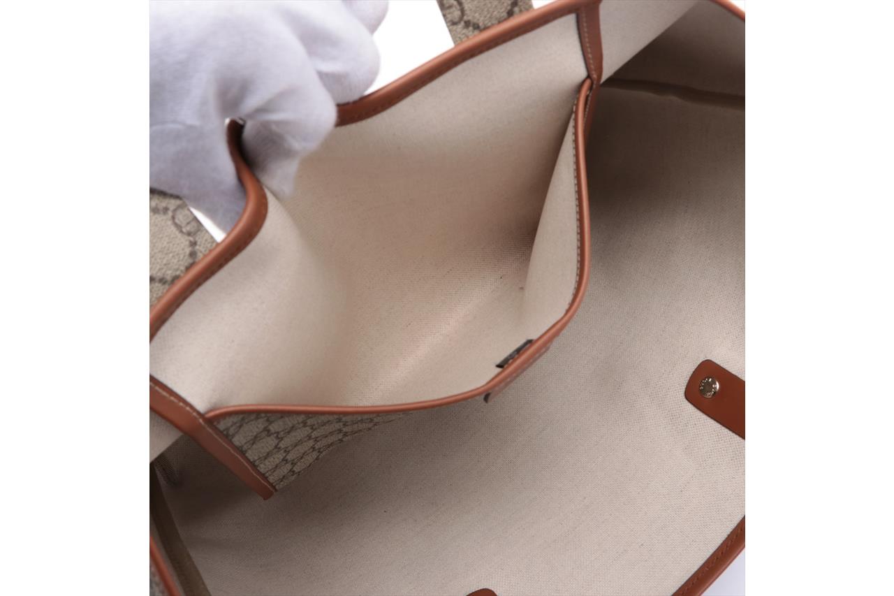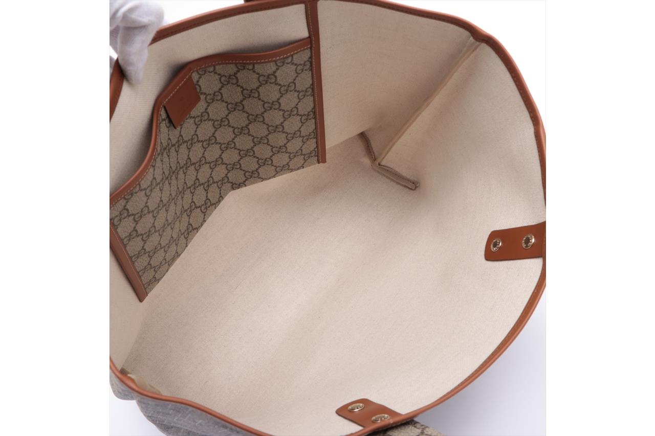 Gucci GG Coated Canvas Beige Tote Bag. Signature supreme web loop exterior. Gold-tone hardware. Smooth brown leather trim. Approximate dimensions: 37cm (L) x 28cm (H) x 11cm (D) and 18cm handle height. Made in Italy. With Entrupy Certificate of Authenticity. (Pre-owned)