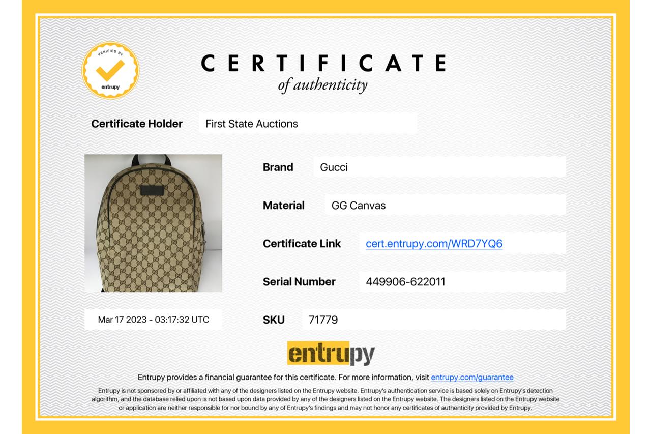 Gucci travel backpack in Gucci GG Monogram printed canvas. Featuring brown leather trim, silver-toned hardware, brown fabric handles and the adjustable fabric shoulder straps. The top 2way zippers open to a dark brown fabric-lined interior with a zipper pocket. Approximate dimensions: 30cm(W) x 36cm(H) x 12cm(D), 9cm handle drop. Accompanied by Gucci dust bag. With Entrupy Certificate of Authenticity. (Pre-owned)