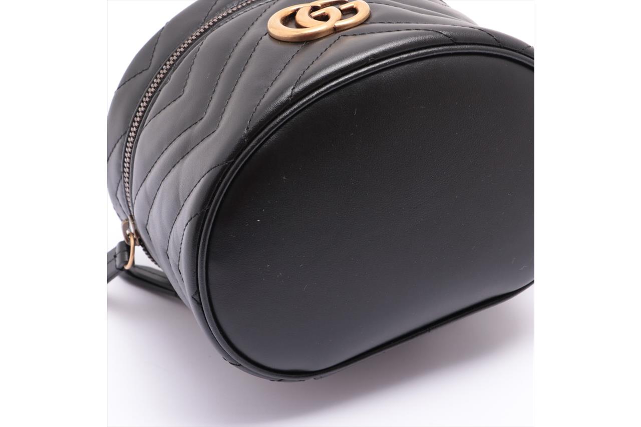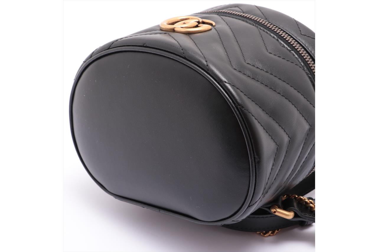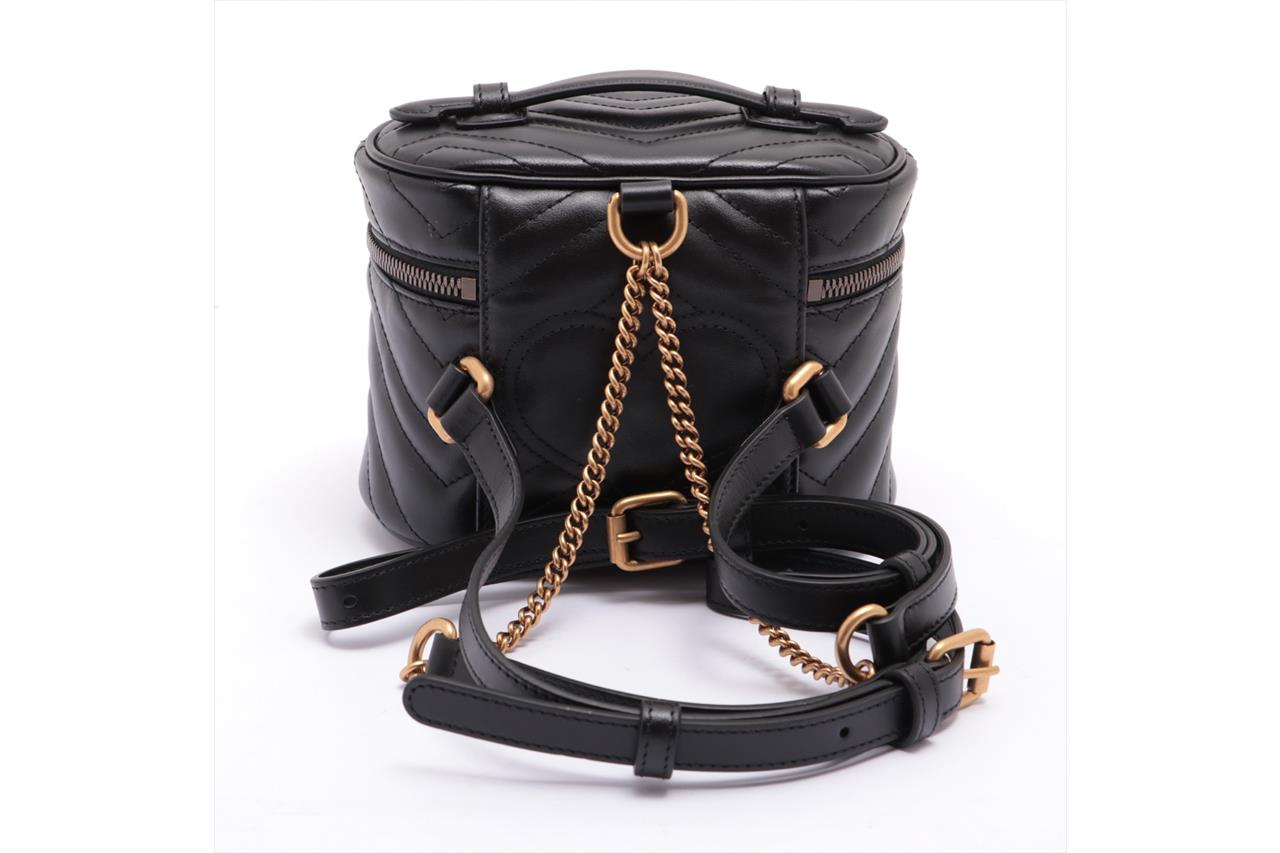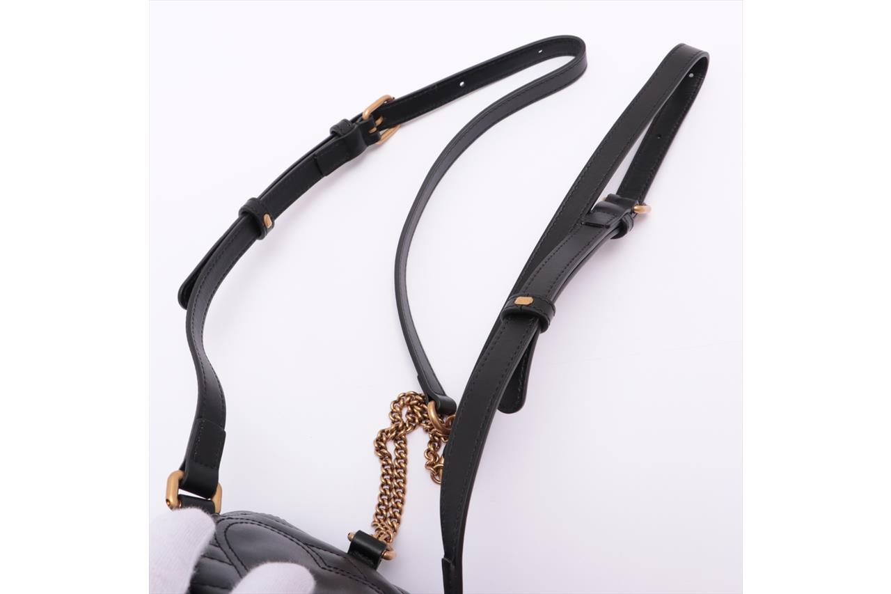 Gucci GG Marmont Backpack in Black Leather. Gold-tone hardware. Adjustable chain and leather shoulder straps. Approximate dimensions: 17cm (L) x 11cm (H) x 11cm(D). Accompanied by Gucci box and dust bag. With Entrupy Certificate of Authenticity. (Pre-owned)