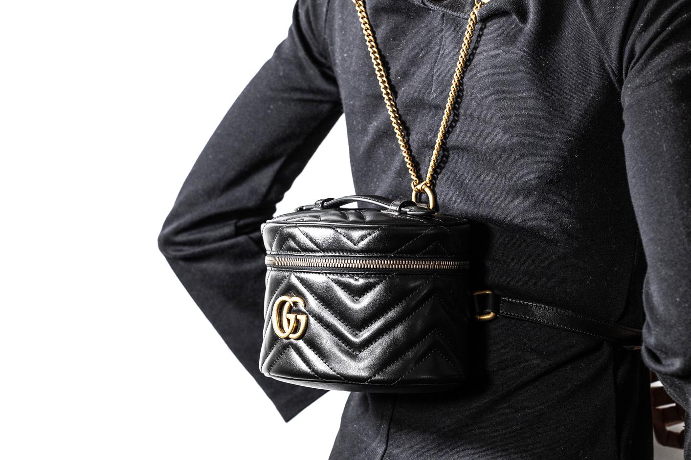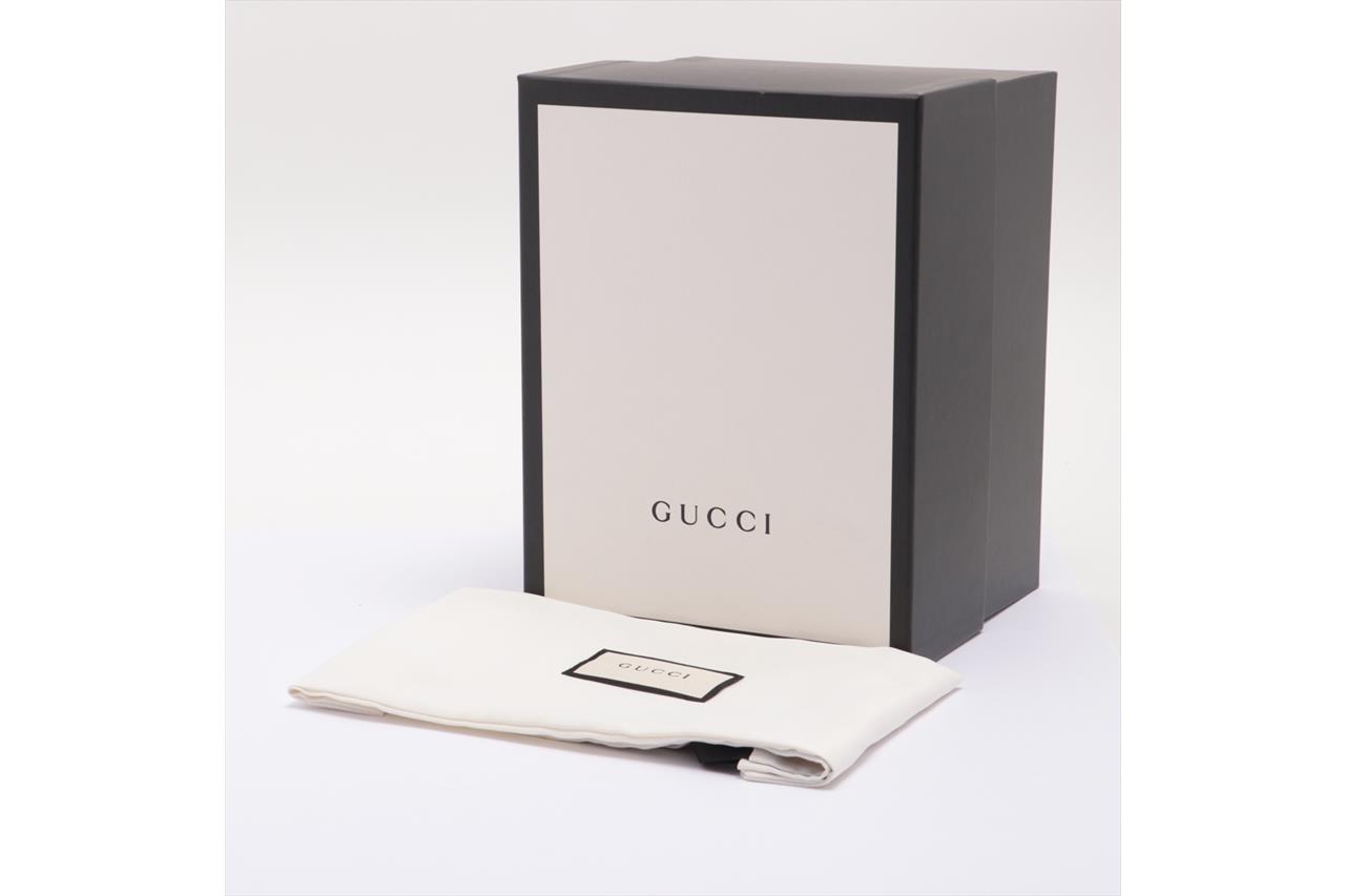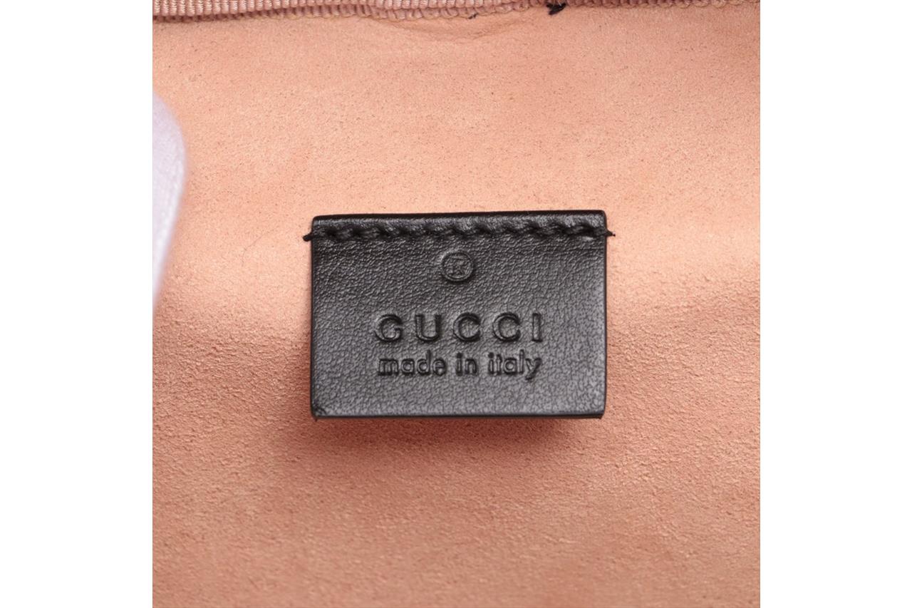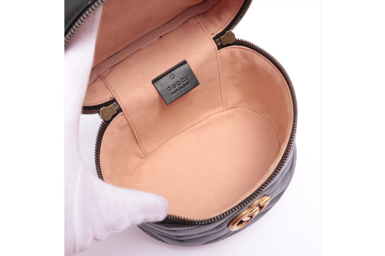 Gucci GG Marmont Backpack in Black Leather. Gold-tone hardware. Adjustable chain and leather shoulder straps. Approximate dimensions: 17cm (L) x 11cm (H) x 11cm(D). Accompanied by Gucci box and dust bag. With Entrupy Certificate of Authenticity. (Pre-owned)