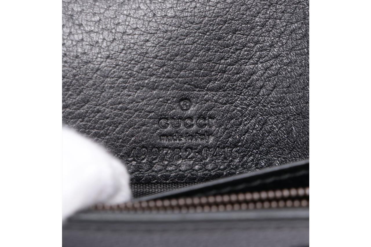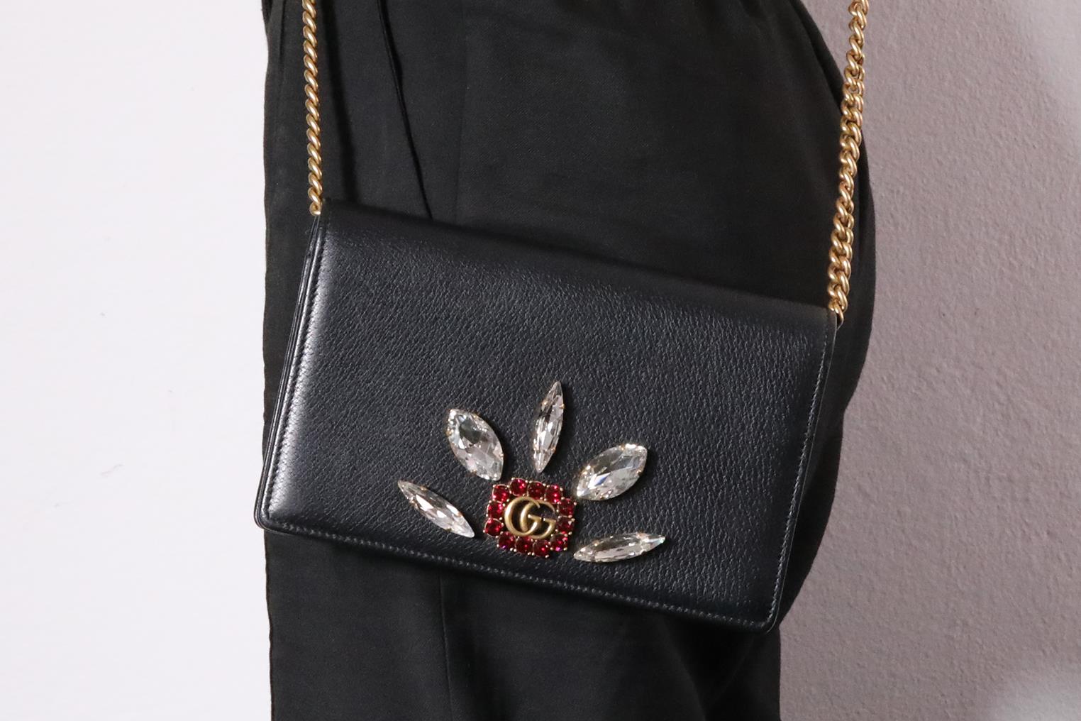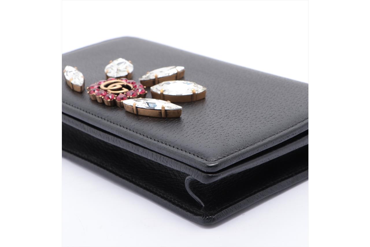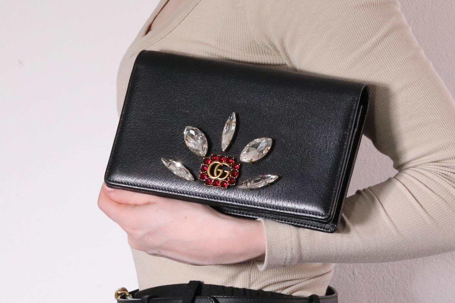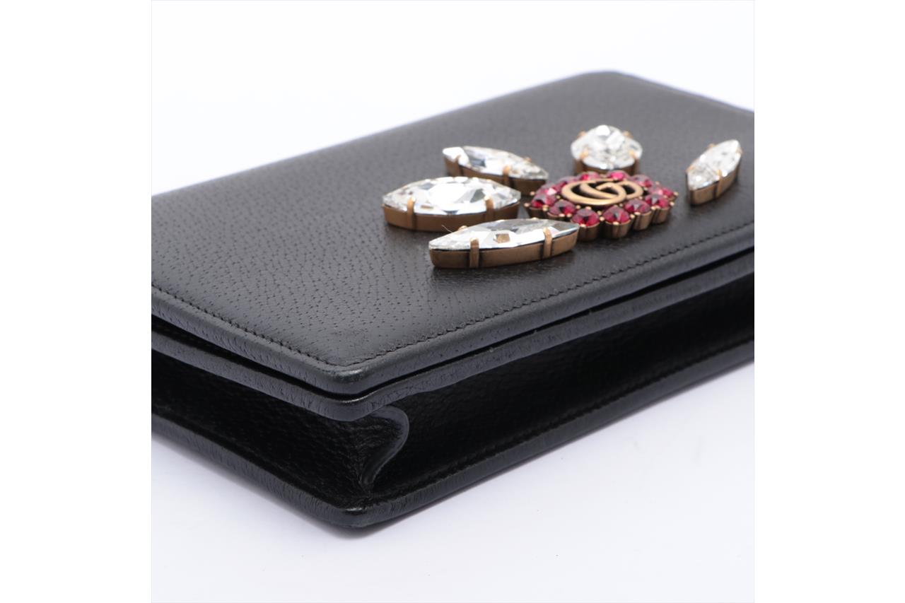 Gucci GG Marmont Embellished Chain Wallet with Mirror. Black Leather. Gold-tone hardware. Six card slots. Approximate dimensions: 20cm (L) x 13cm (H) x 4cm (D) and 58cm strap drop. With Gucci dust bag and Entrupy Certificate of Authenticity. (Pre-owned)