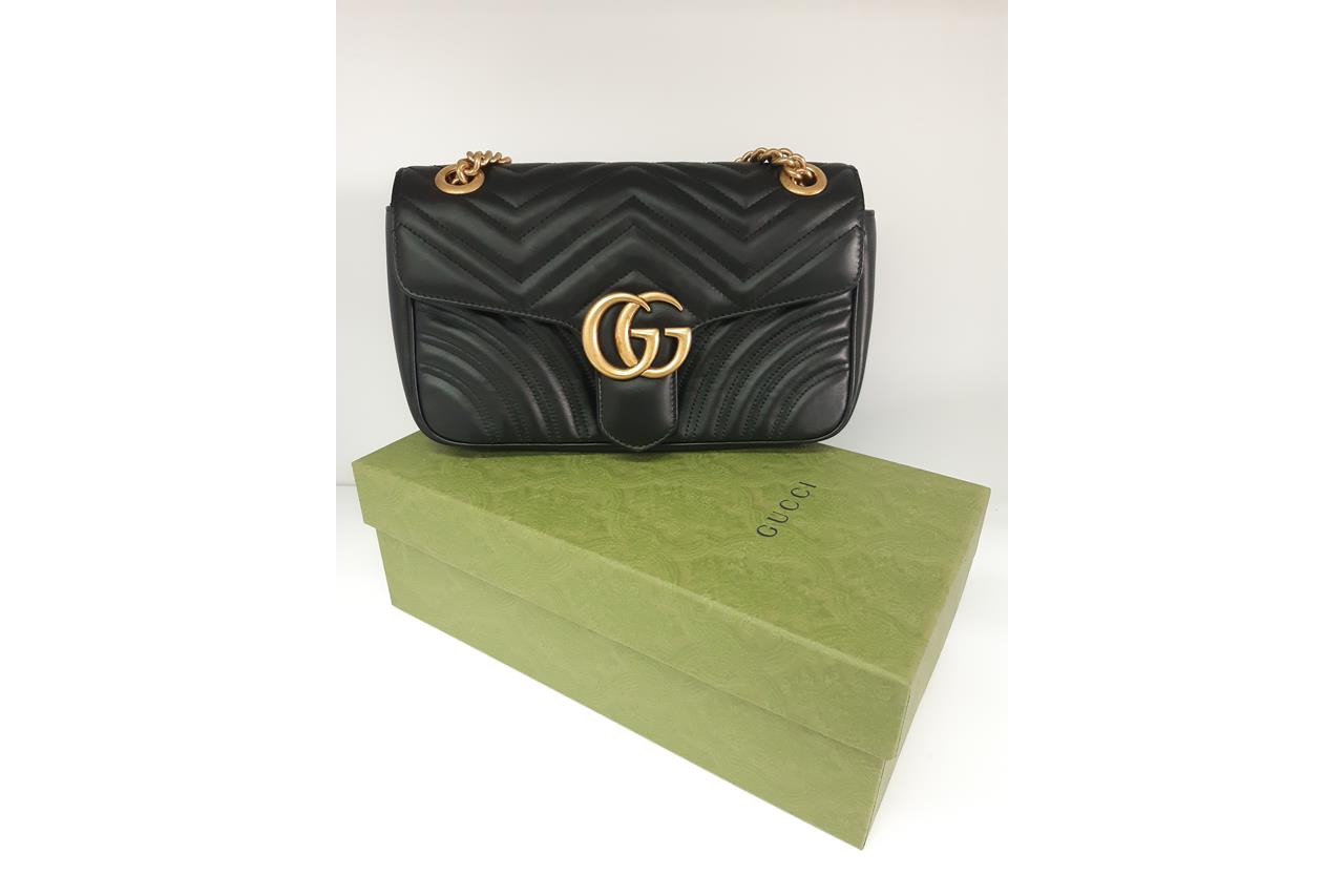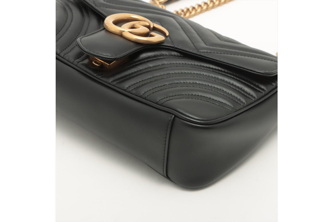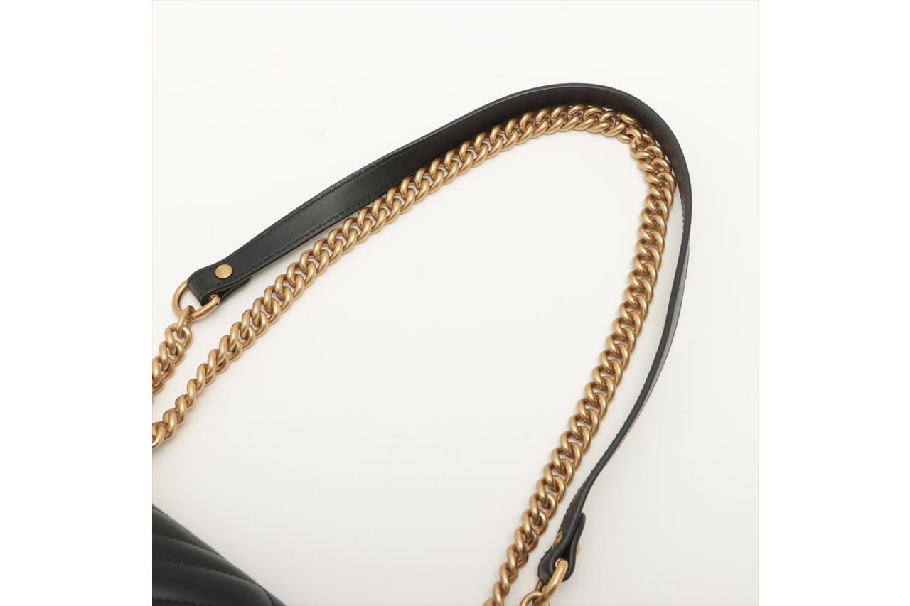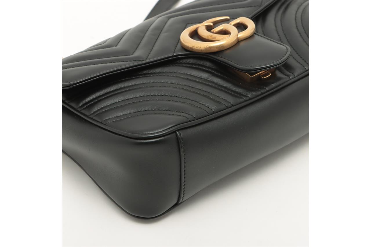 Gucci GG Marmont small shoulder bag in black matelassé chevron leather. Antique gold-toned hardware, frontal flap & snap closure with double G logo detail. This opens to a microfibre lining interior with a zip pocket. Approximate dimensions: 25cm(L) x 15cm(H) x7cm(D), 53cm leather-chain drop height. Accompanied by Gucci dust bag and box. With Entrupy Certificate of Authenticity. (Pre-owned)