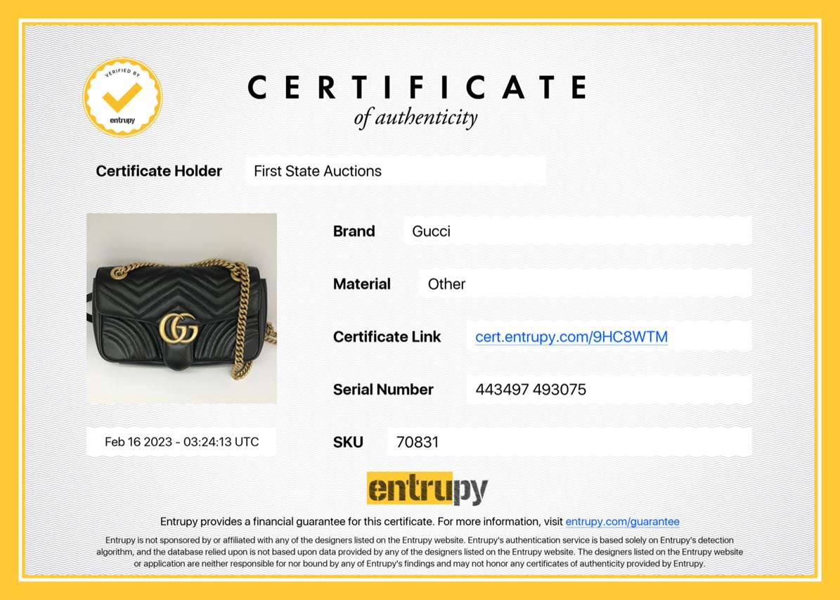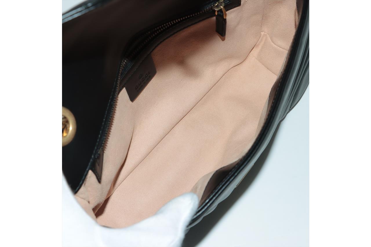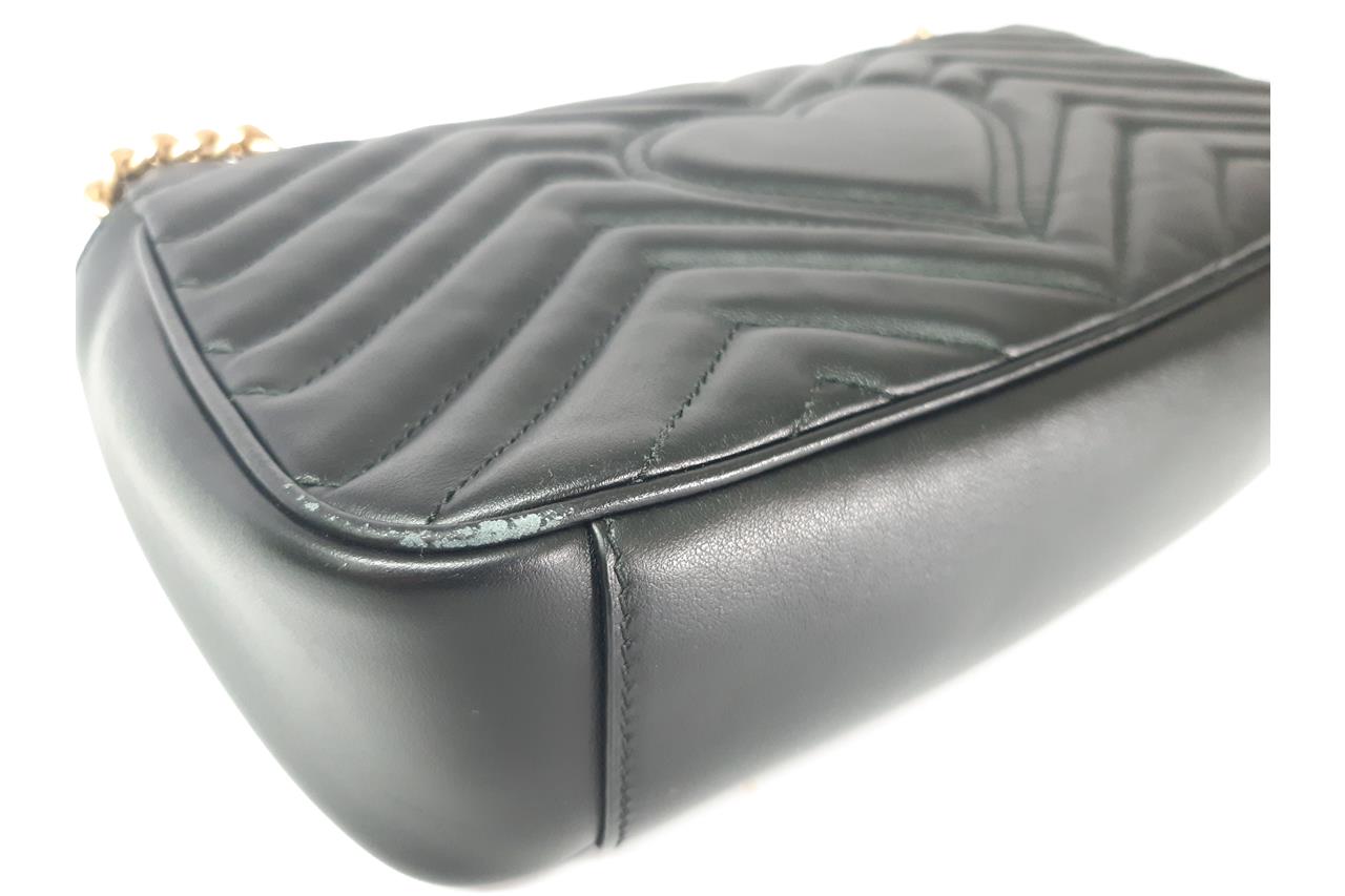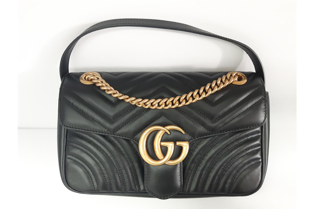 Gucci GG Marmont small shoulder bag in black matelassé chevron leather. Antique gold-toned hardware, frontal flap & snap closure with double G logo detail. This opens to a microfibre lining interior with a zip pocket. Approximate dimensions: 25cm(L) x 15cm(H) x7cm(D), 53cm leather-chain drop height. Accompanied by Gucci dust bag and box. With Entrupy Certificate of Authenticity. (Pre-owned)