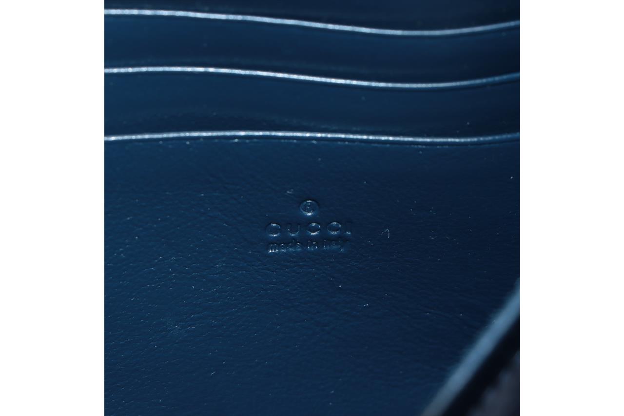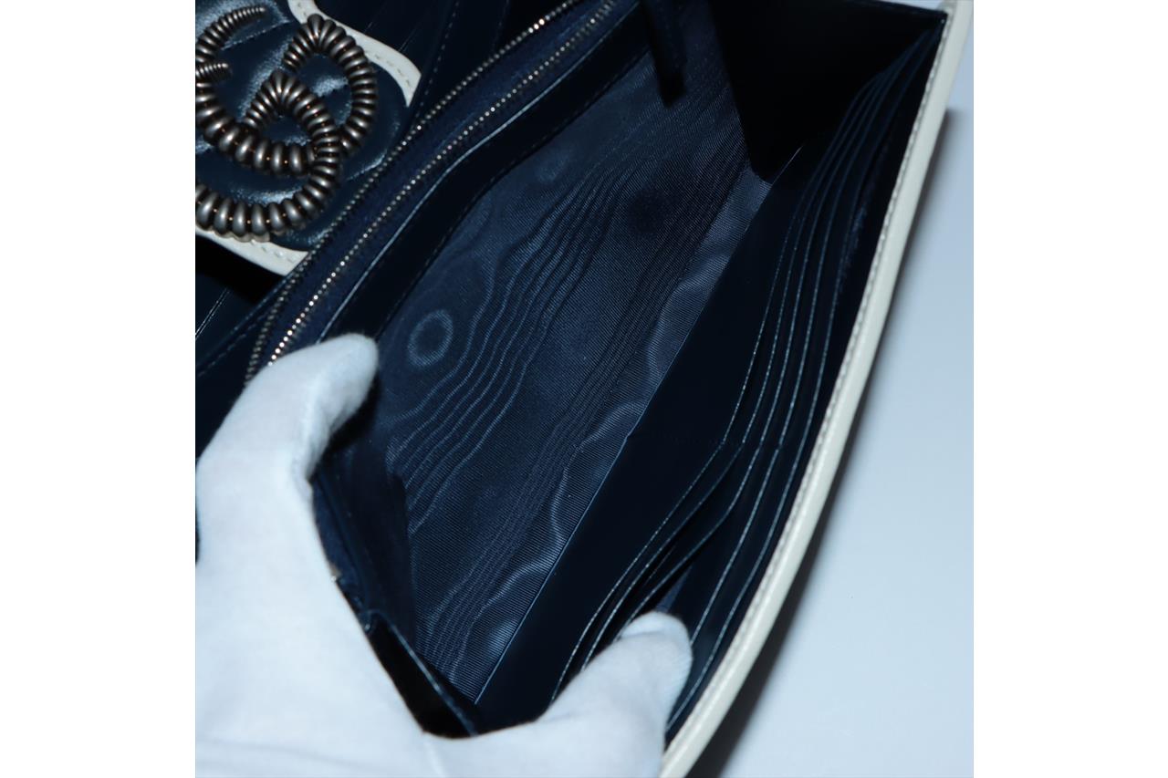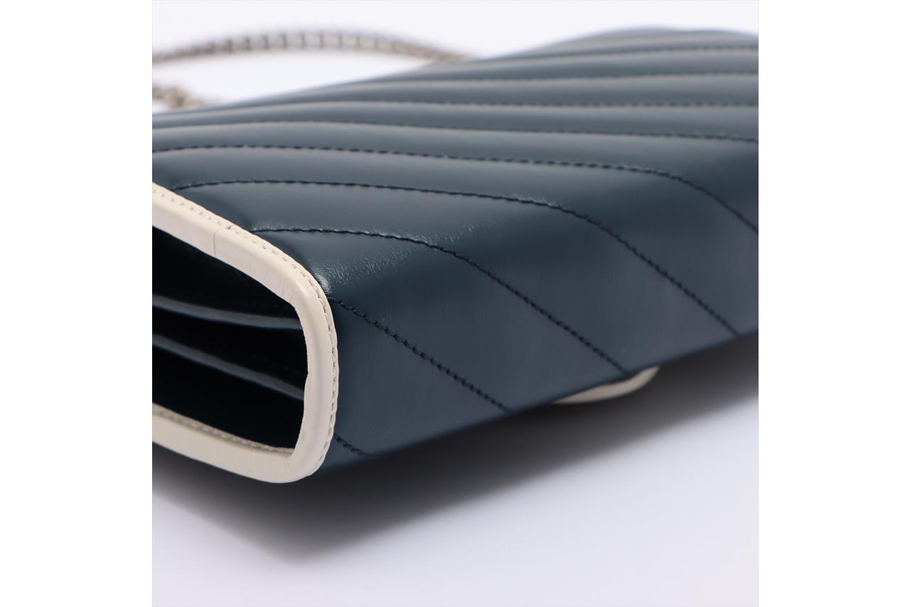 Gucci GG Marmont Mini Chain Bag. Dark blue diagonal matelassé leather. White leather trim. Gold-tone hardware. Approximate dimensions: 20cm (L) x 13cm (H) x 6cm (D) and chain shoulder strap with 60cm drop. Accompanied by Gucci box and dust bag. With Entrupy Certificate of Authenticity. (As New)