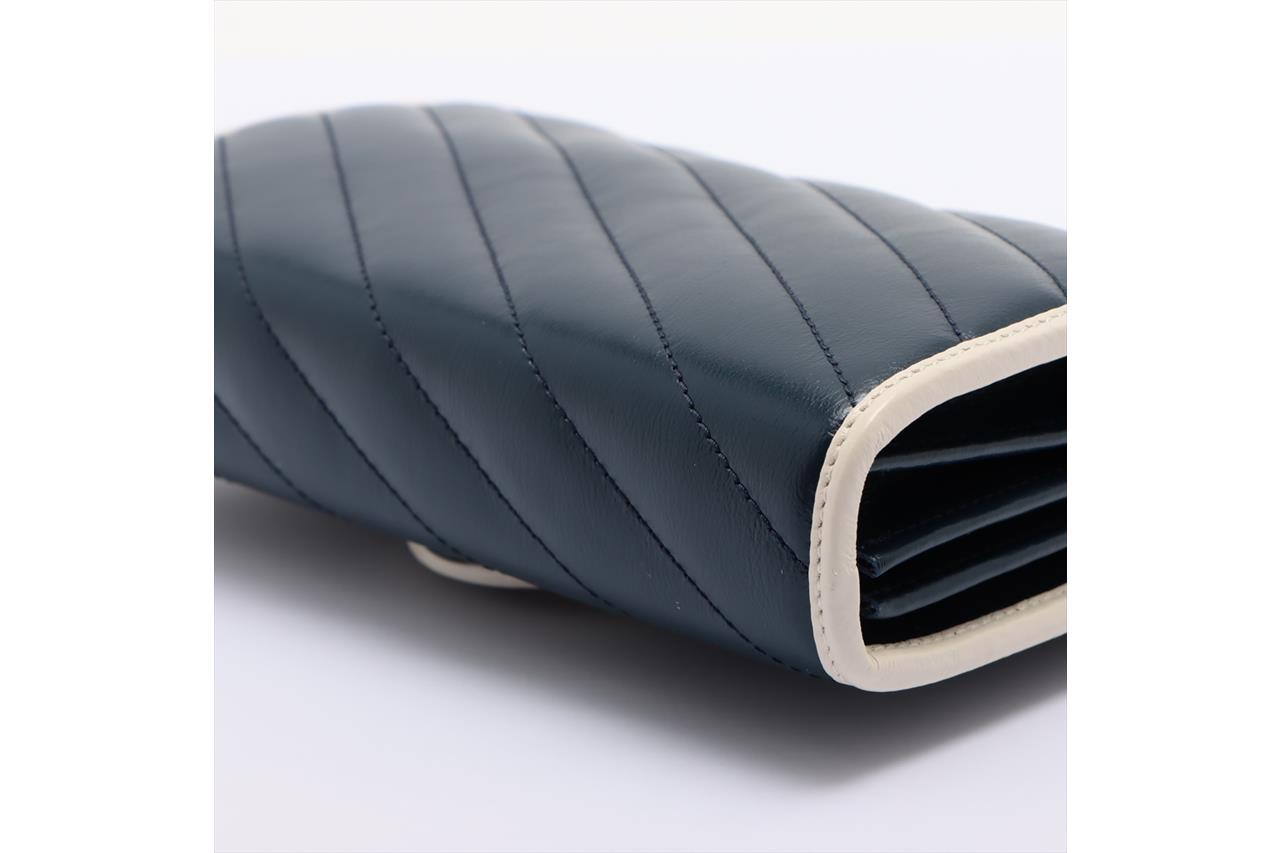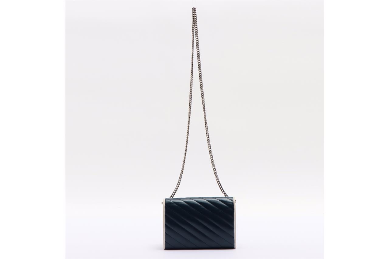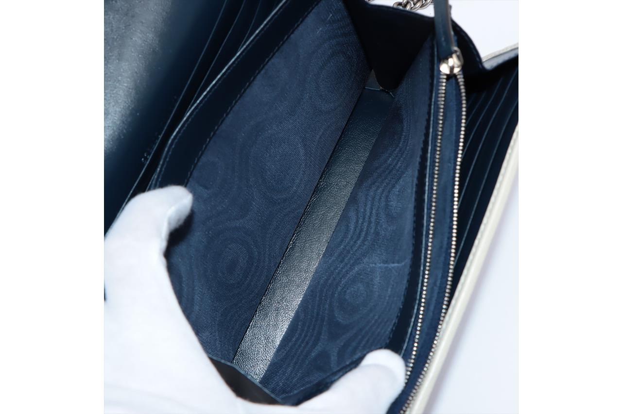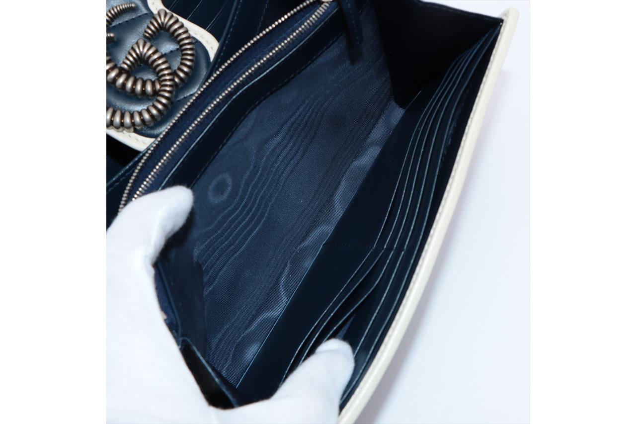 Gucci GG Marmont Mini Chain Bag. Dark blue diagonal matelassé leather. White leather trim. Gold-tone hardware. Approximate dimensions: 20cm (L) x 13cm (H) x 6cm (D) and chain shoulder strap with 60cm drop. Accompanied by Gucci box and dust bag. With Entrupy Certificate of Authenticity. (As New)