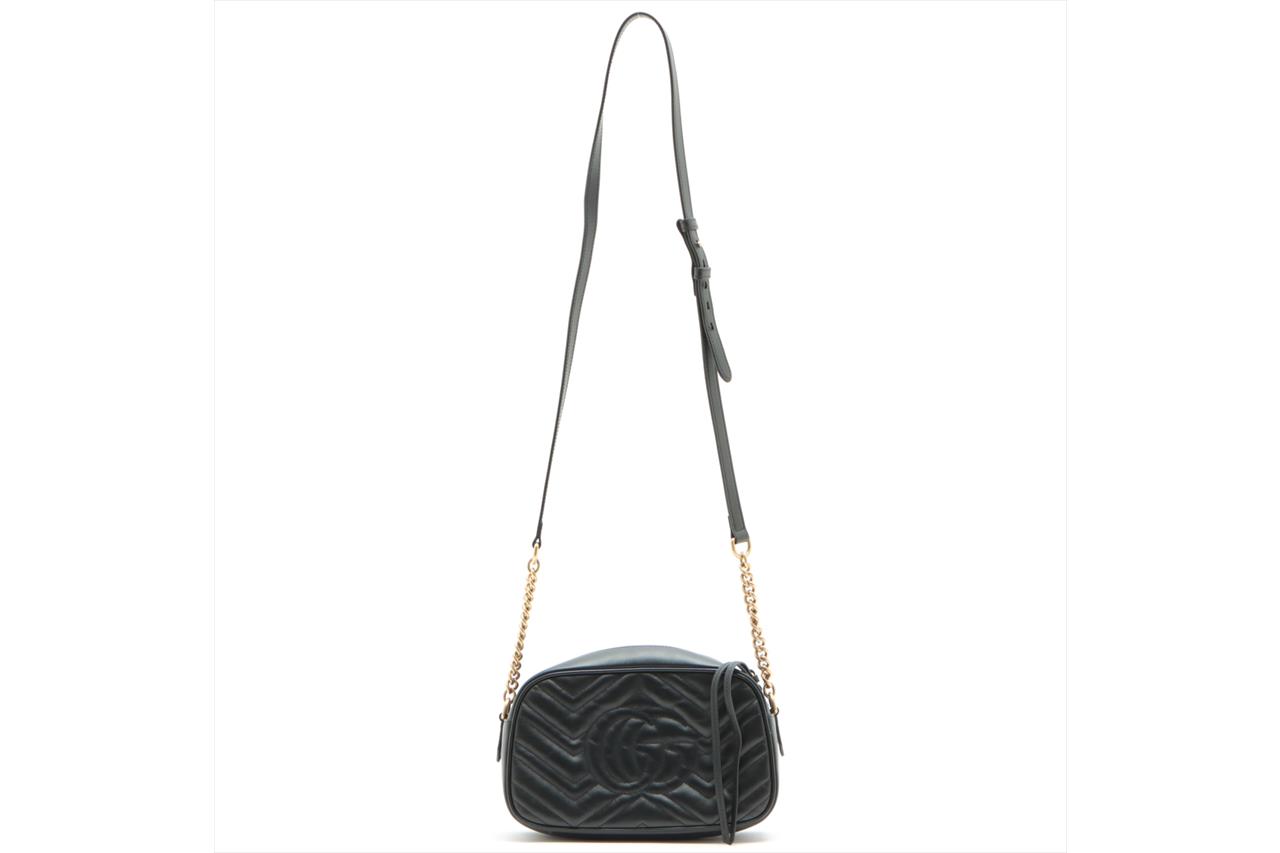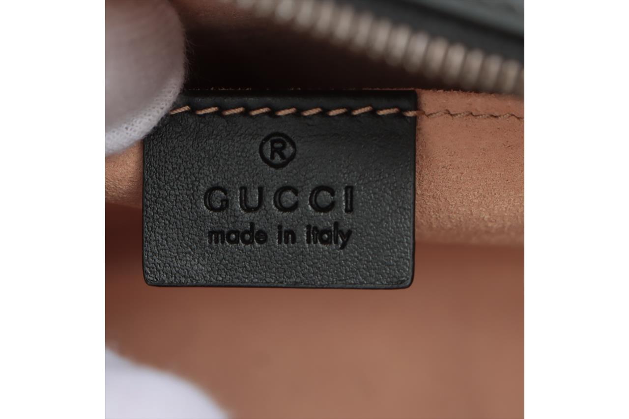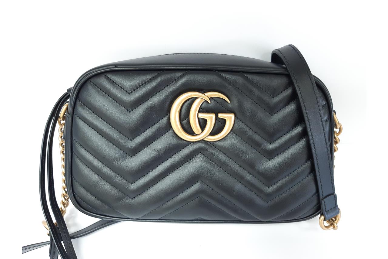 Gucci small GG Marmont chain shoulder bag in black matelasse chevron leather with GG patern on the back. Antique gold-toned hardware, zip top closure. It opens to beige microfiber lined interior with a patch pocket. Approximate dimensions: 24cm(L) x 14cm(H) 7cm(D), 56cm(min) adjustable shoulder strap drop height. Accompanied by Gucci booklets, dust bag and box. With Entrupy Certificate of Authenticity. (Pre-owned)