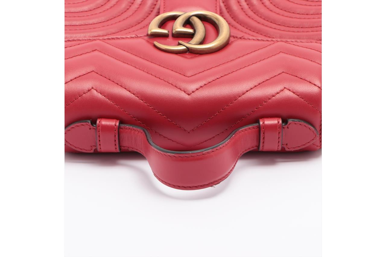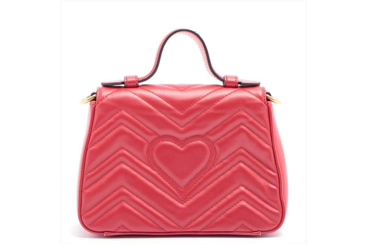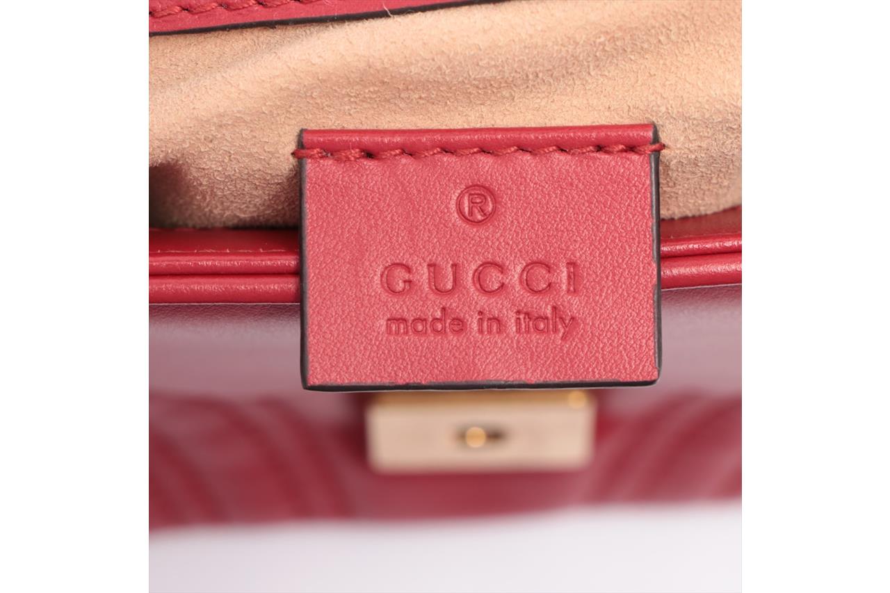 Gucci GG Marmont Top Handle Bag. Antique gold-tone hardware. Red leather with matelassé effect. Single top handle & fold over top with magnetic fastening. Approximate dimensions: 21cm (L) x 15.5cm (H) x 8cm (D). Made in Italy. With Gucci dust bag, detachable strap and Entrupy Certificate of Authenticity. (Pre-owned)