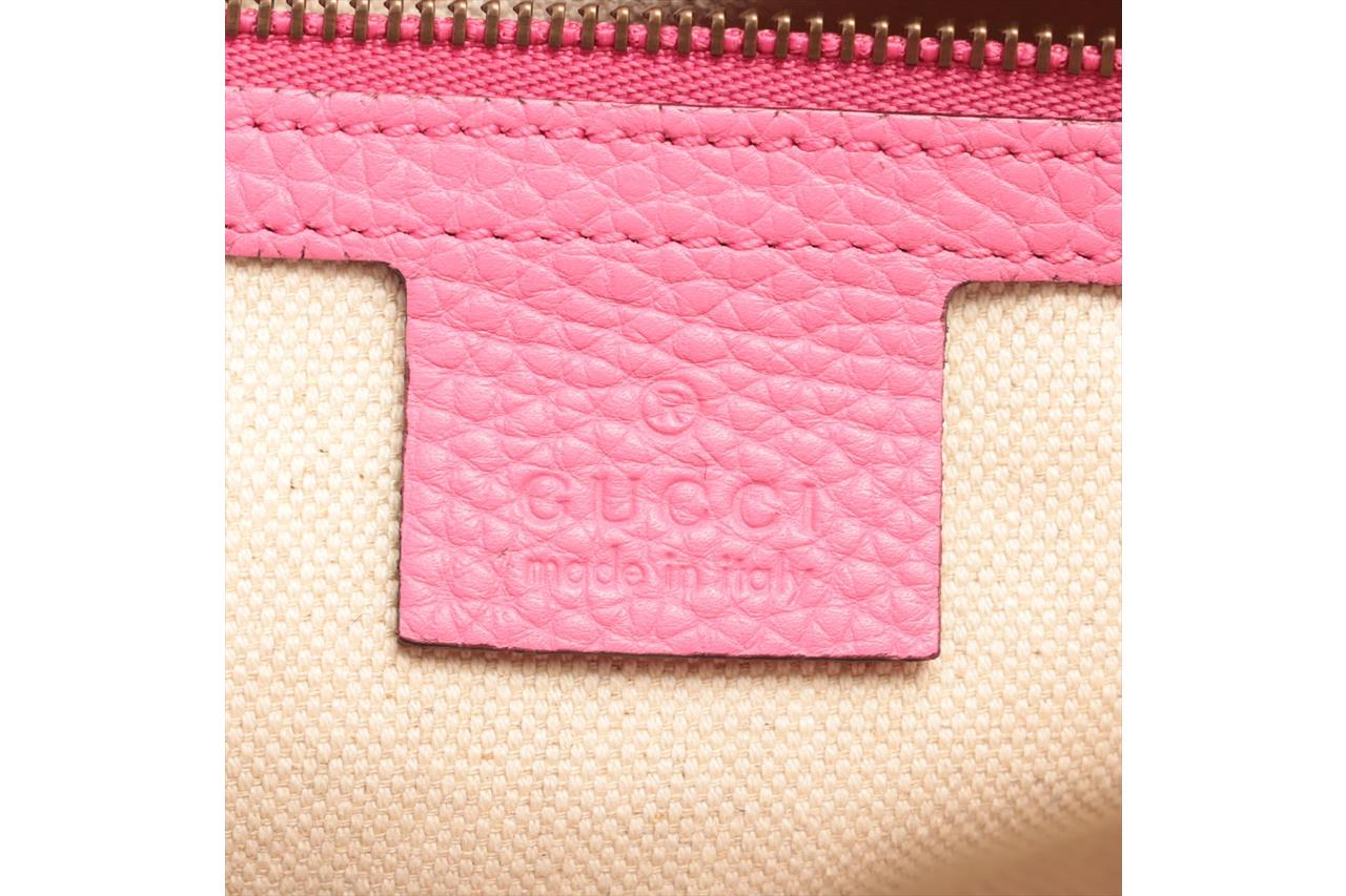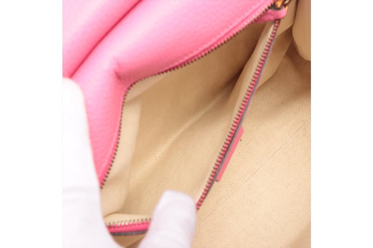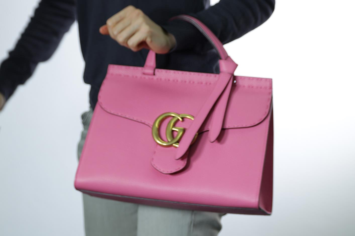Gucci GG Marmont Top Handle in Pink Leather. Brushed gold-tone hardware. Featuring a flat leather top handle, flat top with GG logo, push lock closure and a neutral fabric interior with zip and slip pockets. Approximate dimensions: 32cm (L) x 22cm (H) x 12.5cm (D) and 8.5cm handle height. With Entrupy Certificate of Authenticity. (Pre-owned)