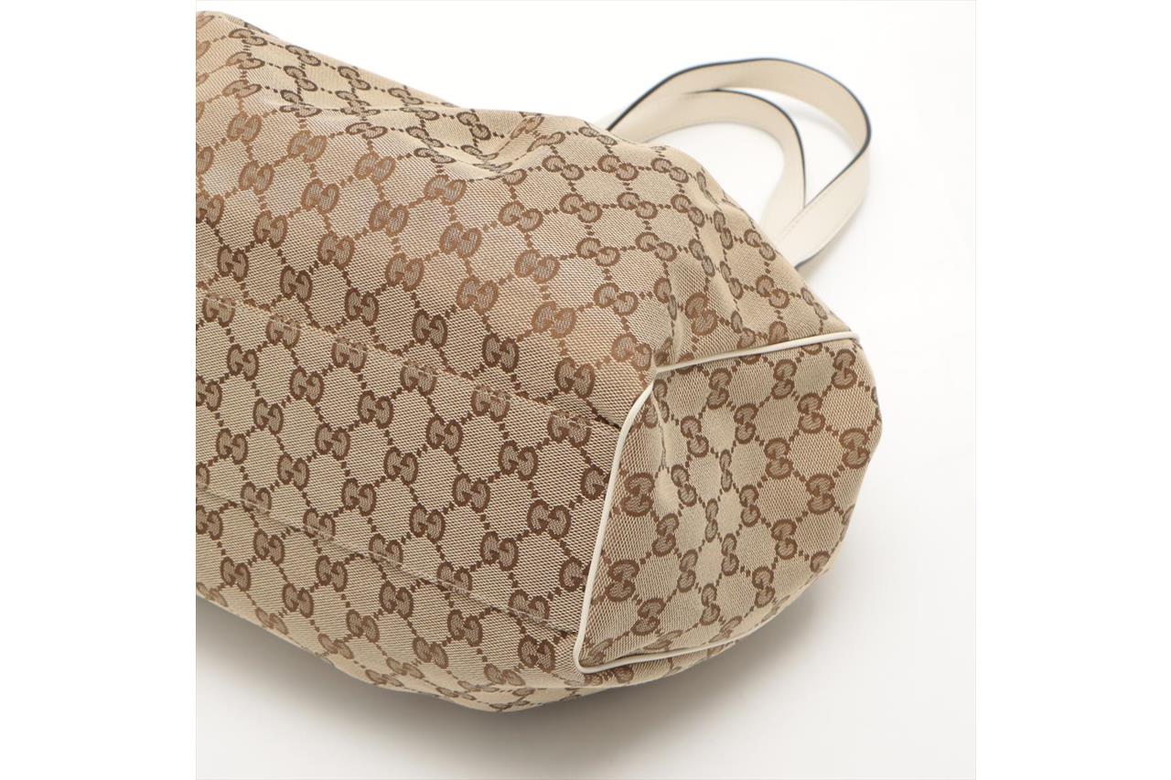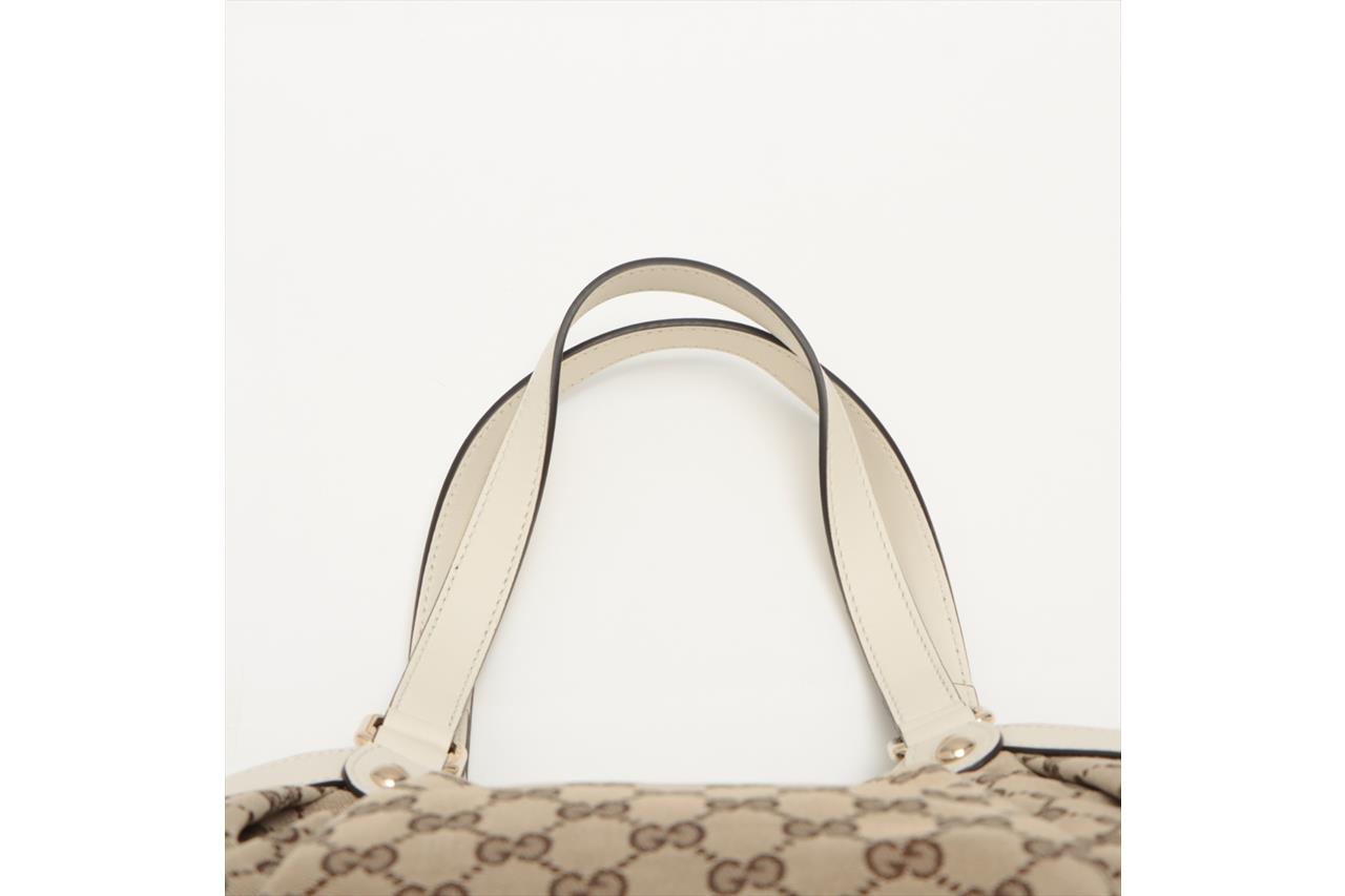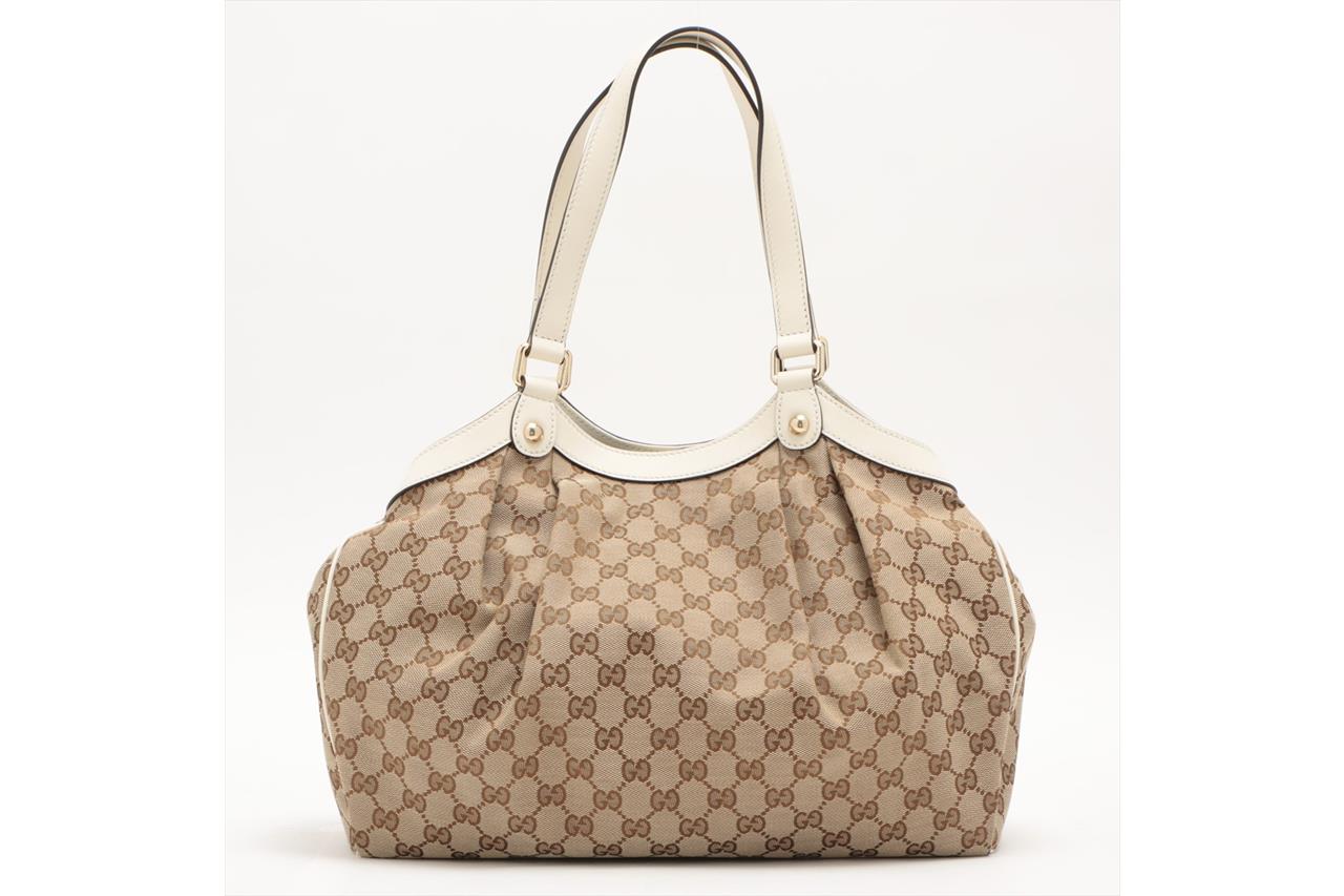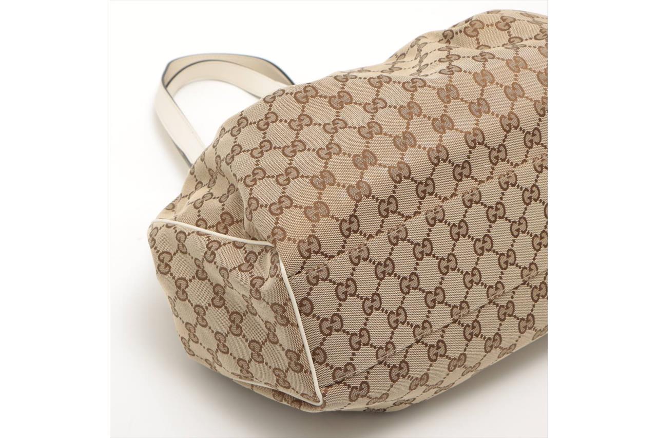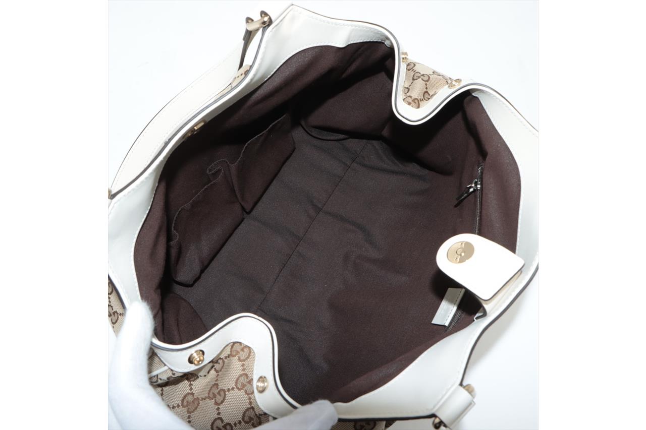 Gucci shoulder bag in GG Monogram Canvas. Featuring white cowhide leather trim and handles, gold-toned hardware, snap buttons on sides, magnetic button closure on top. The top opens to a brown fabric interior with a zipper pocket. Approximate dimensions: 34cm(L-Base) x 26cm(H) x 10.5cm(D), 21cm handle drop. Accompanied by Gucci dust bag and info booklets. With Entrupy Certificate of Authenticity.(Pre-owned)