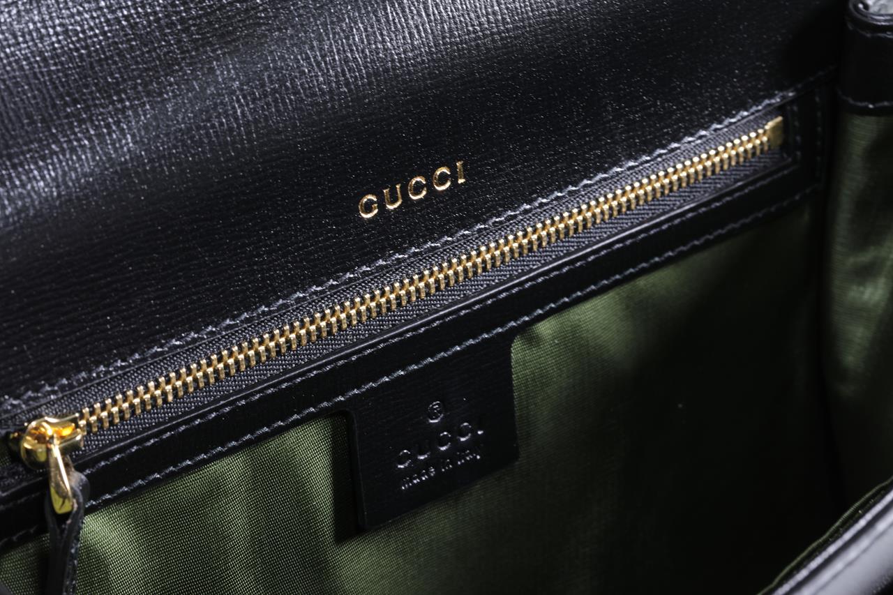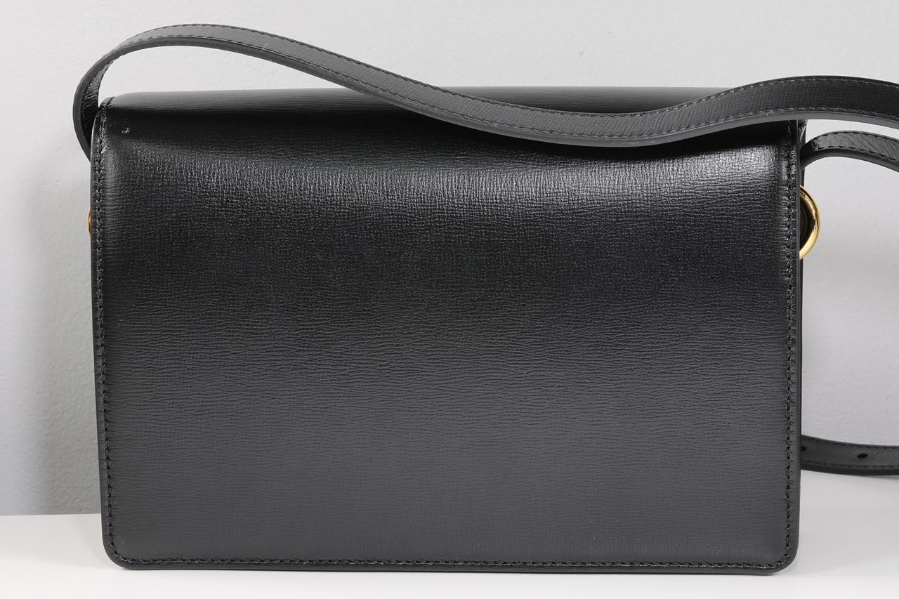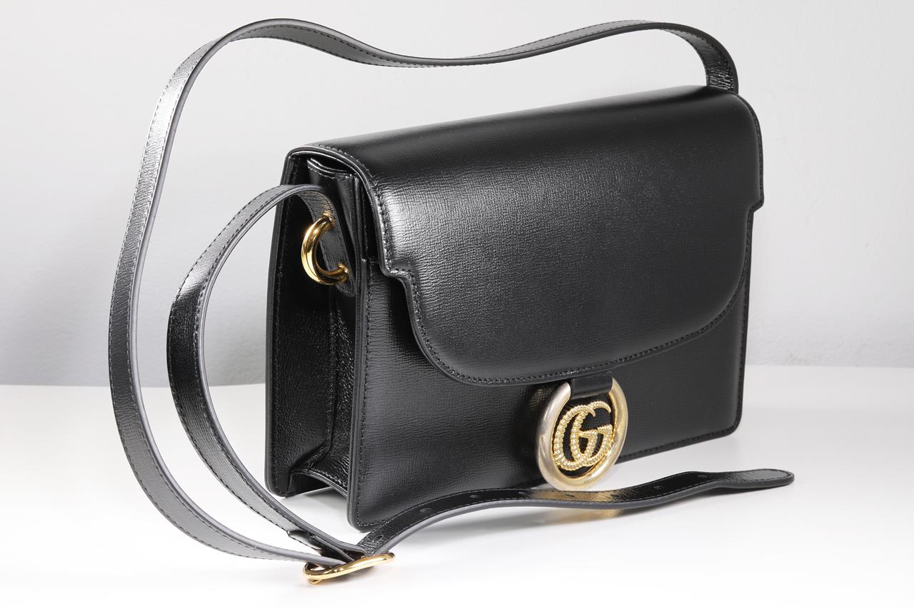 Gucci GG ring black leather shoulder bag. Features a foldover top with a magnetic snap closure, a gold-toned hardware, adjustable strap for shoulder or crossbody wear, a double G hanging on front, open pocket under the flap and 1 main interior compartment with zip pocket. Ref# 589474. Dimensions: 24cm x 16cm x 6cm. With Gucci dust bag and Gucci box. (Pre-owned)