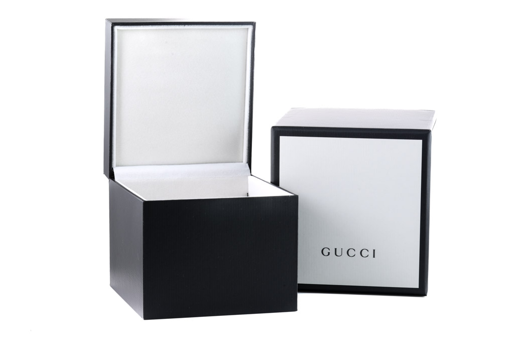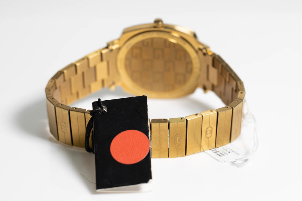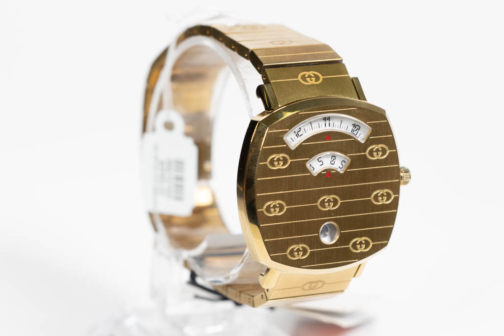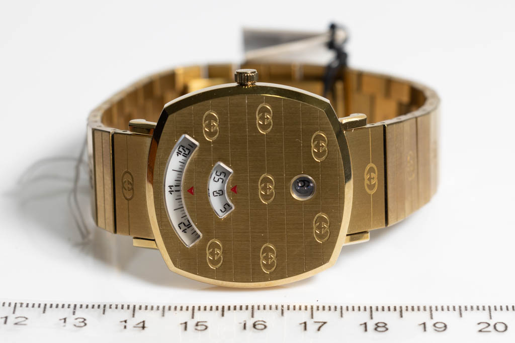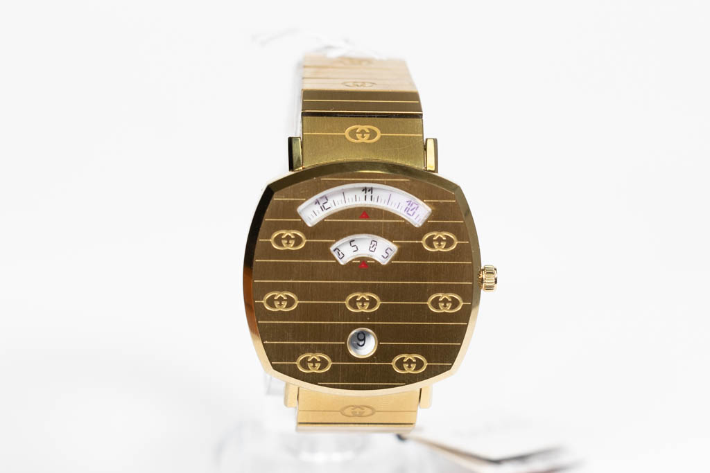 Gucci Grip yellow gold PVD quartz ladies watch. Yellow gold PVD case, date, case diameter: 35mm, wrist size: 18cm, Swiss made. Ref# YA157403. With Gucci yellow gold PVD bracelet and interlocking Gs clasp. With Gucci box and International Warranty Certificate - the certificate is not stamped so the Gucci warranty will not apply. Wth Gucci box. 3 month FSA warranty. (As New, Note: minor scratches on case due to being display stock)