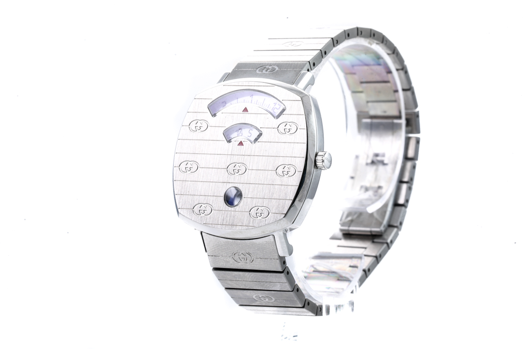 Gucci Grip stainless steel quartz ladies watch. Stainless steel case, date, case diameter: 35mm, wrist size: 18cm, Swiss made. Ref# YA157401. With Gucci stainless stee; bracelet and clasp. With Gucci International Warranty Certificate - the booklet is not stamped so the Gucci warranty will not apply and Gucci box. 3 month FSA warranty. (As New, Note: minor scratches son case and bracelet due to being display stock)