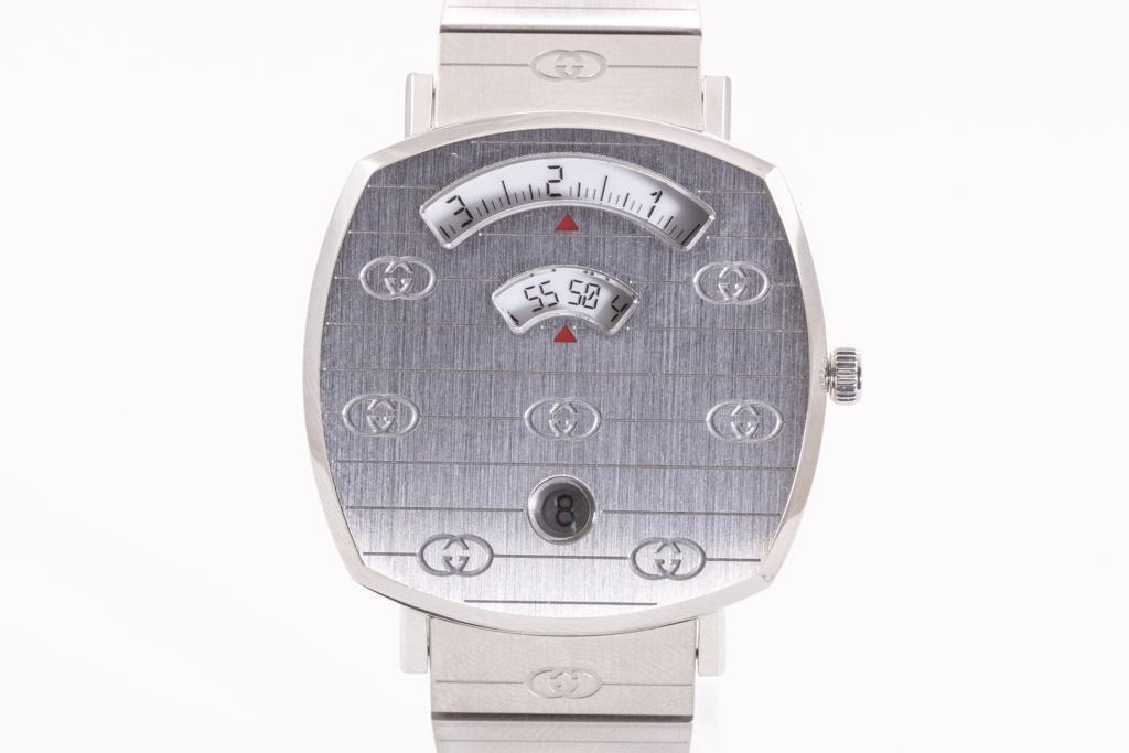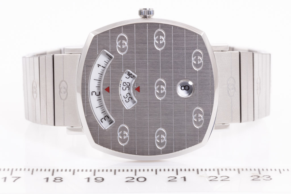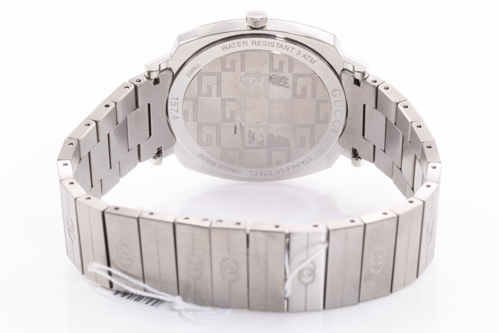 Gucci Grip stainless steel quartz ladies watch. Stainless steel case, date, case diameter: 35mm, wrist size: 17cm, Swiss made. Ref# YA157401. With Gucci stainless steel bracelet and clasp. With FSA Certificate of Authenticity. No box provided. 3 month FSA warranty. (As New, Note: scratches on case and bracelet due to being display stock)