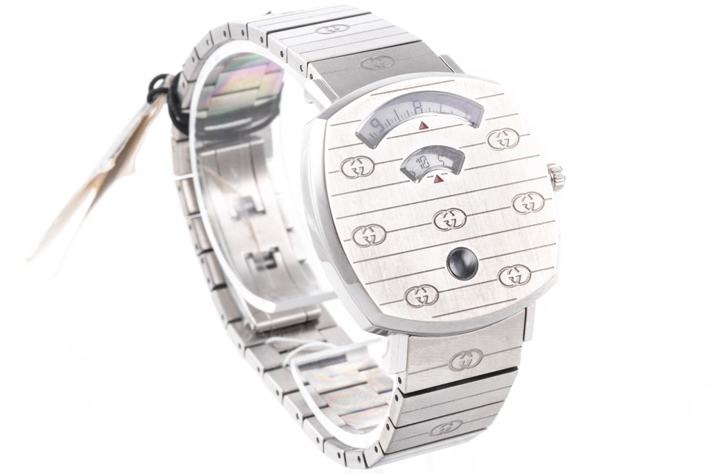 Gucci Grip stainless steel quartz ladies watch. Stainless steel case, date, case diameter: 35mm, wrist size: 18cm, Swiss made. Ref# YA157401. With Gucci stainless steel bracelet and clasp. With Gucci International Warranty Certificate - the Certificate is not stamped so the Gucci warranty does not apply. With Gucci box. 3 month FSA warranty. (As new. Note: minor scratches on case and bracelet due to being display stock)