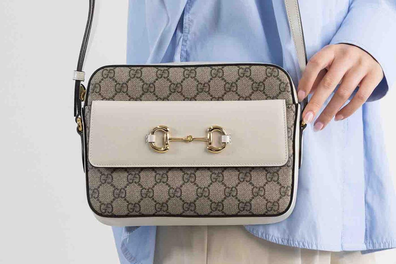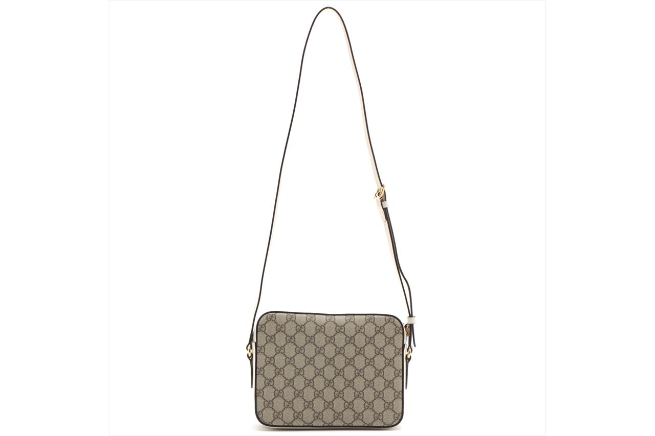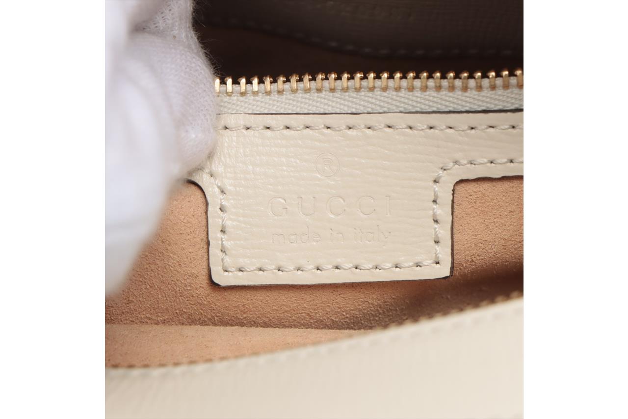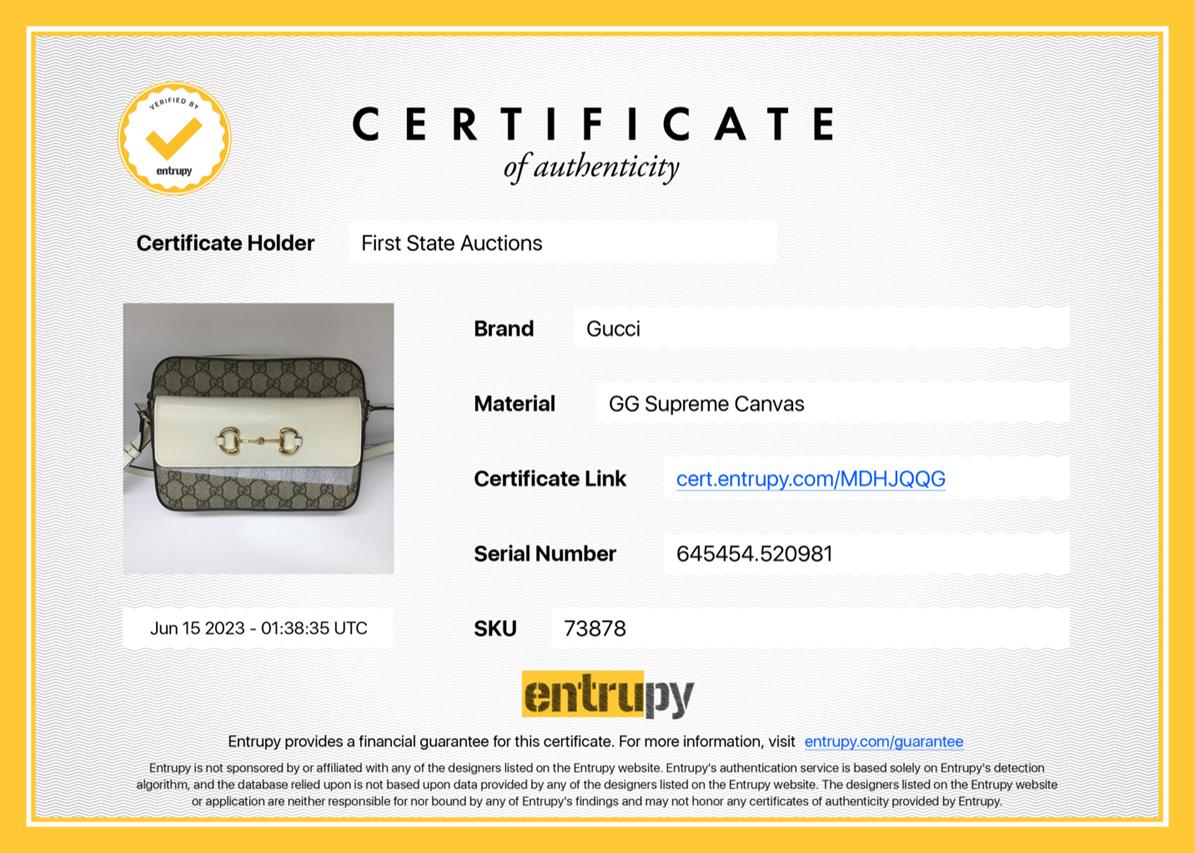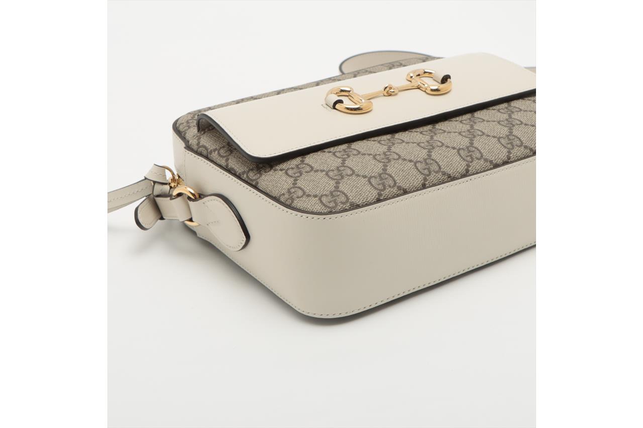 Gucci Horsebit 1955 small shoulder bag in GG supreme canvas and white leather details. Featuring an exterior pocket with Horsebit detail at front, gold-toned hardware, zip closure. The top opens to a microfibre lining interior with a zip pocket. Approximate dimensions: 22.5cm(L) x 17cm(H) x6cm(D), 48cm adjustable strap drop. Accompanied by Gucci info booklets and dust bag. With Entrupy Certificate of Authenticity. (Pre-owned)