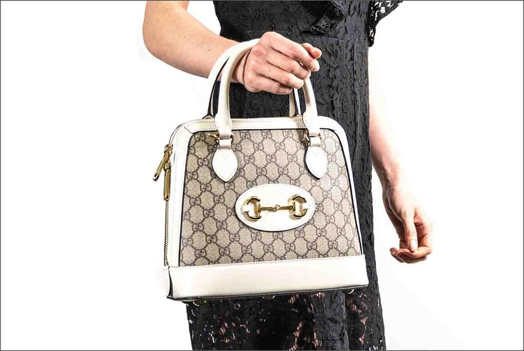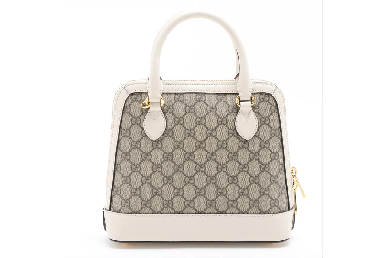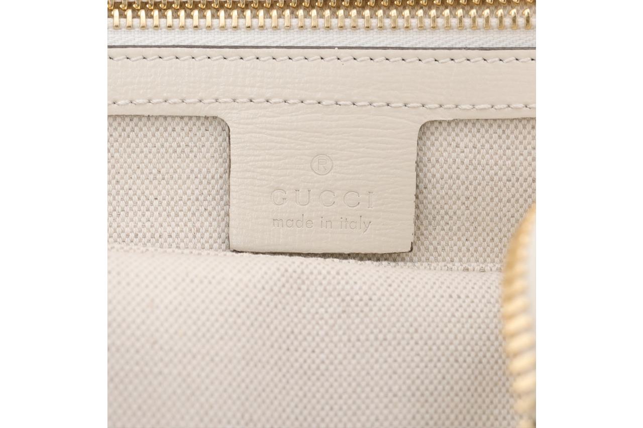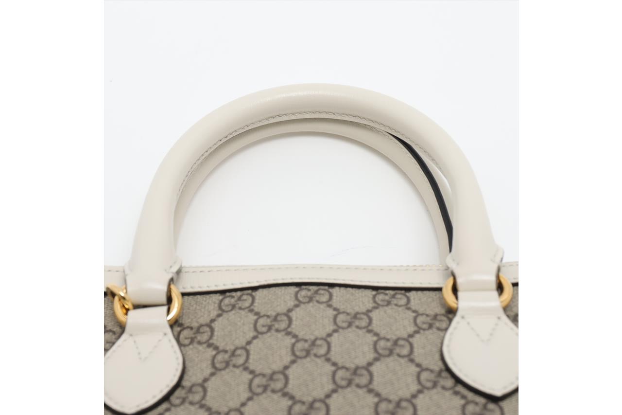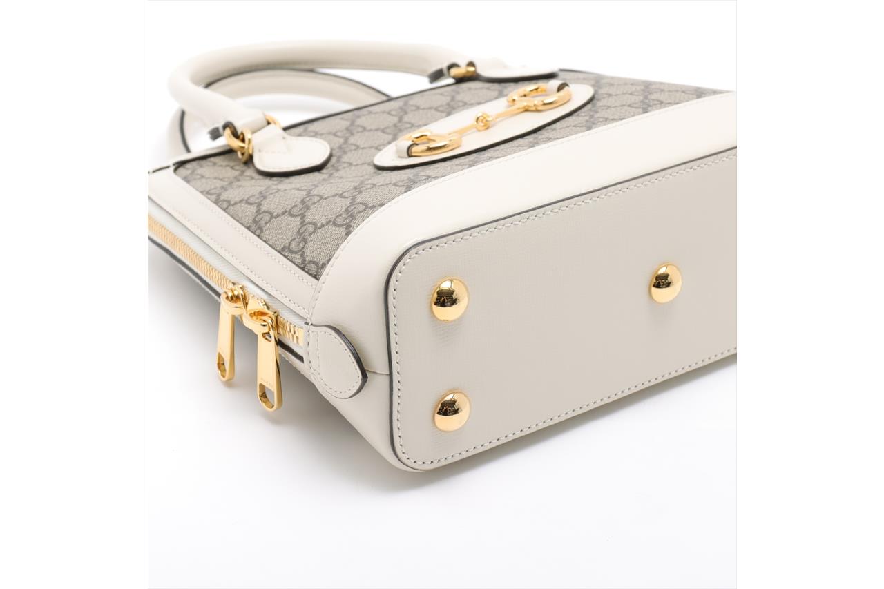 Gucci Horsebit 1955 Small Top Handle Bag in Beige and Ebony GG Supreme Canvas and White Leather Trims. Featuring gold-tone hardware, white cotton linen lining, horsebit detail at the front, interior zipper and open pockets, and extended double zipper closure. Approximate dimensions: 25cm (L) x 24cm (H) x 9cm (D), 9cm handle height and 54cm removable shoulder strap drop. Accompanied by a Gucci dust bag. With Entrupy Certificate of Authenticity. (Pre-owned)