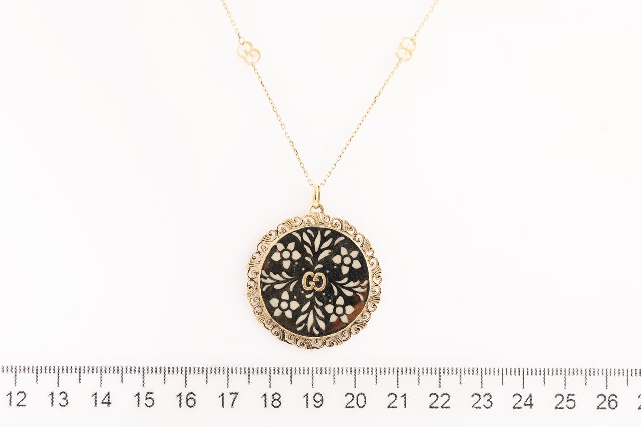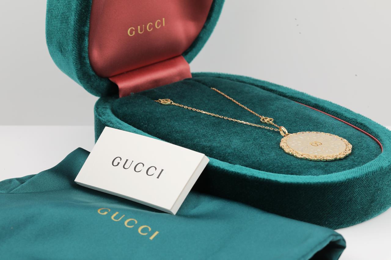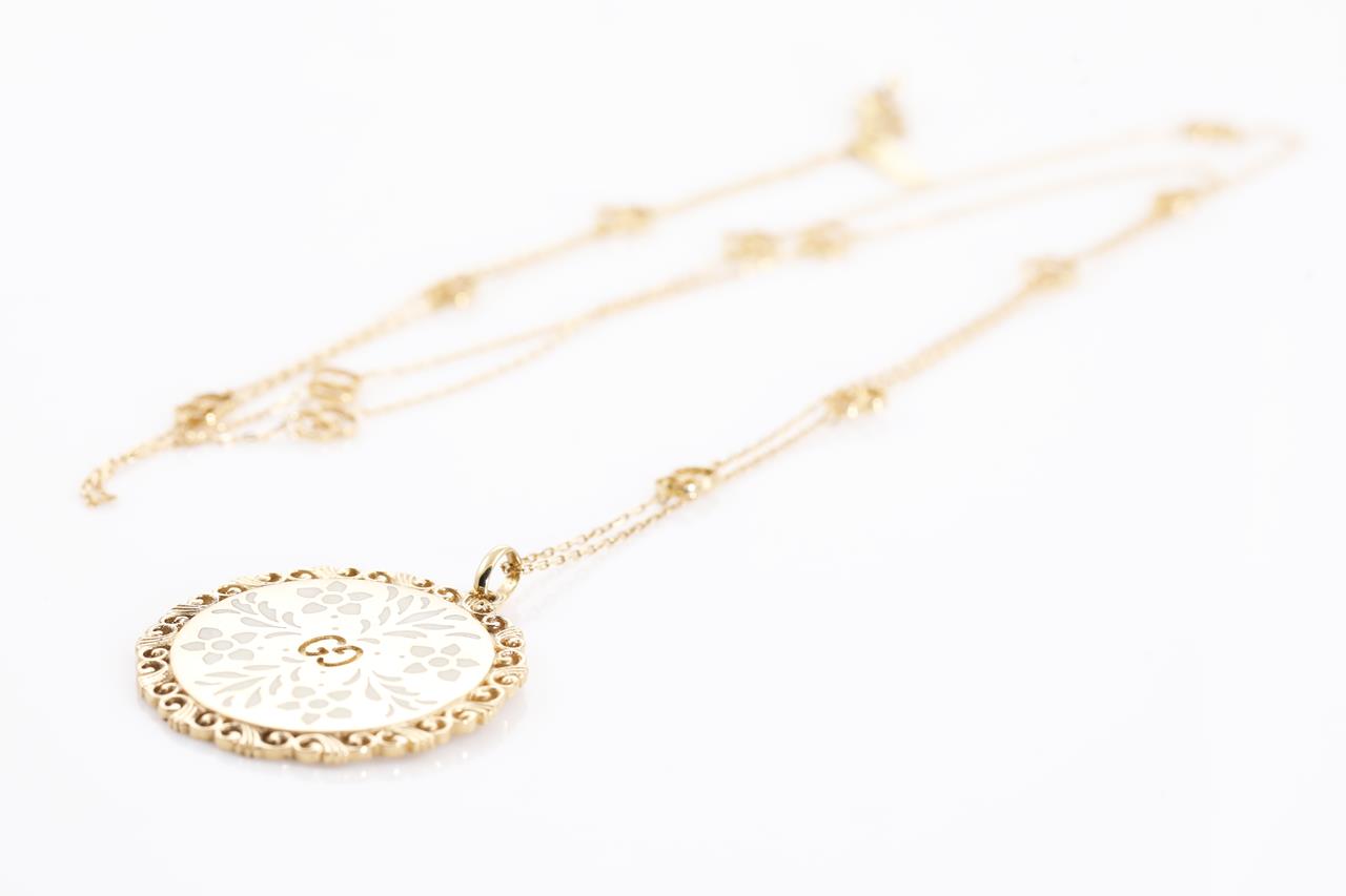 Gucci Icon Bloom Mystic necklace with white enameled motifs. 18ct yellow gold. With 80cm chain. Made in Italy. Weight: 20.3g. With Gucci box & pouch. (Pre-owned)