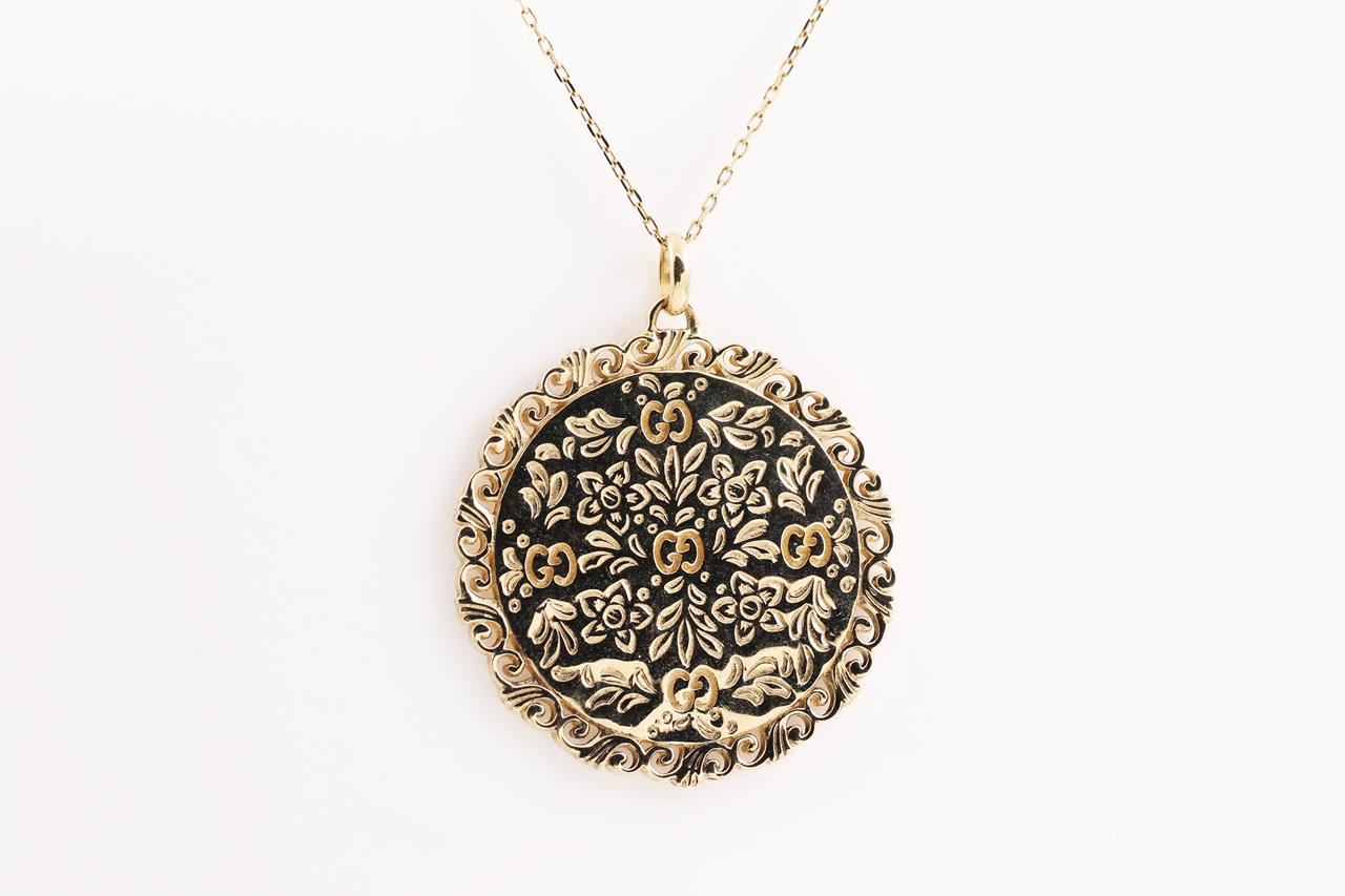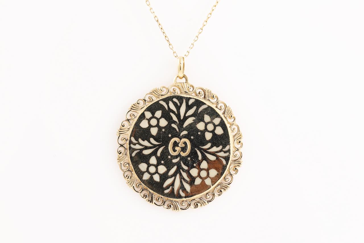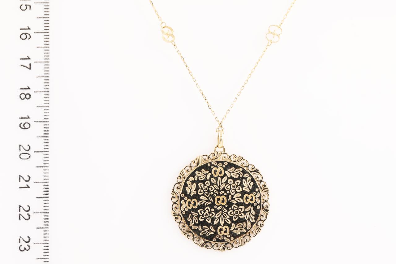 Gucci Icon Bloom Mystic necklace with white enameled motifs. 18ct yellow gold. With 80cm chain. Made in Italy. Weight: 20.3g. With Gucci box & pouch. (Pre-owned)