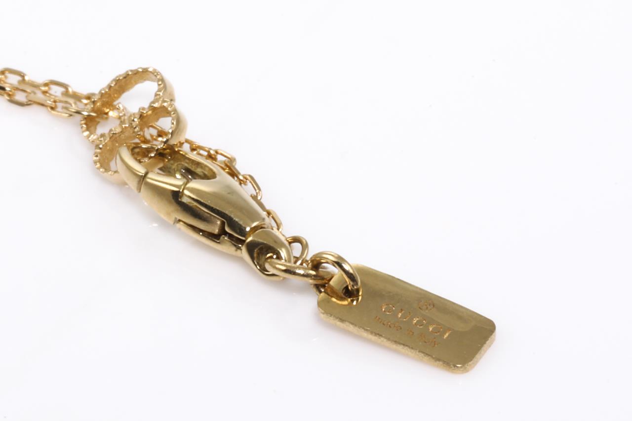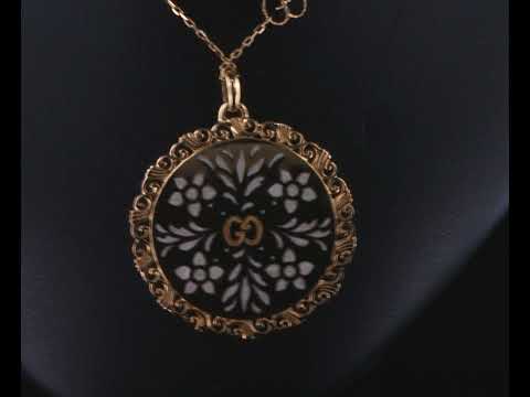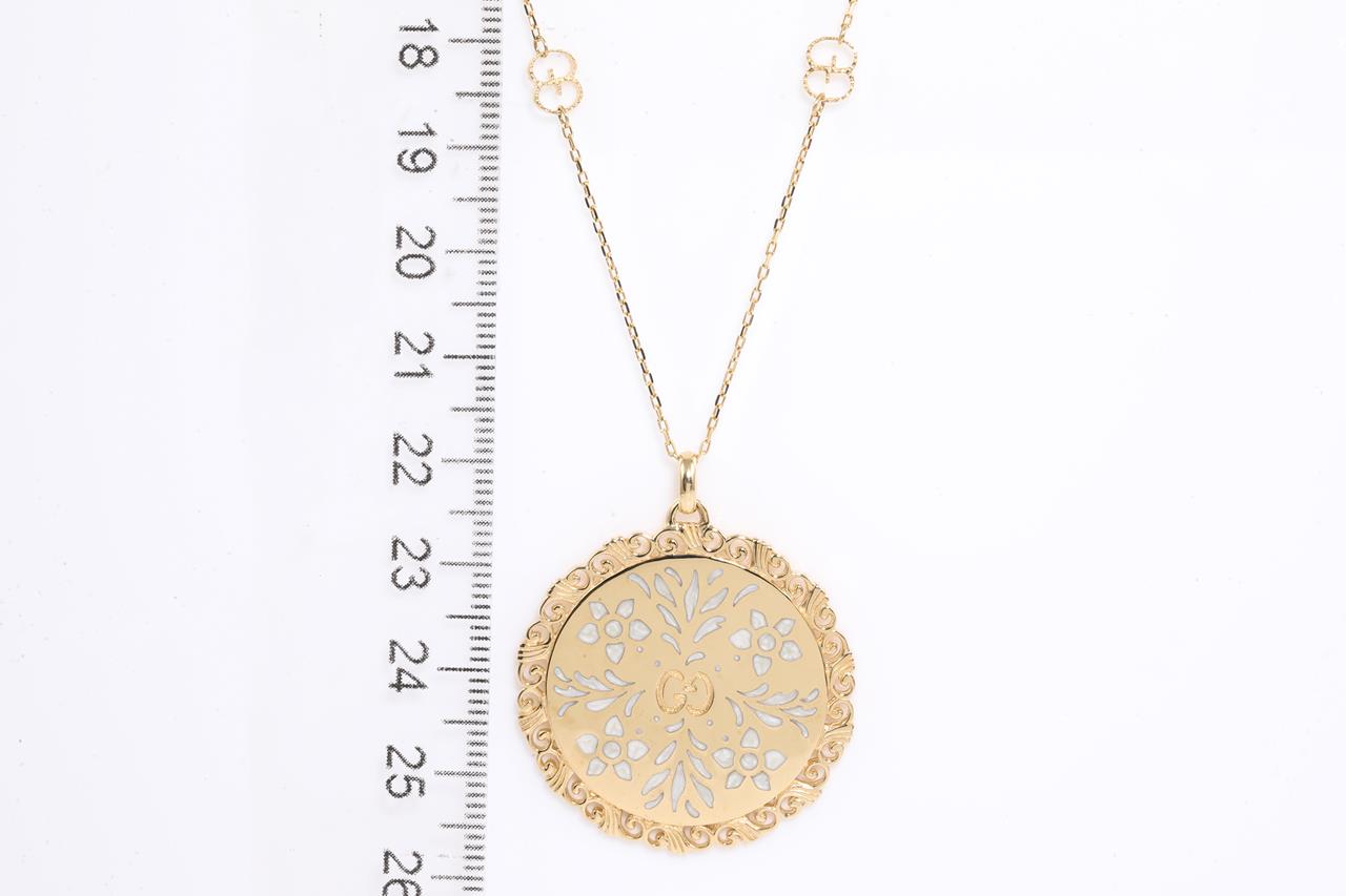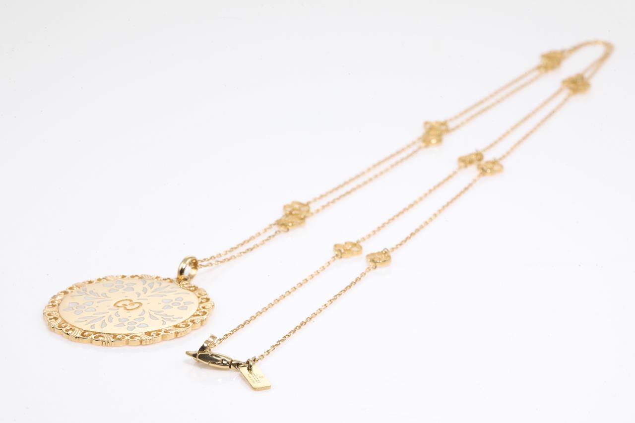 Gucci Icon Bloom Mystic necklace with white enameled motifs. 18ct yellow gold. With 80cm chain. Made in Italy. Weight: 21g. With Gucci box & pouch. (Pre-owned)