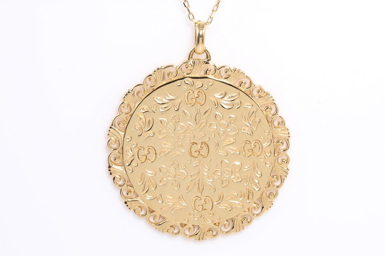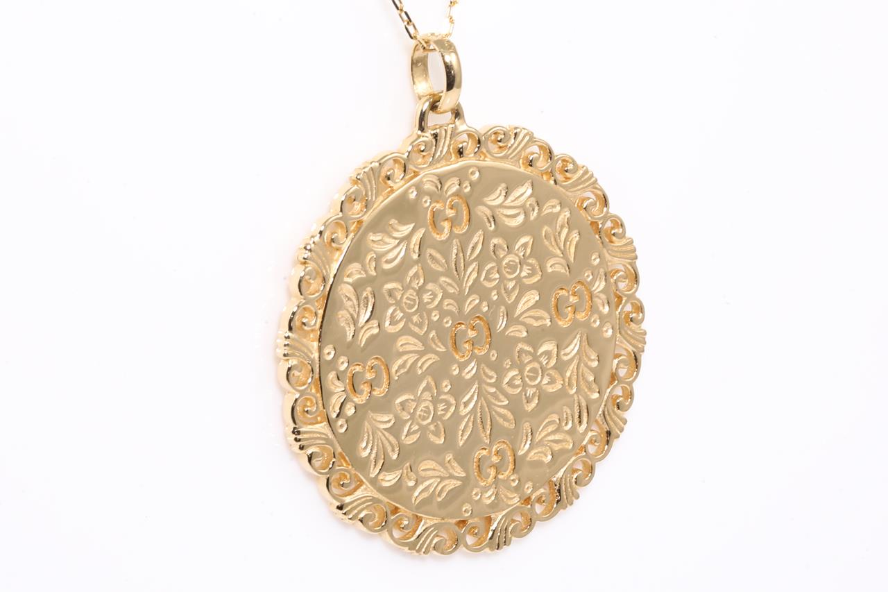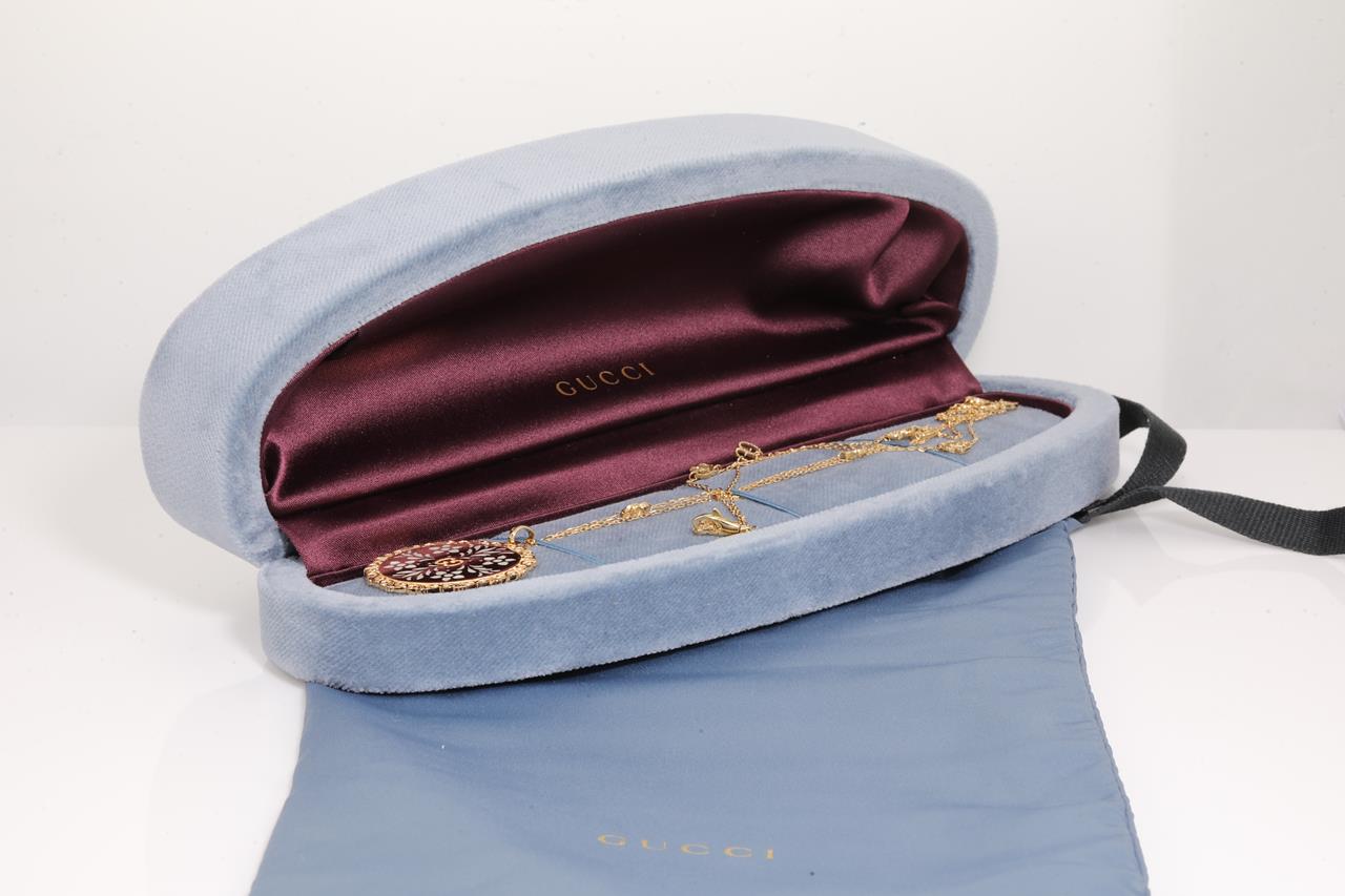 Gucci Icon Bloom Mystic necklace with white enameled motifs. 18ct yellow gold. With 80cm chain. Made in Italy. Weight: 21g. With Gucci box & pouch. (Pre-owned)