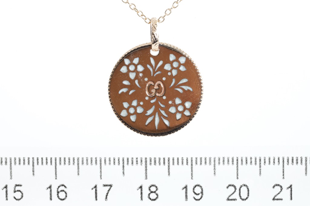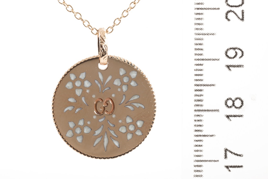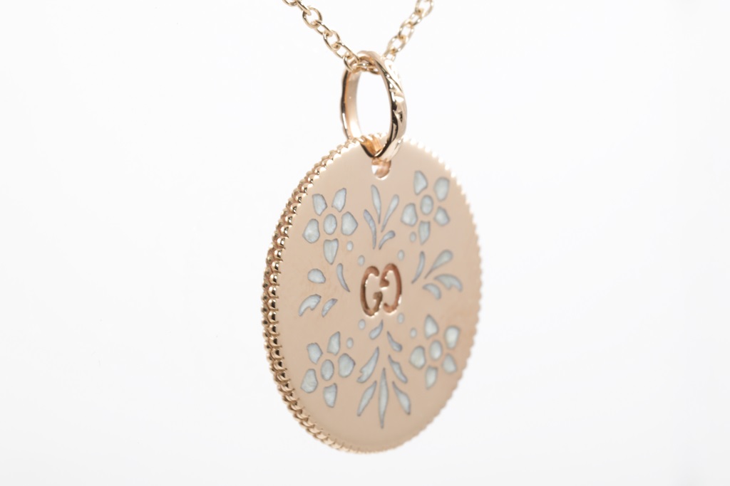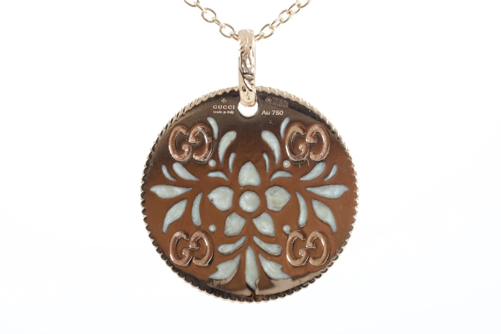 Gucci Icon Bloom necklace with enamelled motifs. Made in Italy. 18ct rose gold with adjustable 50cm 18ct rose gold chain. Weight: 7.7g. (Pre-owned)