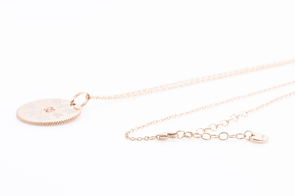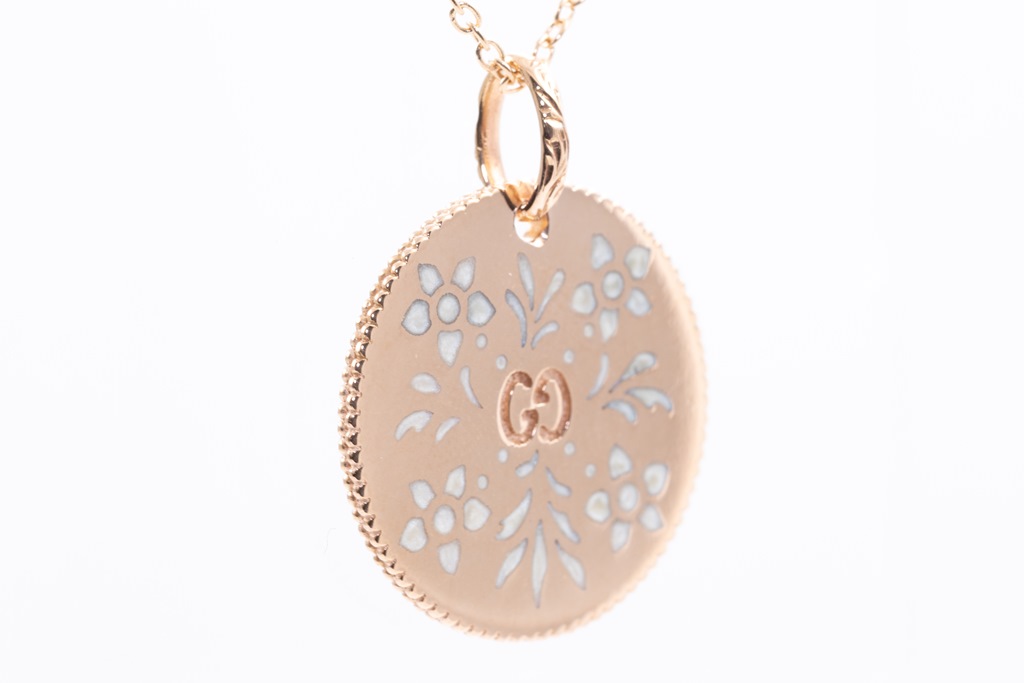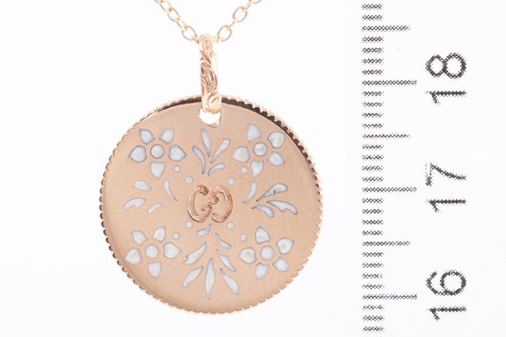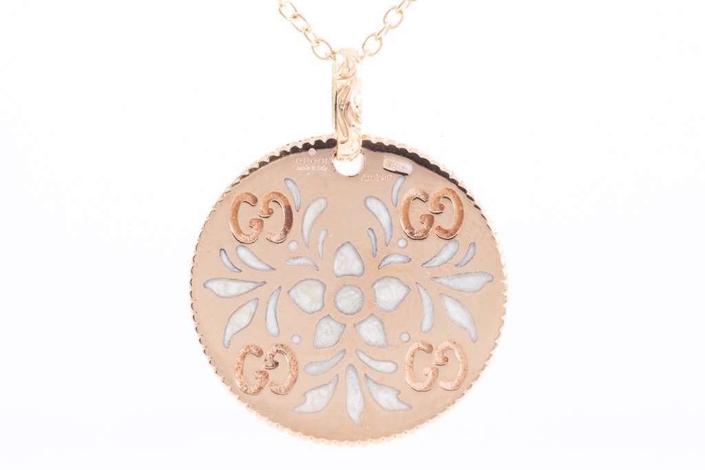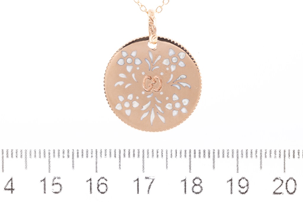 Gucci Icon Bloom necklace with enameled motifs. 18ct rose gold. With adjustable 50cm 18ct rose gold chain. Made in Italy. Weight: 7.6g. With Gucci box & pouch. (Pre-owned)