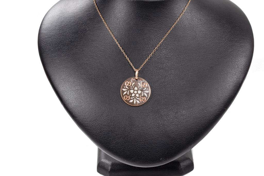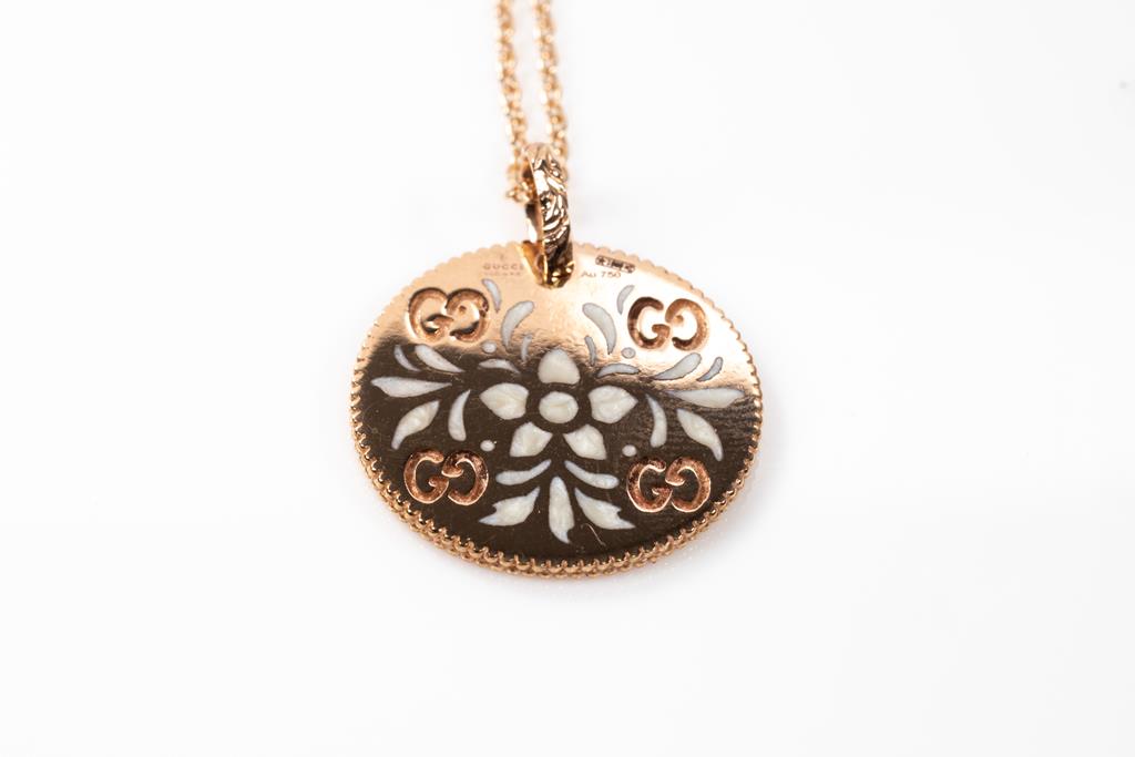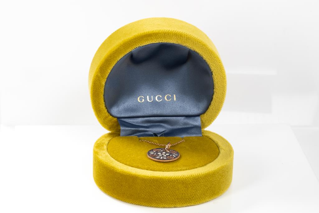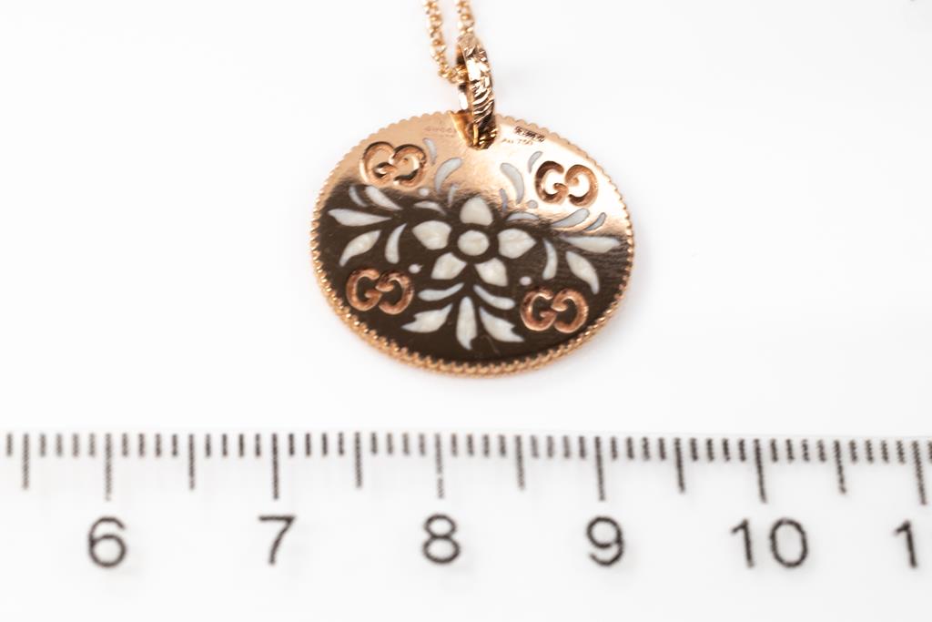 Gucci Icon Bloom necklace with enameled motifs. 18ct rose gold. With adjustable 50cm 18ct rose gold chain. Made in Italy. Weight: 7.4g. With Gucci box. (Pre-owned)