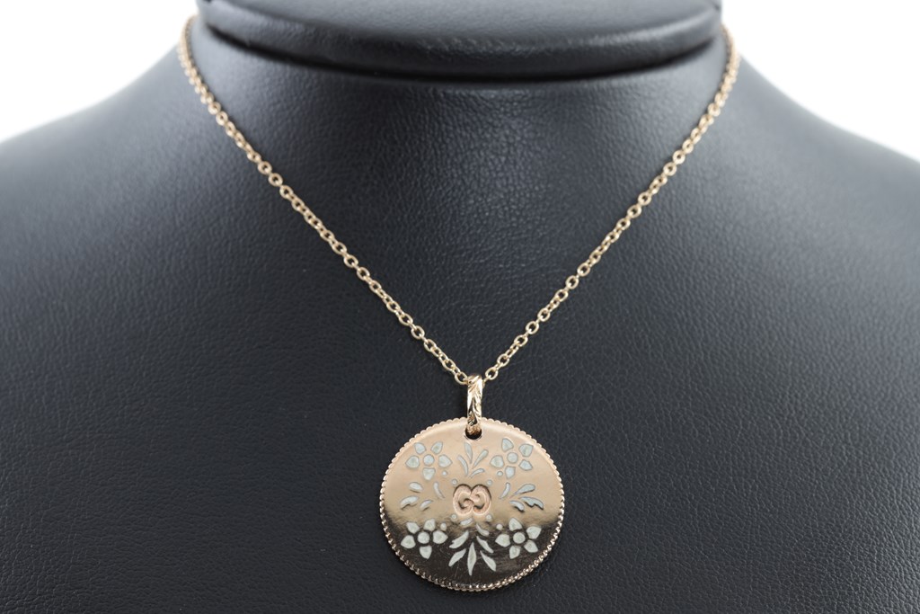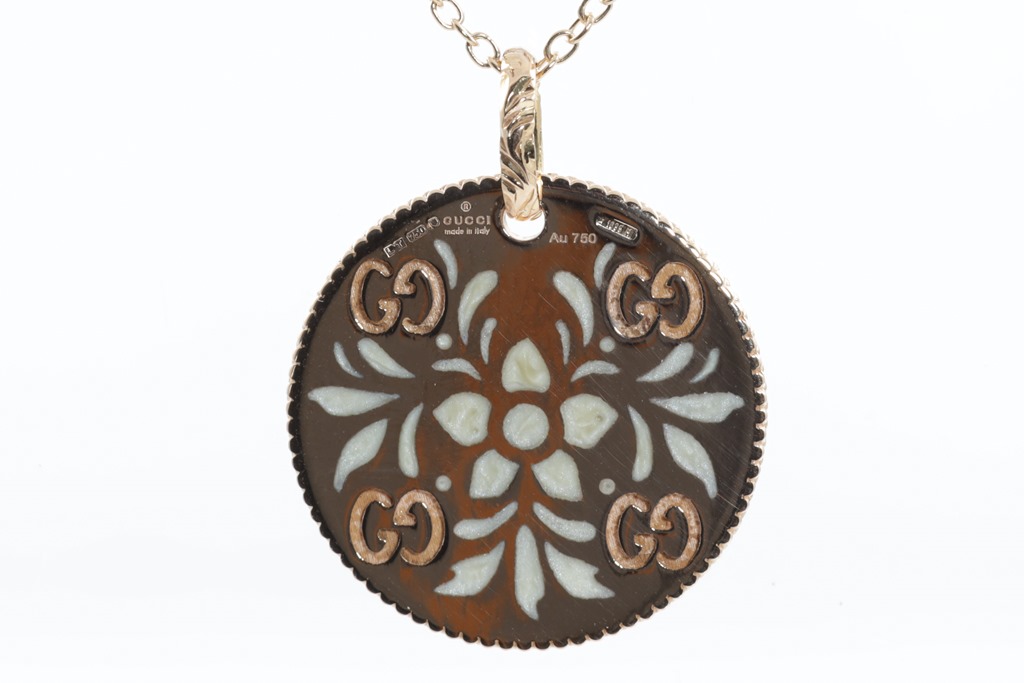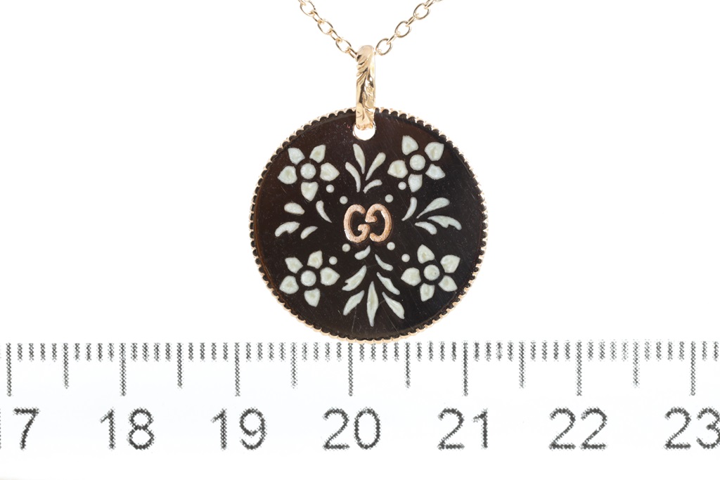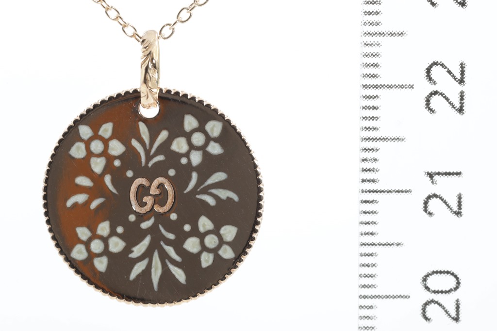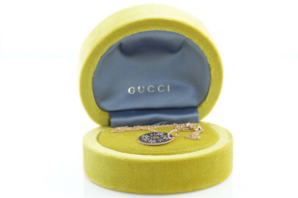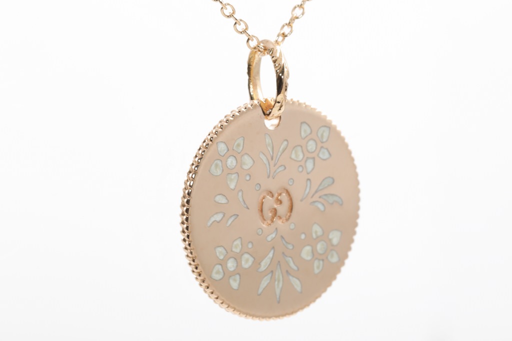 Gucci Icon Bloom necklace with enameled motifs. 18ct rose gold. With adjustable 50cm chain. Made in Italy. Weight: 7.4g. With Gucci box & pouch. (Pre-owned)