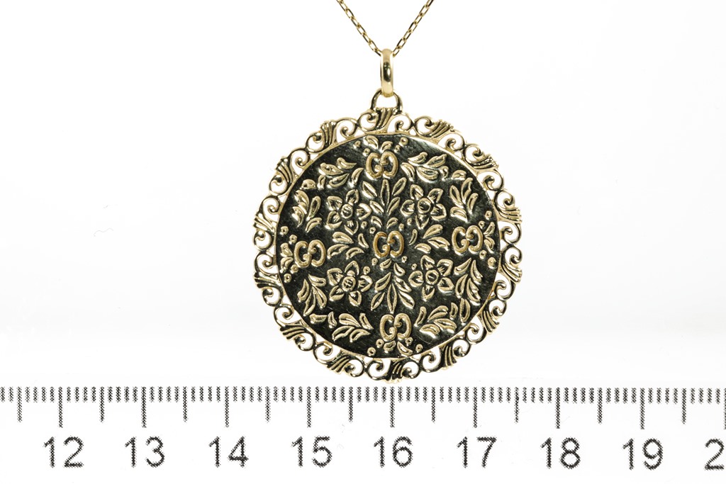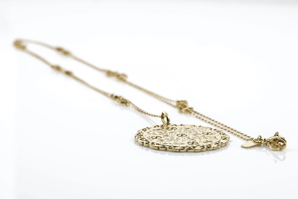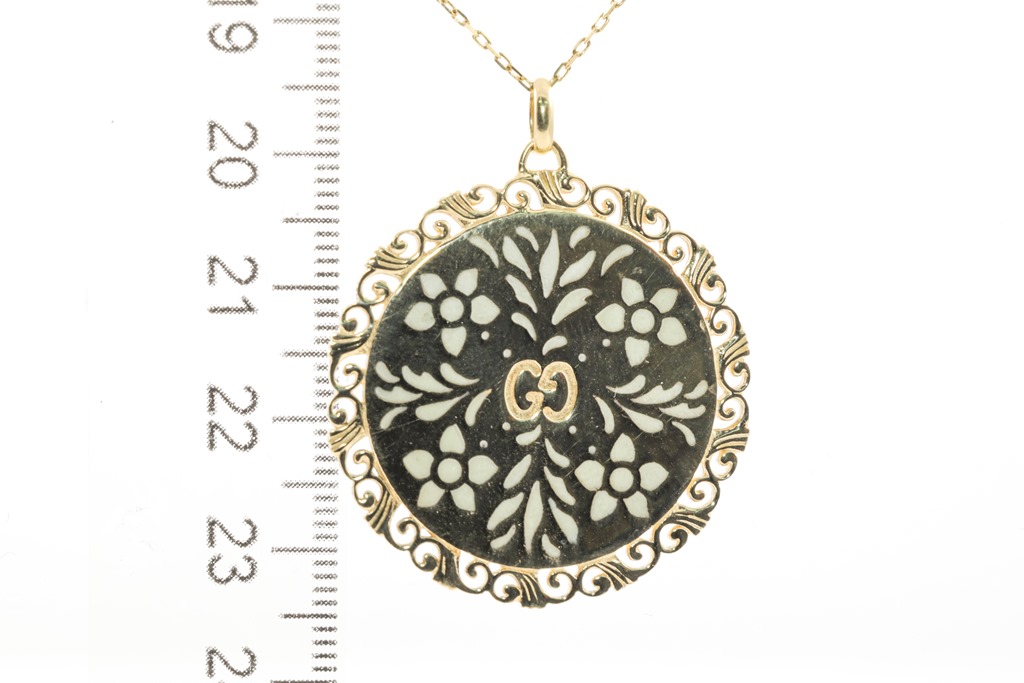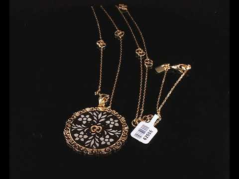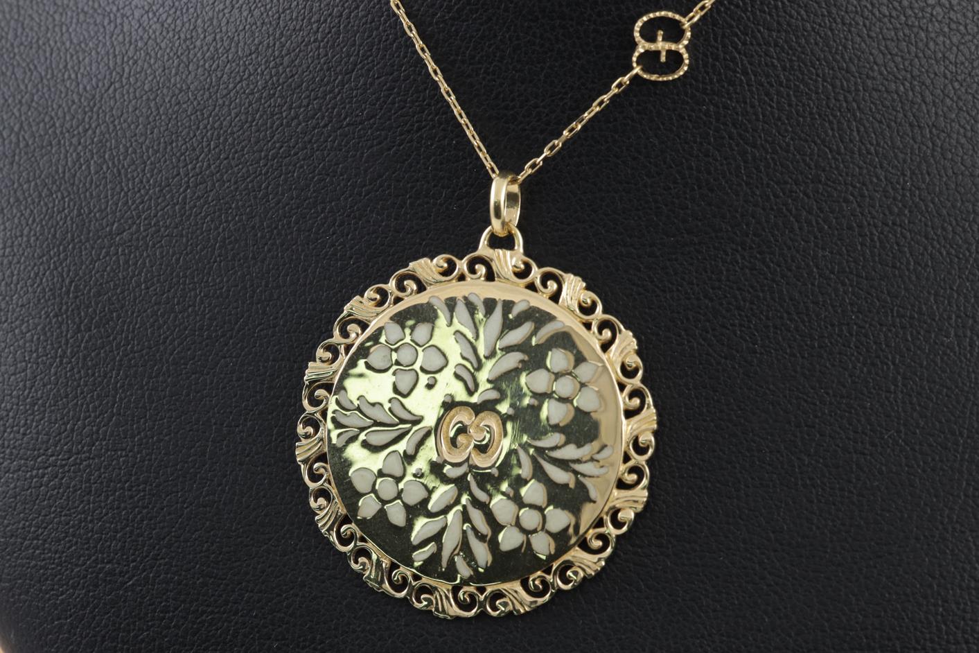 Gucci Icon Bloom Mystic necklace with white enameled motifs. 18ct yellow gold. With 80cm chain. Made in Italy. Weight: 19.2g. With Gucci box & pouch. (Pre-owned)