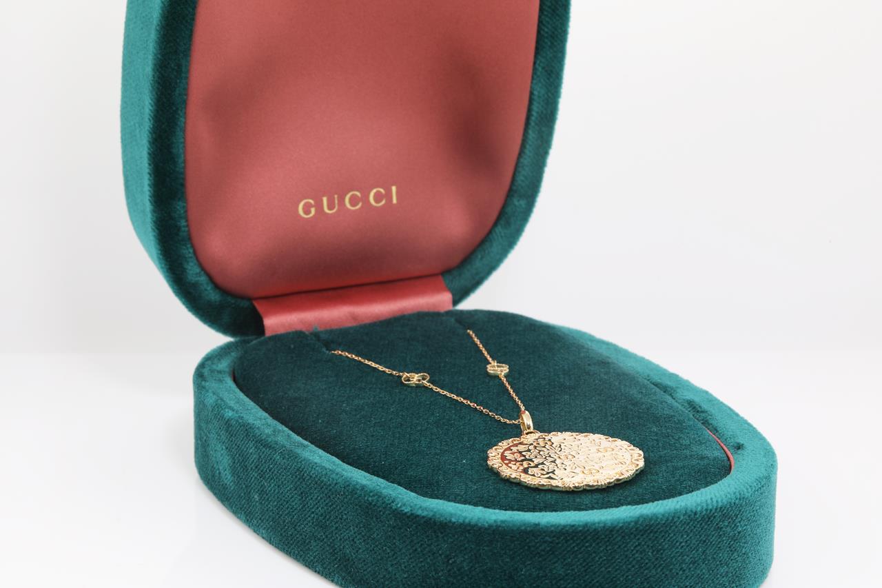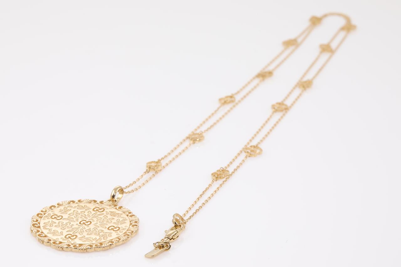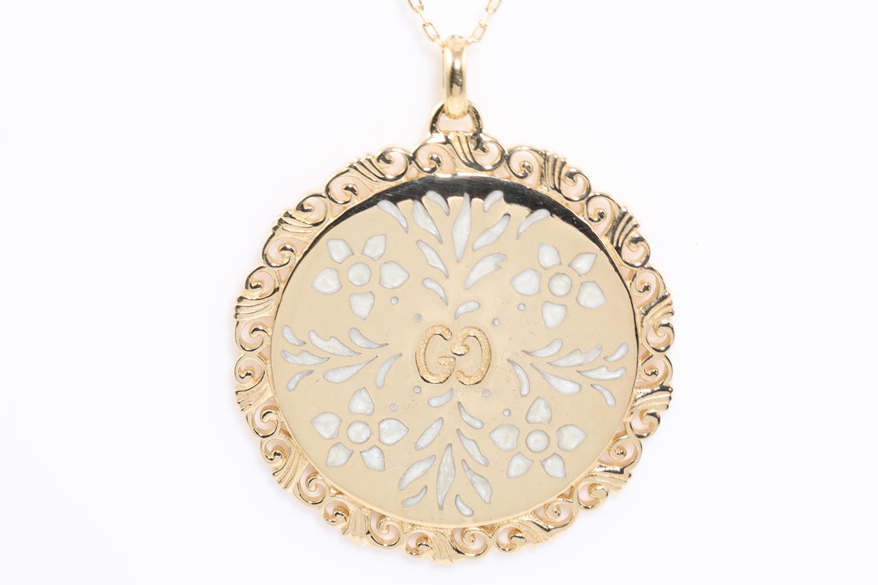 Gucci Icon Blooms Mystic white enamel necklace. Made in Italy. 18ct yellow gold. Length: 60cm. Weight: 20.7g. With Gucci box. With certificate #414627. (Pre-owned)