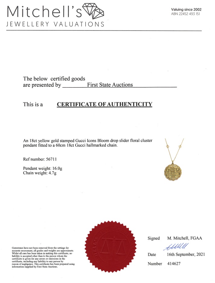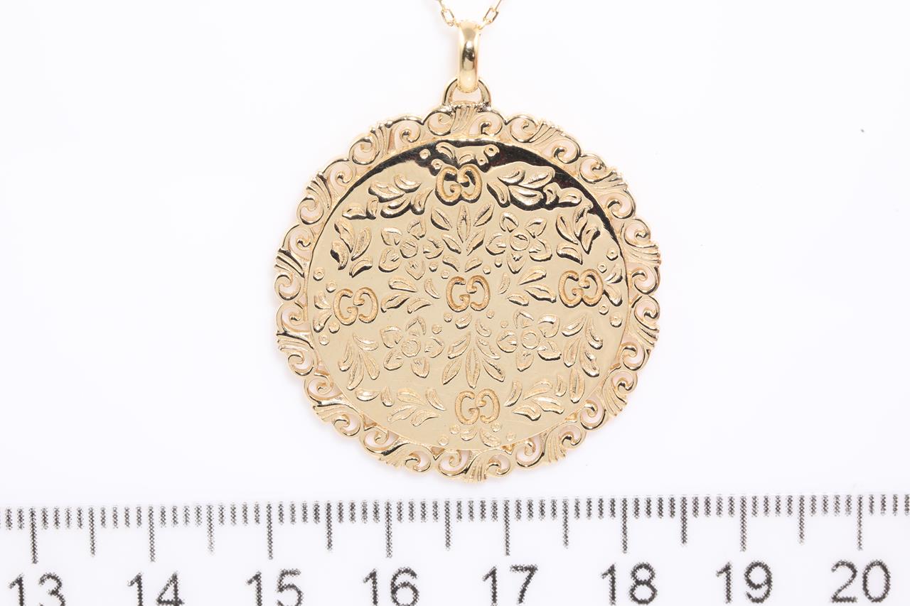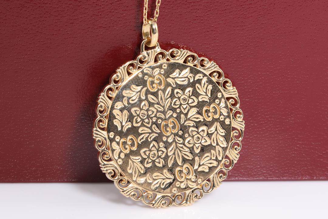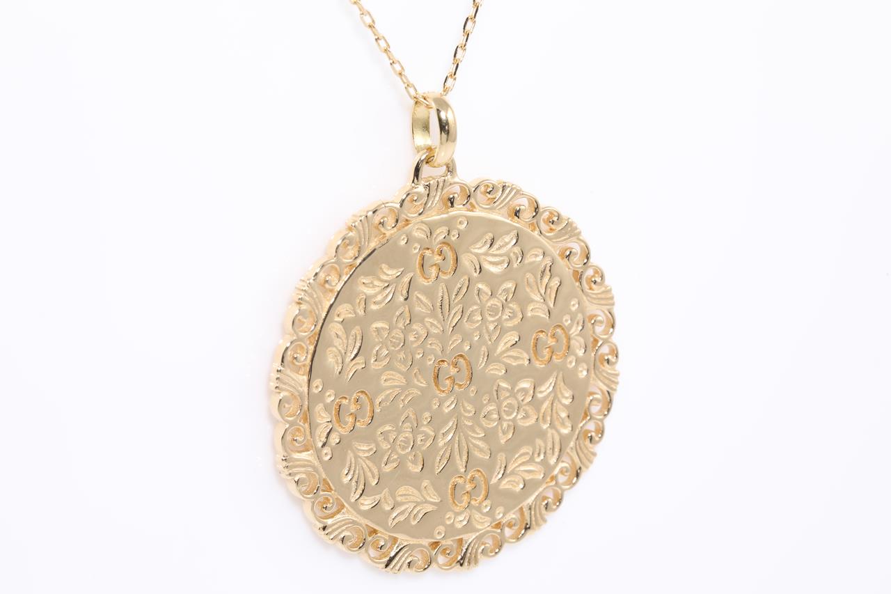 Gucci Icon Blooms Mystic white enamel necklace. Made in Italy. 18ct yellow gold. Length: 60cm. Weight: 20.7g. With Gucci box. With certificate #414627. (Pre-owned)