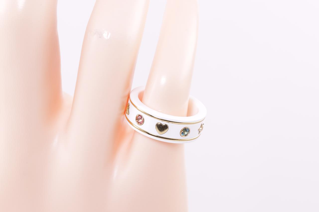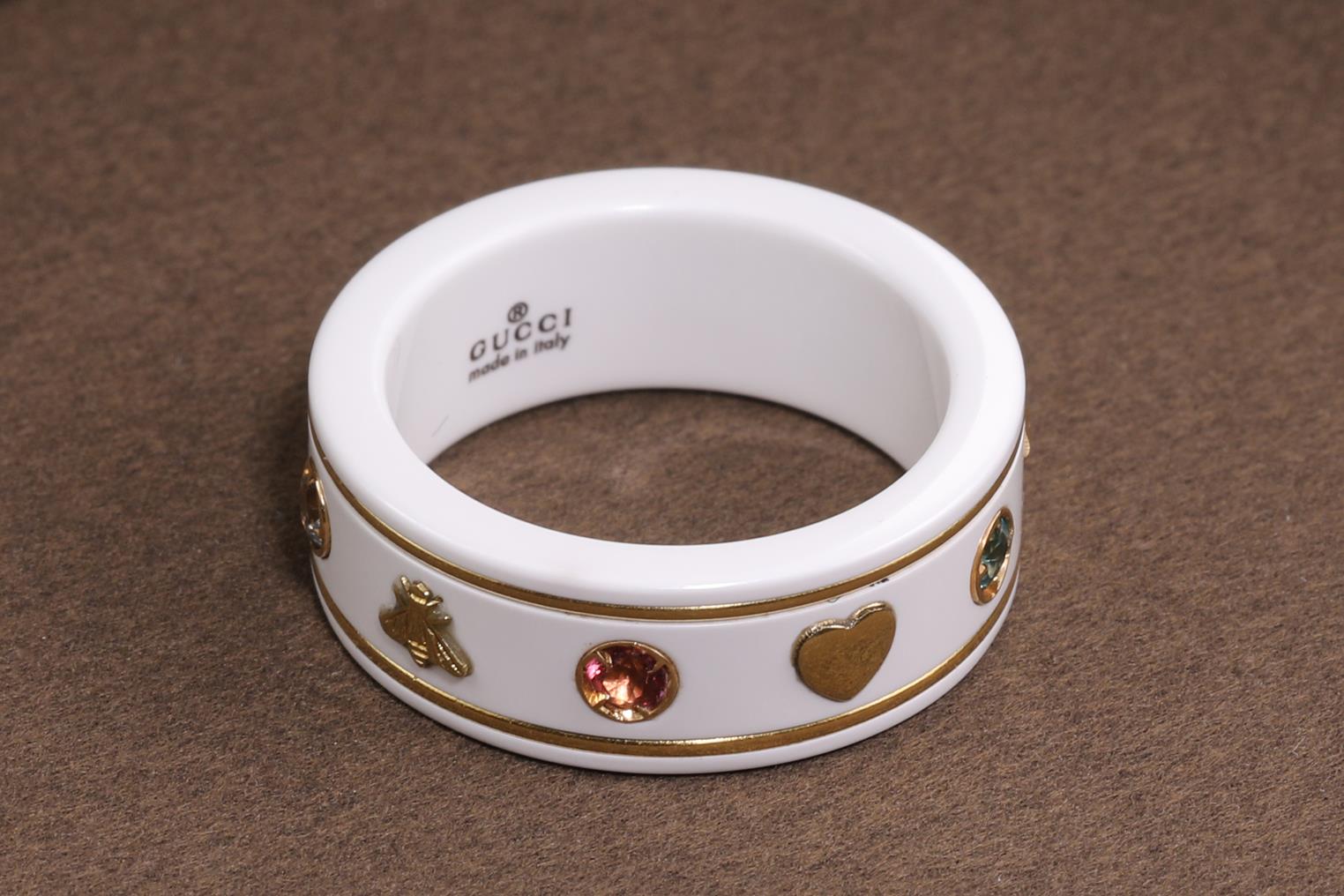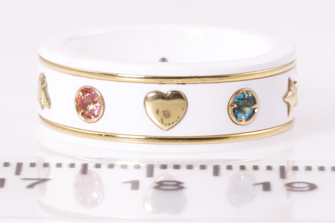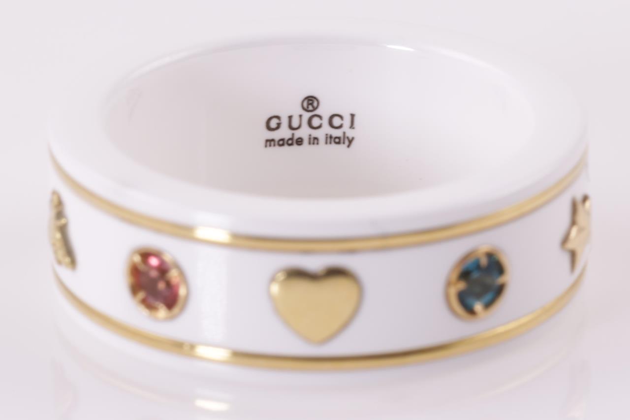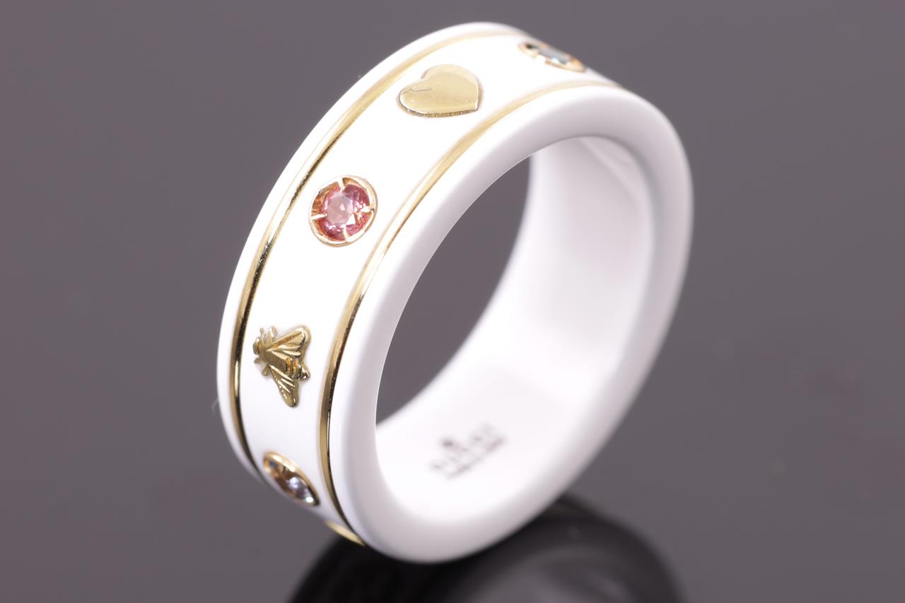 Gucci Icon ring with red, honey, pink & green topaz. Planet, bee, star and interlocking G motifs. Width 7mm. Made in Italy. 18ct yellow gold with white zirconia band. Gucci size 10, J - ring resizing is not recommended. Weight: 5g. With Gucci box. (Pre-owned)