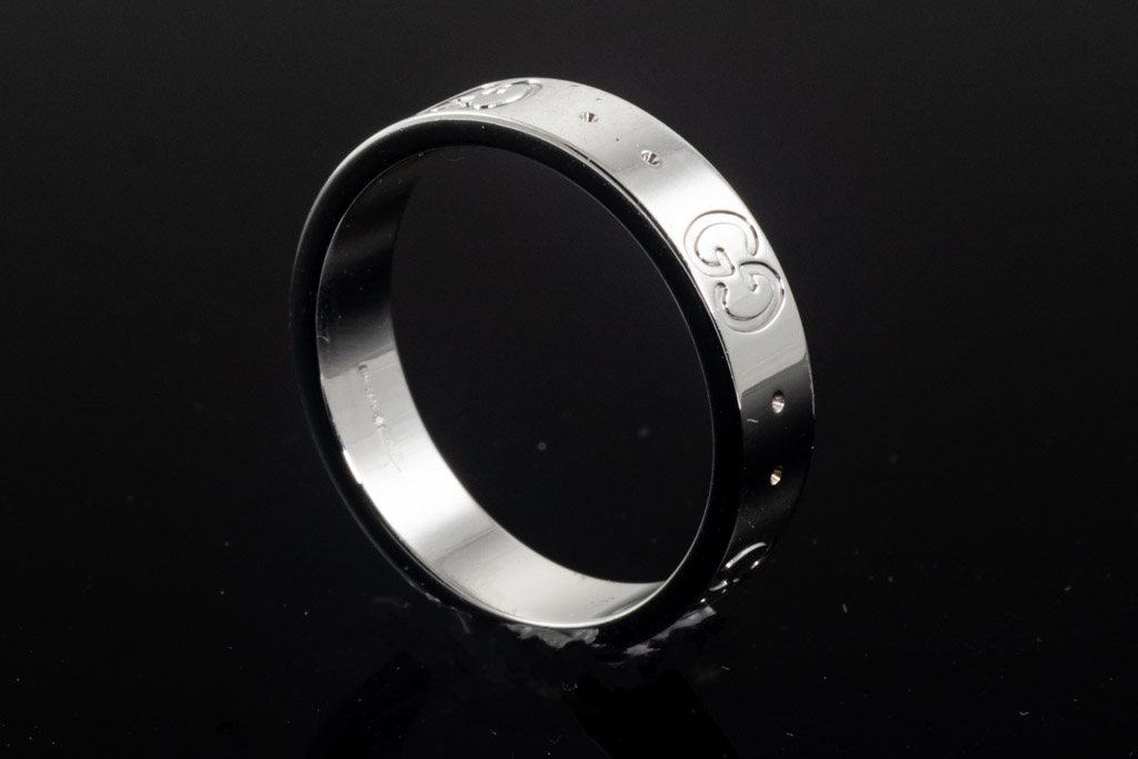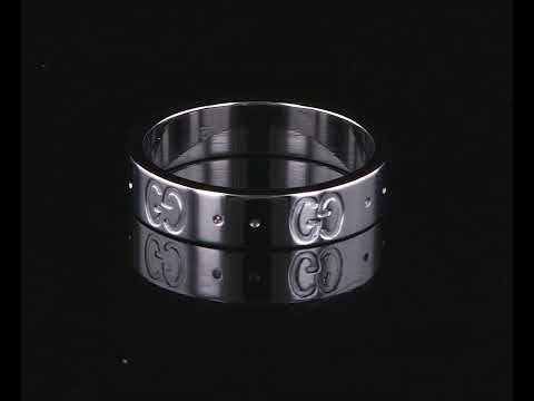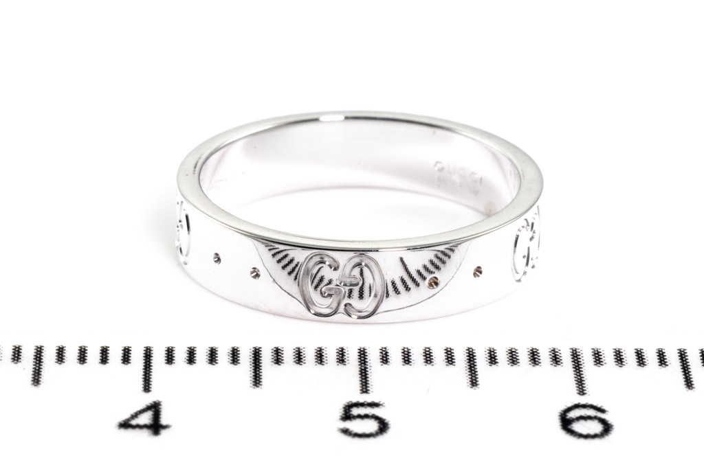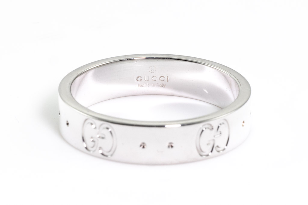Gucci Icon thin band ring. 18ct white gold. Gucci stamped size 6, I1/2 - ring resizing is not recommended. Width: 4mm. Made in Italy. Weight: 3.7g. (Pre-owned)