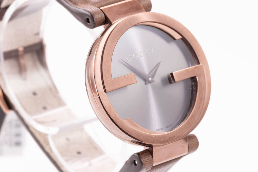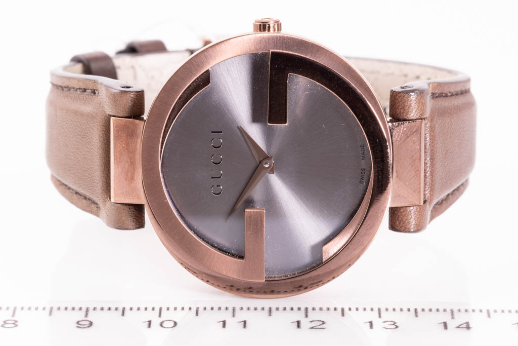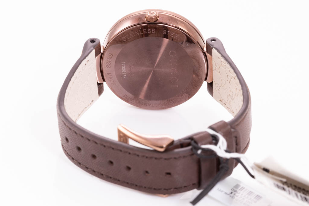 Gucci Interlocking G fixed brown PVD stainless steel quartz ladies watch. Brown dial, case diameter: 37mm, strap length: 18.5cm, Swiss made. Ref# YA133309. With Gucci brown strap and buckle. 3 month FSA warranty. With Gucci International Warranty Certificate - the certificate is not stamped so Gucci warranty does not apply. With Gucci box. (As new, NOTE: minor scratches on case and wear on strap due to being display stock)