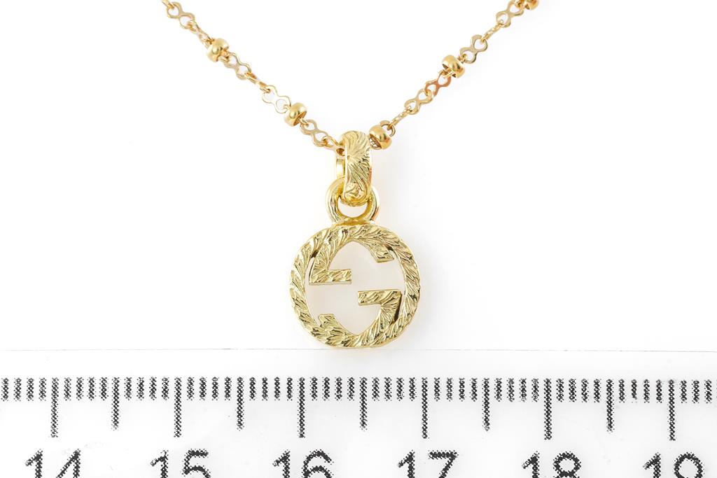 Gucci Interlocking G monogram pendant with an intricate Arabesque style engraving. Made in Italy. 18ct yellow gold with 42cm chain. Weight: 6.3g. With Gucci box. (Pre-owned)