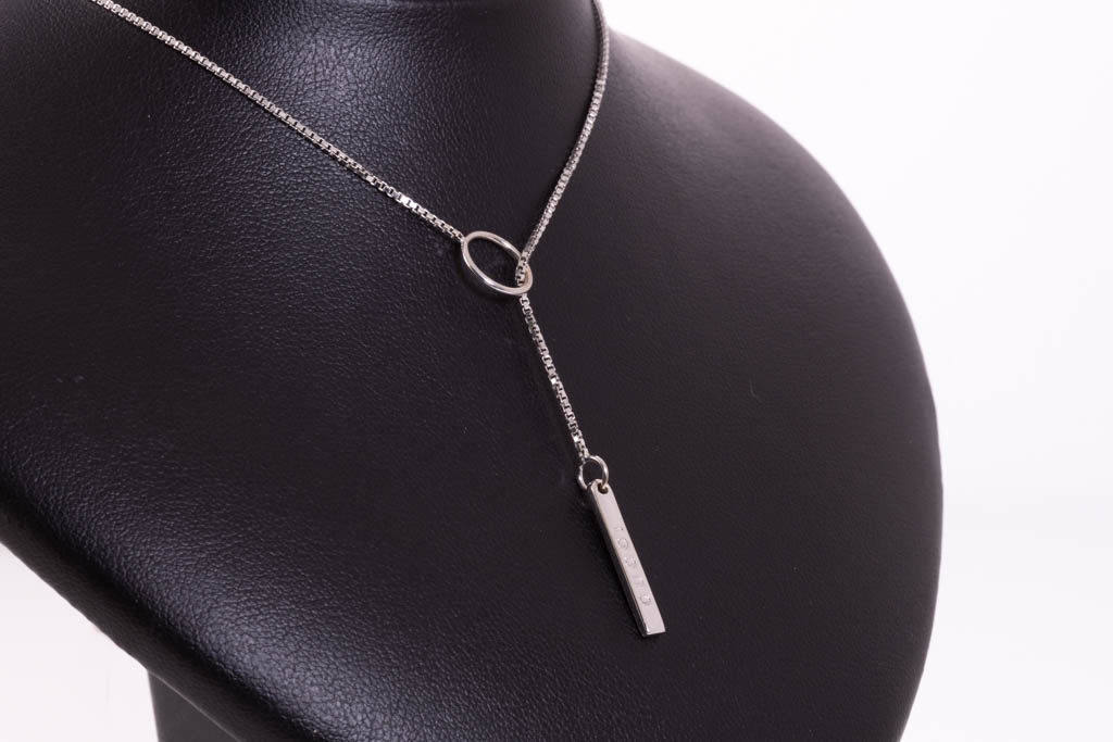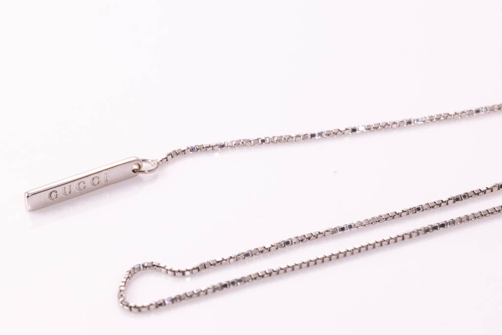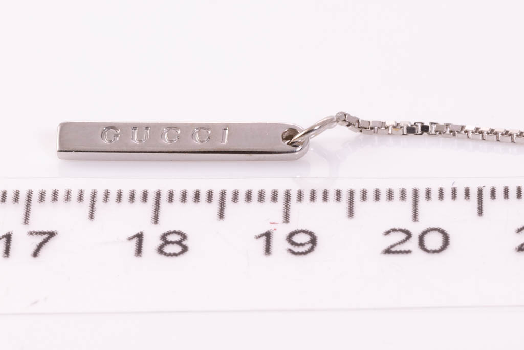Gucci Lariat necklace. Bar pendant with 'Gucci' engraving. 18ct white gold. Circular sliding fastener. Length: 54cm. Weight: 5.4g. Made in Italy. With Gucci box. (Pre-owned)