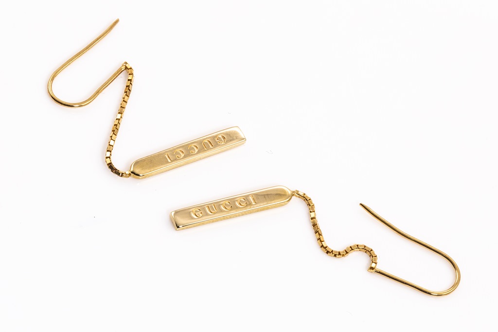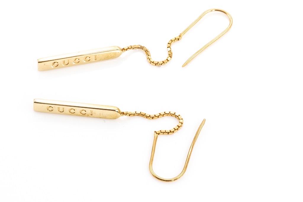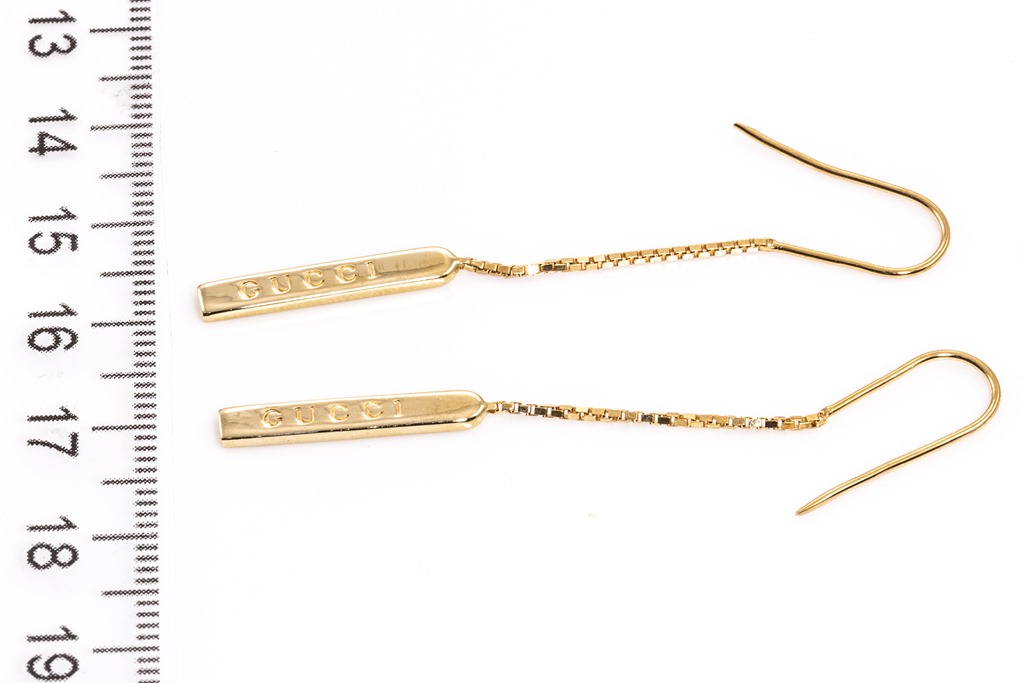 Gucci Link to love chain earrings. Bar pendant with 'Gucci' engraving. 18ct yellow gold. Weight: 3.6g. Made in Italy. (Pre-owned)