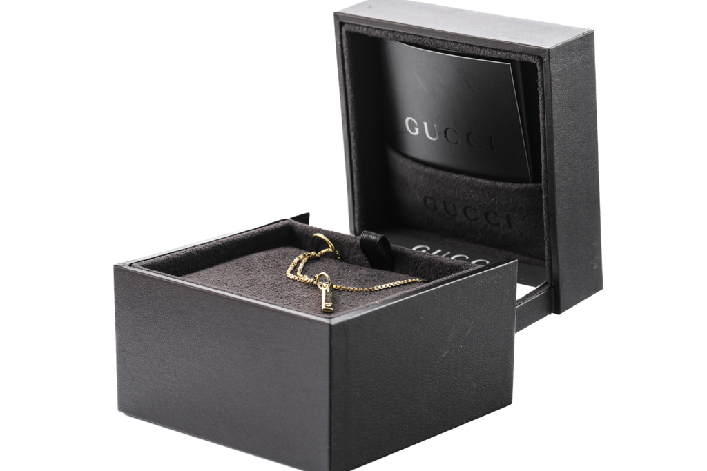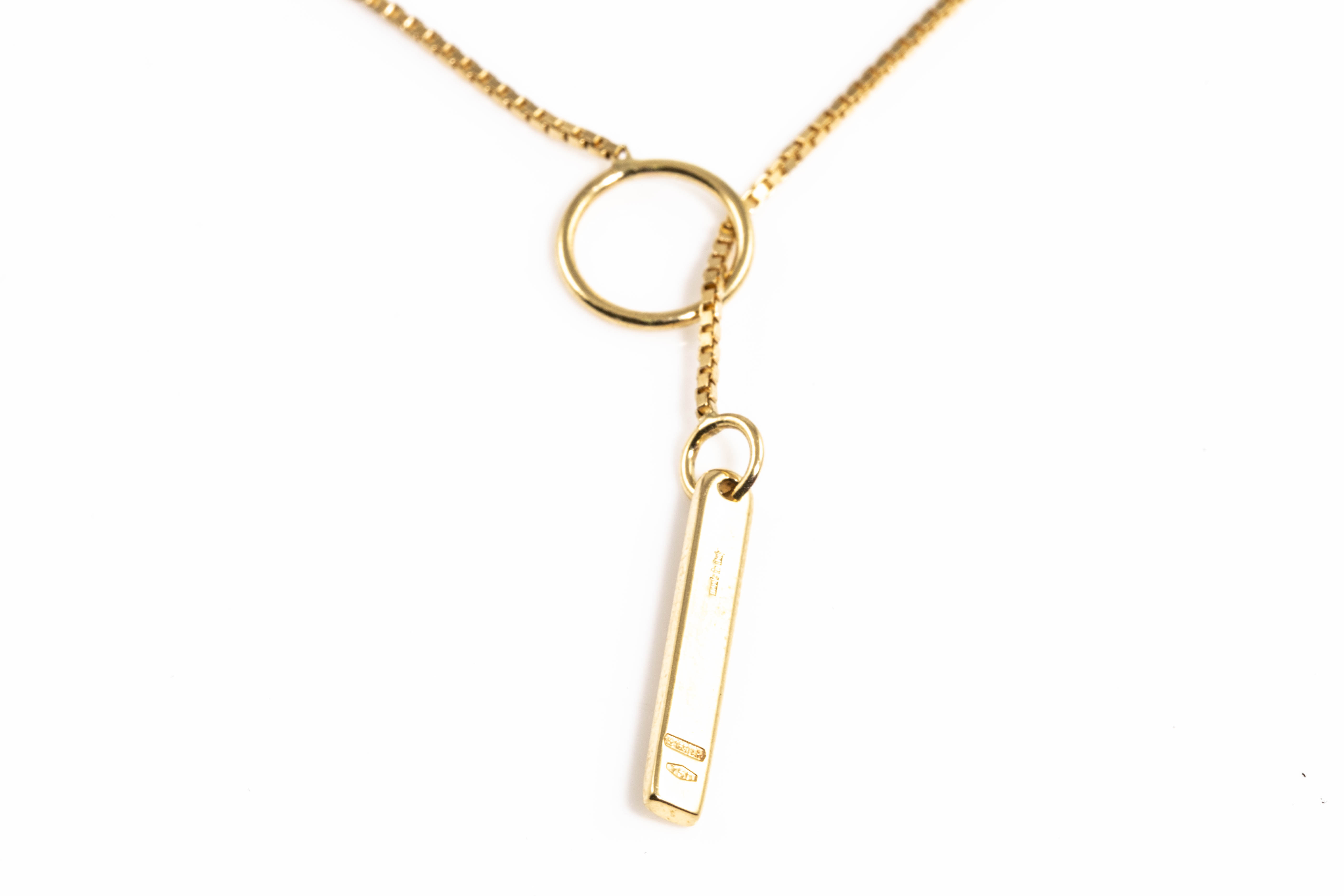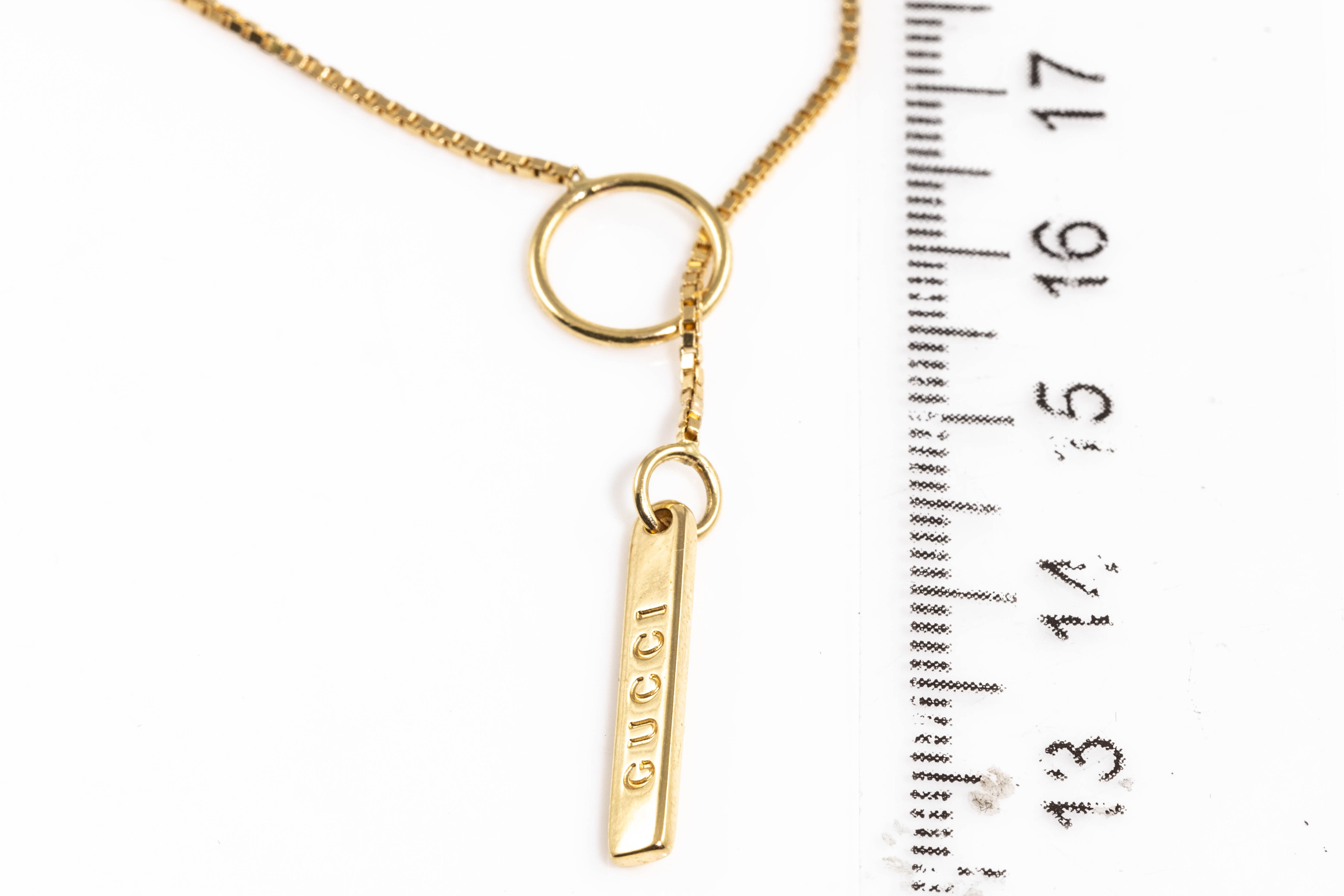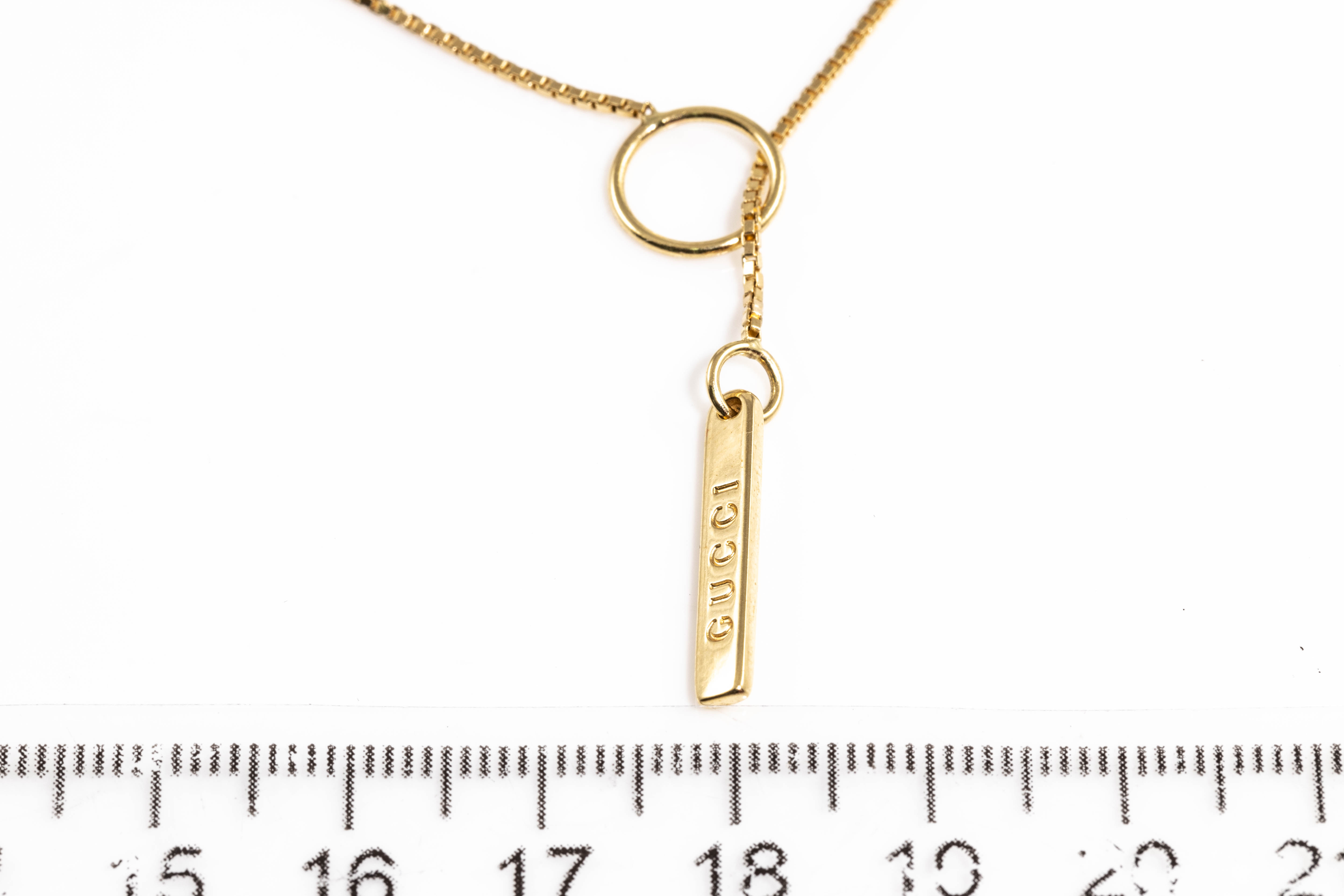 Gucci Link to Love lariat necklace. Bar pendant with 'Gucci' engraving. 18ct yellow gold. Circular sliding fastener. Made in Italy. Length: 55cm. Weight: 5.4g. With Gucci box. (Pre-owned)