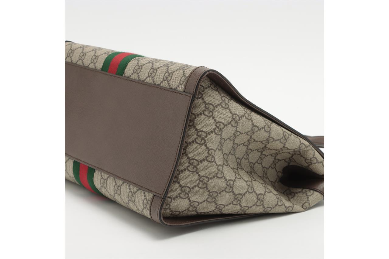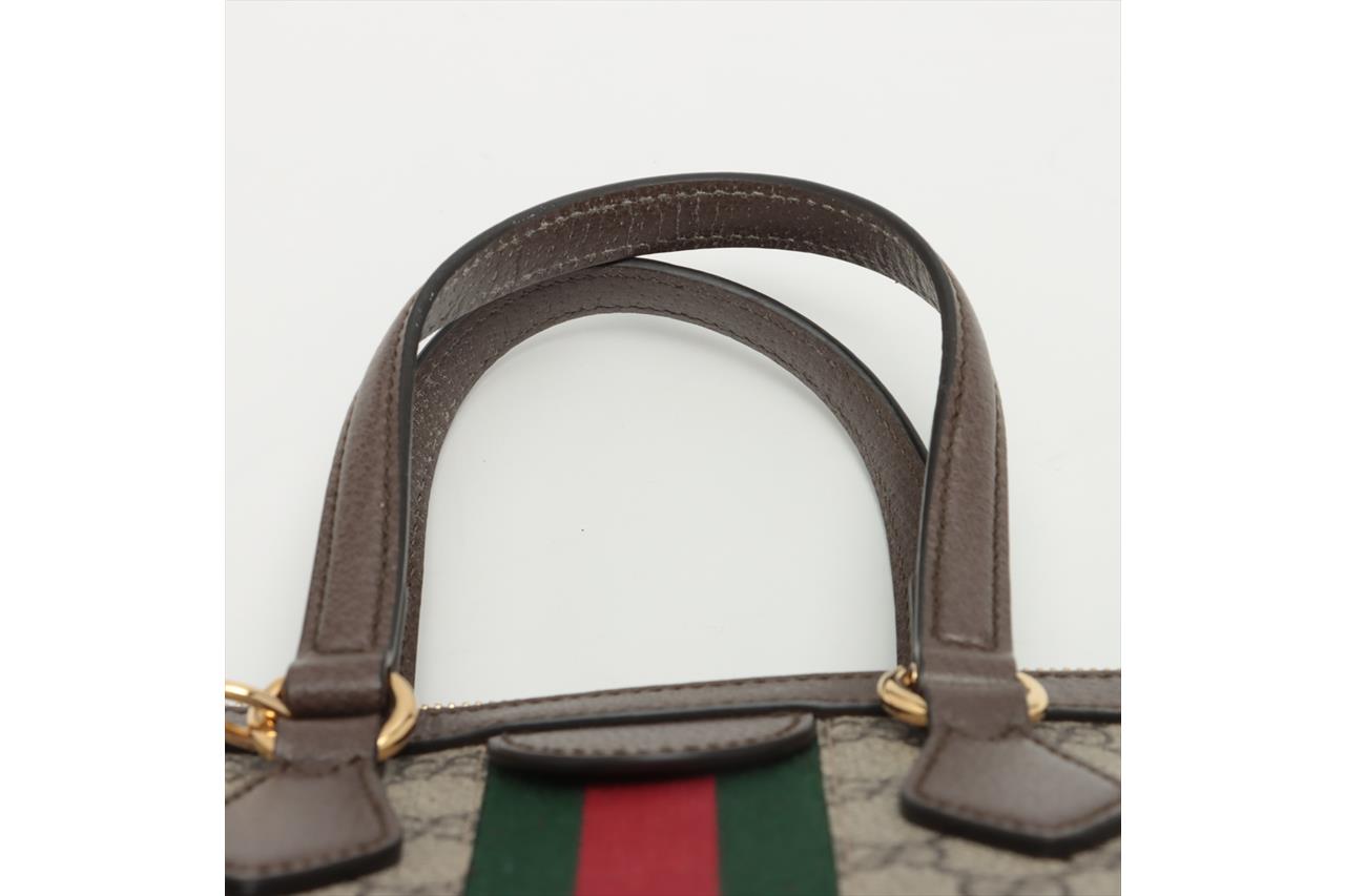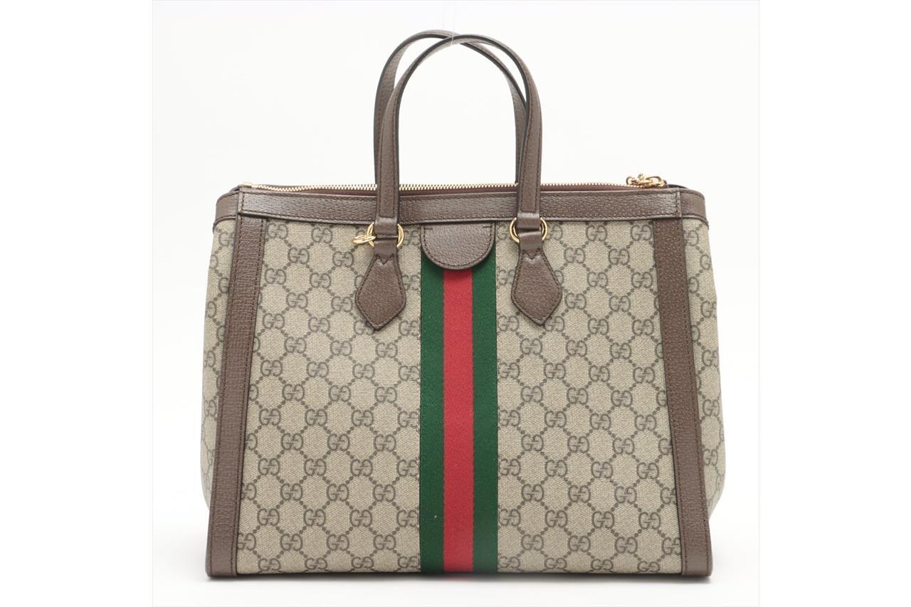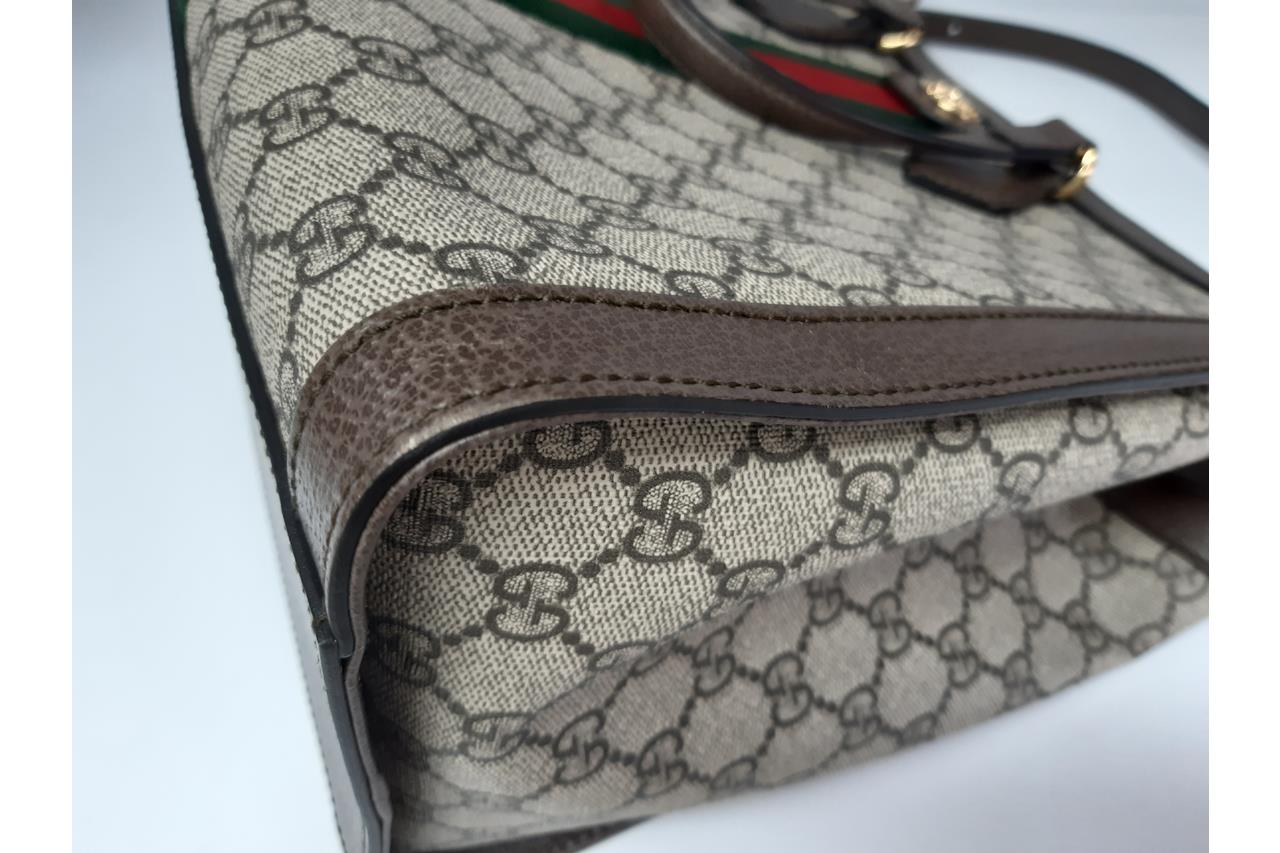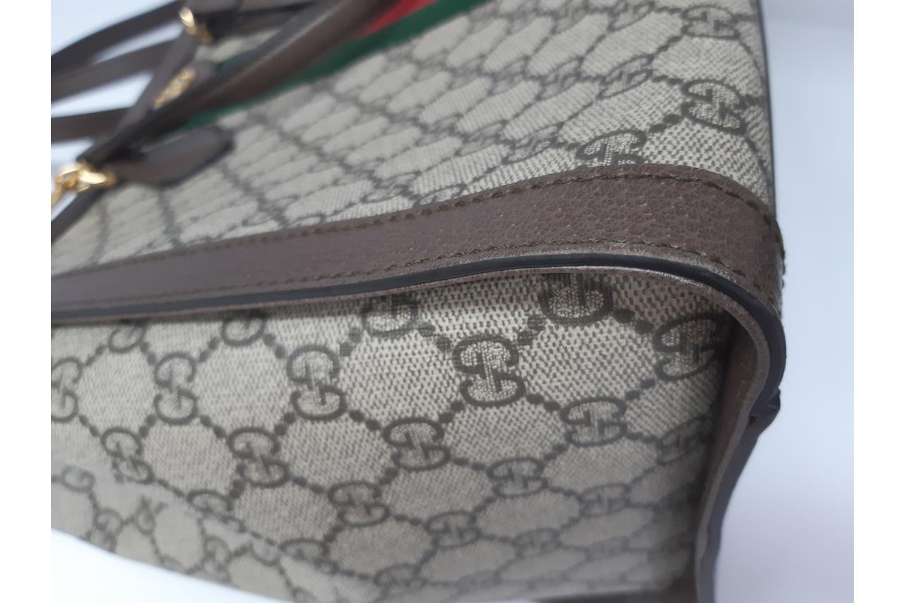 Gucci Ophidia GG medium tote bag in beige/ebony GG Supreme canvas with brown leather trim. Gold-toned hardware, double G logo detail at front, zipper puller closure on top, this opens to a beige microfibre lined interior with patch/zipped pockets. Approximate dimensions: 32.5cm(L) x 25.5cm(H) x 17.5cm(D), 10cm handle drop and 62cm(max) detachable and adjustable strap drop. Accompanied by Gucci dusts bag. With Entrupy Certificate of Authenticity. (Pre-owned)