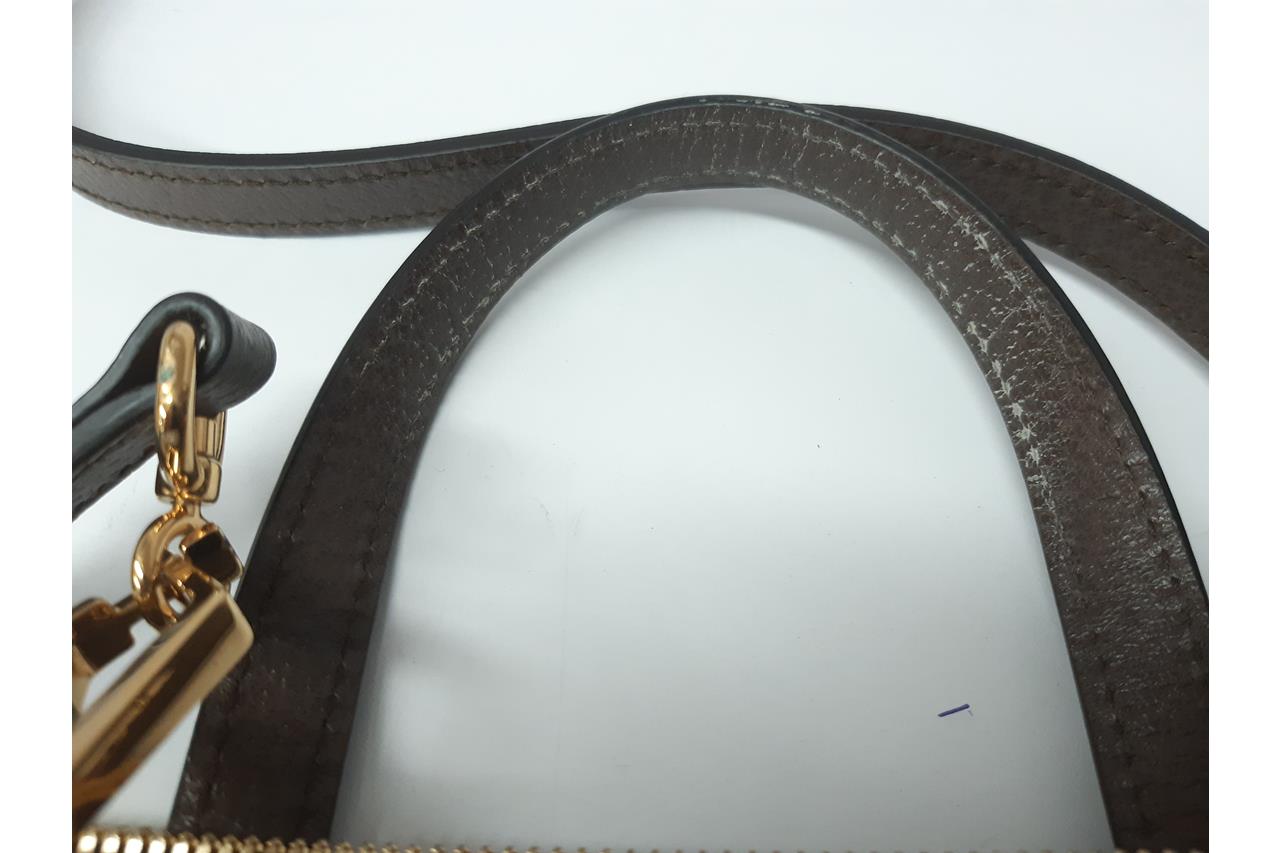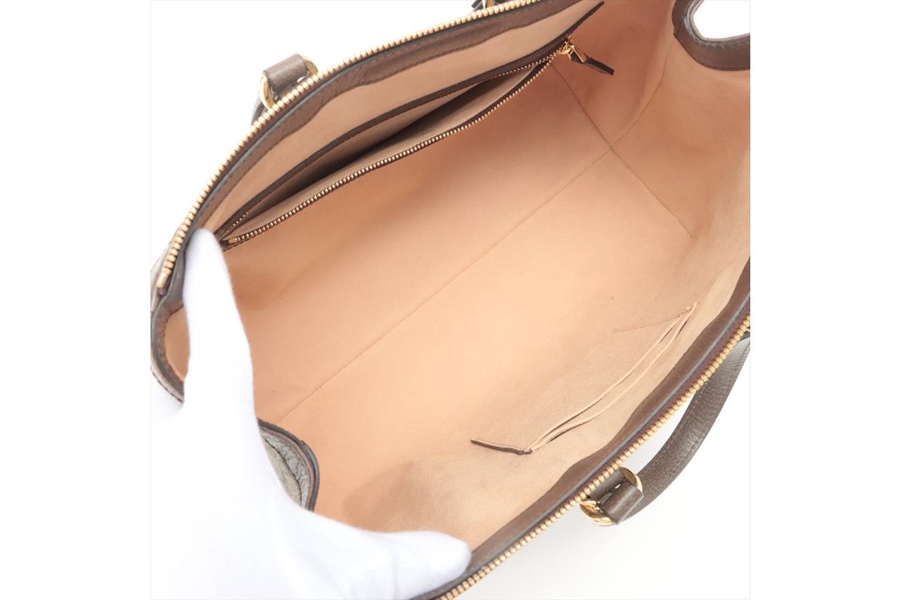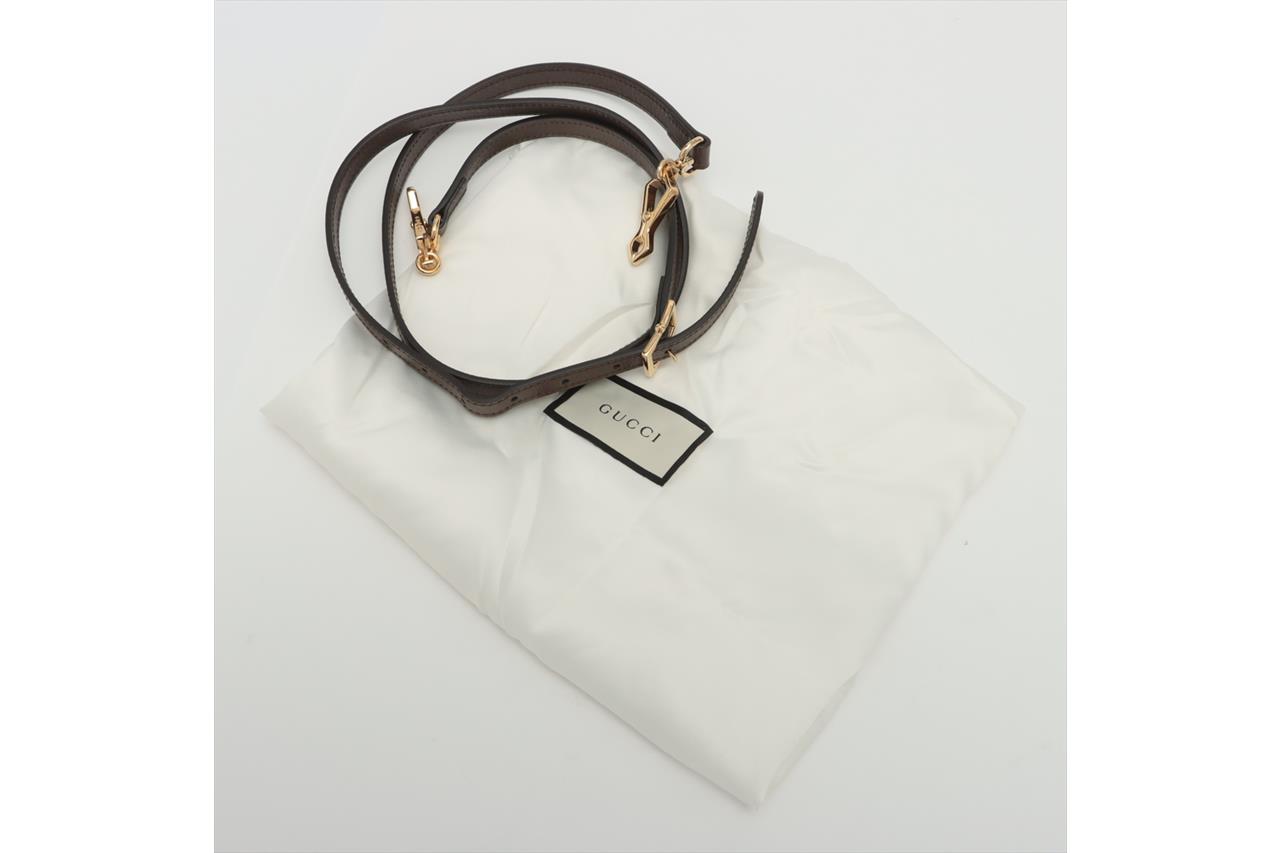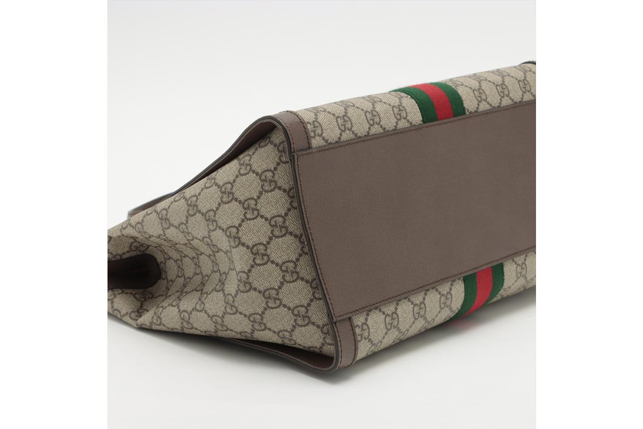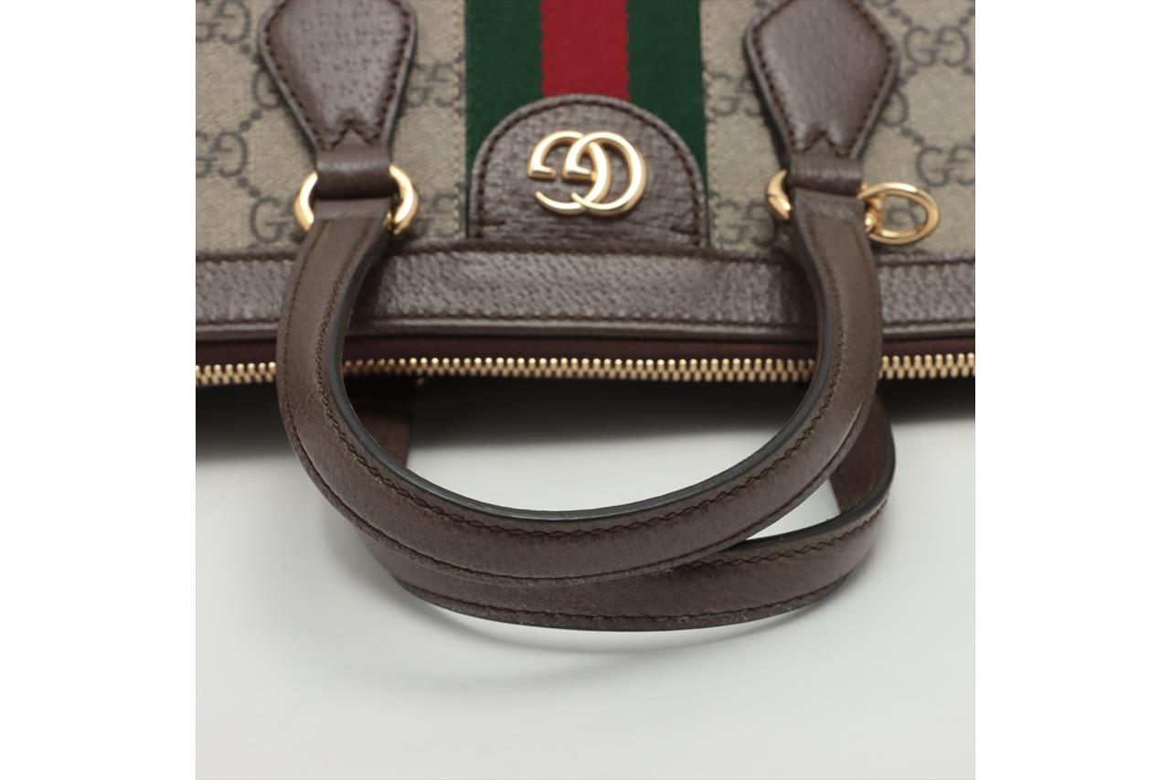 Gucci Ophidia GG medium tote bag in beige/ebony GG Supreme canvas with brown leather trim. Gold-toned hardware, double G logo detail at front, zipper puller closure on top, this opens to a beige microfibre lined interior with patch/zipped pockets. Approximate dimensions: 32.5cm(L) x 25.5cm(H) x 17.5cm(D), 10cm handle drop and 62cm(max) detachable and adjustable strap drop. Accompanied by Gucci dusts bag. With Entrupy Certificate of Authenticity. (Pre-owned)